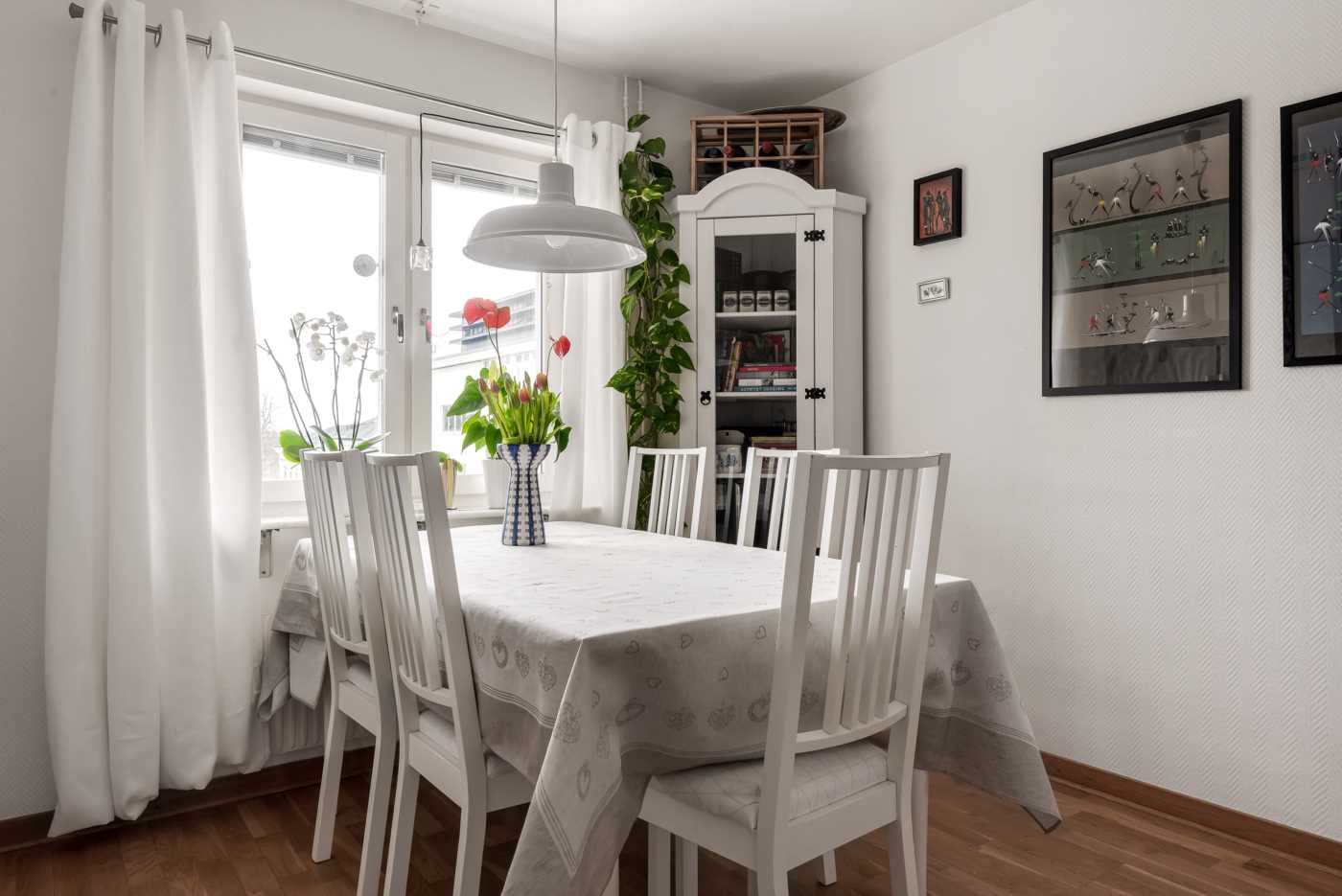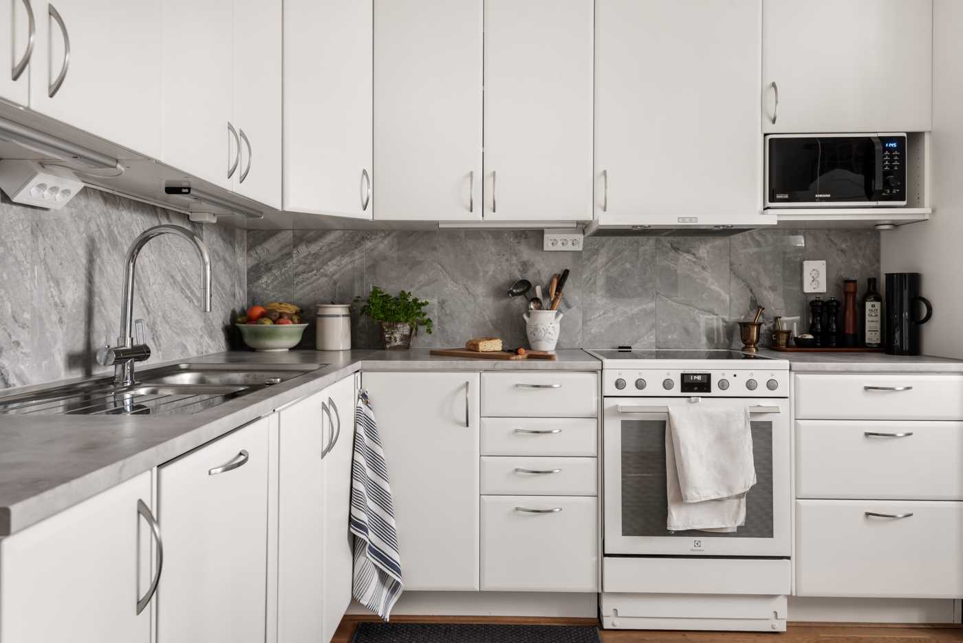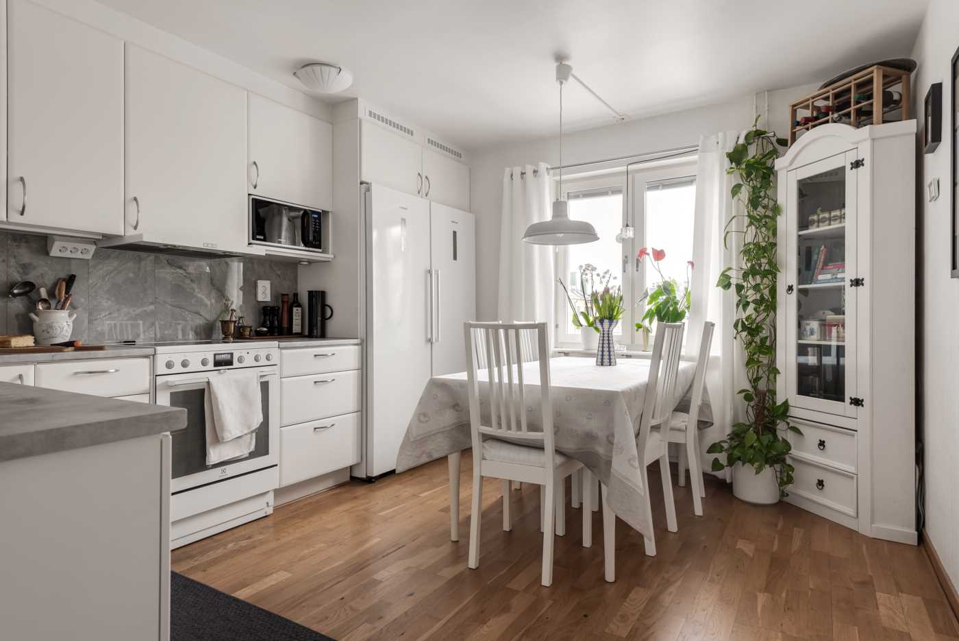 Rymligt kök med vita luckor från Härjedalskök. Bra arbetsyta i form av laminatbänkskiva. Vitvaror; Kyl, frys, spis, integrerad diskmaskin (Electrolux) samt fläkt (Franke). Matplats för 4-6 personer invid fönster som vetter mot innergården. Ekparkettgolv samt tapetserade väggar.