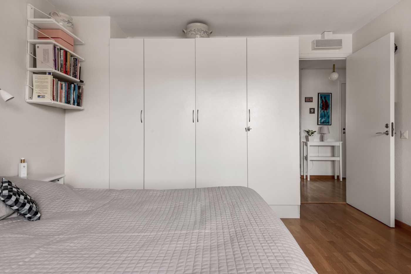 Större sovrummet med balkong där du njuter av eftermiddag- kvällssol, balkongen vetter mot innergården. I sovrummet finns 4 garderober för klädförvaring. Ekparkett samt tapetserade väggar. Sovrummen ligger separata i varsin del av lägenheten.