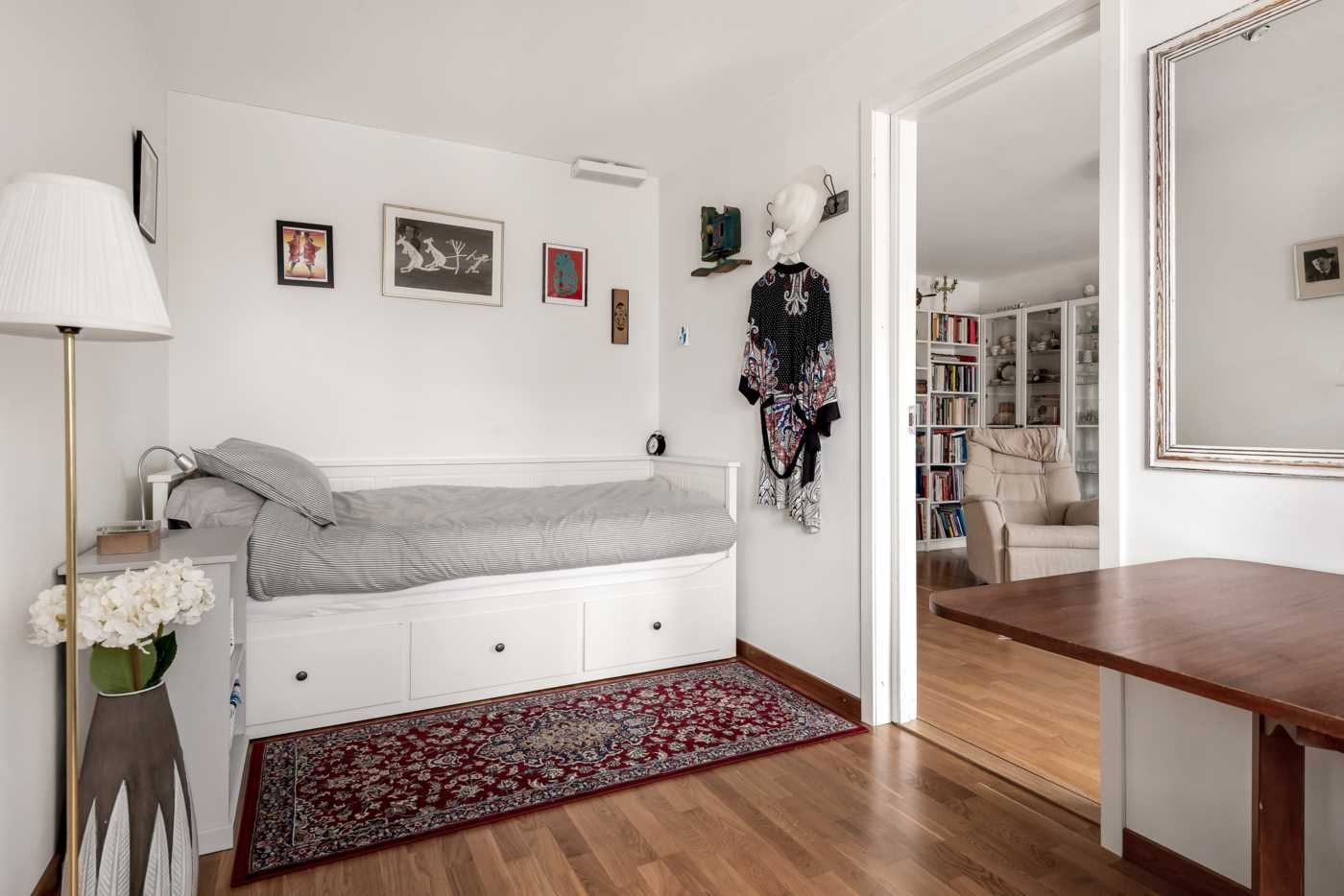 Bostaden andra sovrum med ingång från vardagsrummet. Tapetserade väggar.