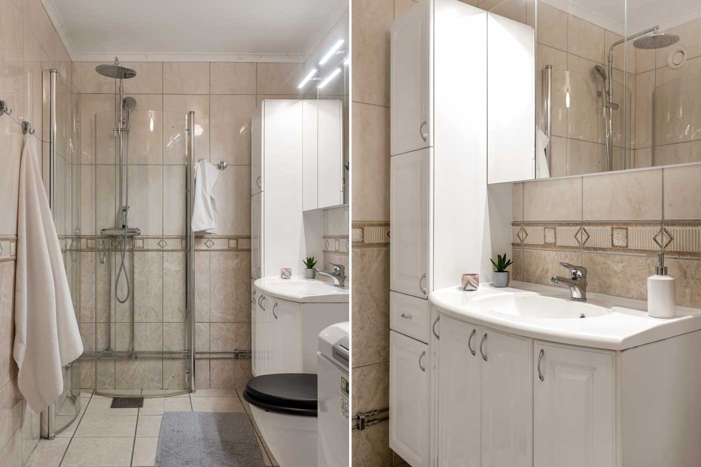 Helkalklat badrum med dusch, WC, handfat med kommod samt spegelskåp med belysning. Skåp för extra förvaring. Toppmatad tvättmaskin som förenklar vardagen. Golvvärme.