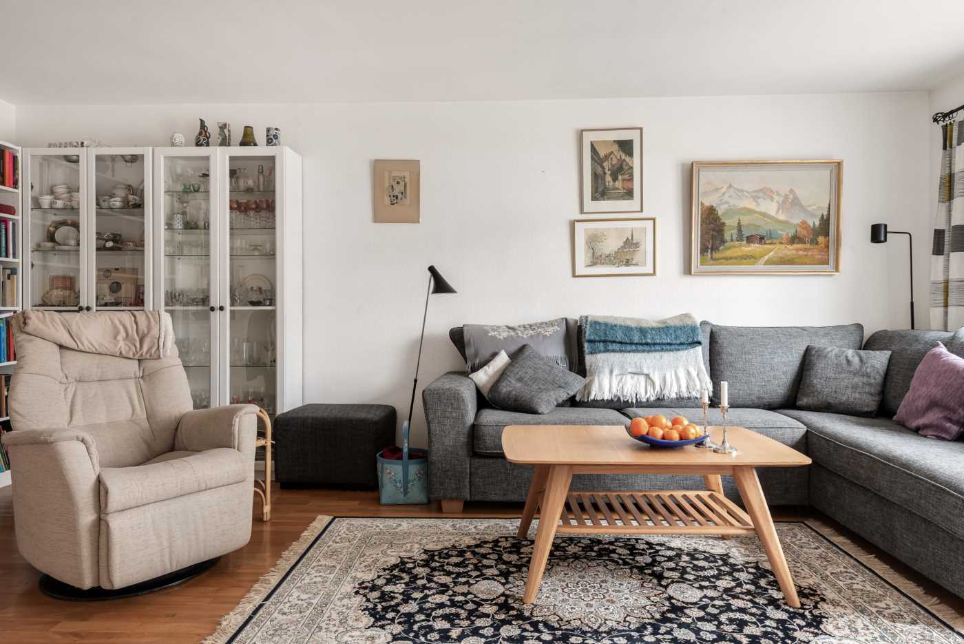 Mysigt vardagsrum med stora fönster, från soffan har du härlig utsikt mot domkyrkan. Här finns ekparkettgolv samt tapetserade väggar.