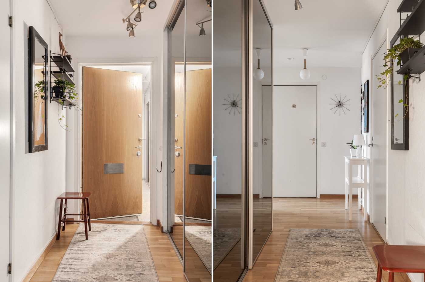 Trevlig hall med skjutdörrsgarderob. Ekparkett samt tapetserade väggar. Här finns en klädkammare för extra förvaring.