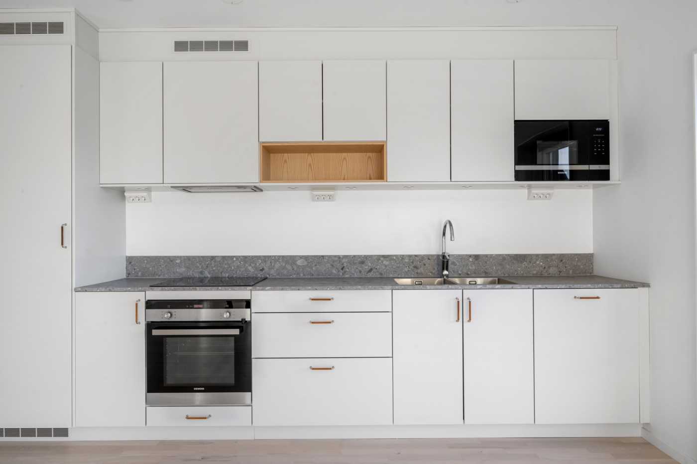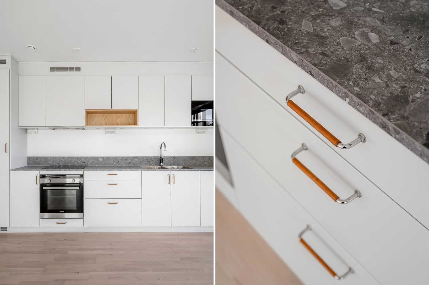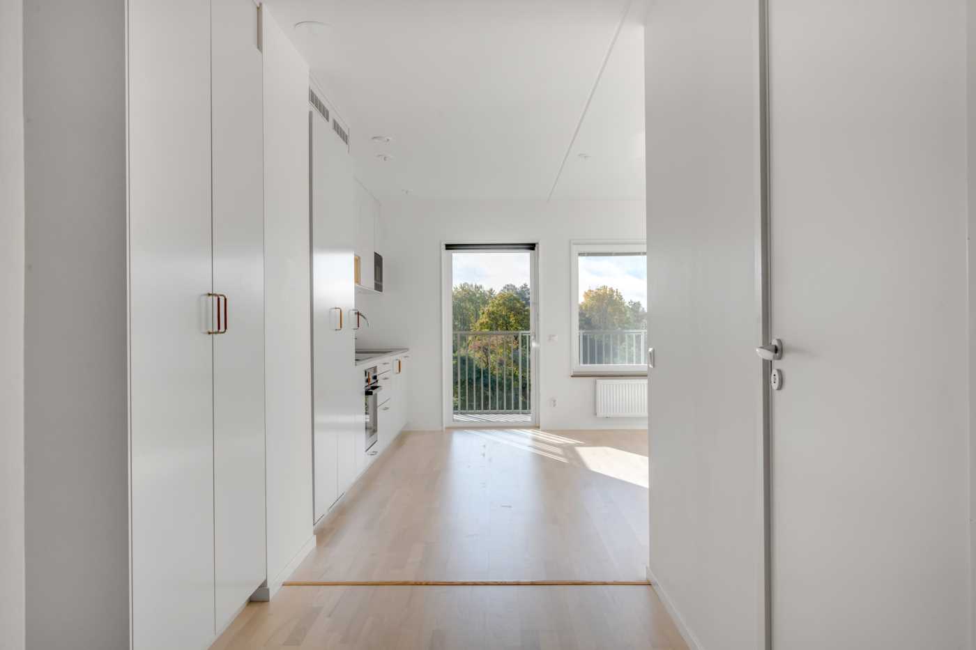 Bostaden har en sober inredning, som med ljusa mjuka toner och fina detaljer, skapar en sammanhållen och tidlös känsla. Redan i hallen möts du av en vacker vy mot grönskan utanför. Social och trivsam öppen planlösning där det stilrena köket är en naturlig del av inredningen i rummet. Köksluckorna från Ballingslöv har en pärlgrå nyans samt en öppen hylla/dekorskåp i askfanér. Väggskåpen har praktisk push open-funktion och bänkskåpen handtag med läderdetalj. Bänkskivan och stänkskydd är terrazzoinspirerad. Vitvarorna, med fullstor kyl och frys, inbyggd ugn och micro samt spishäll kommer från Siemens.