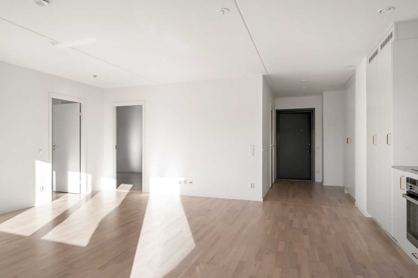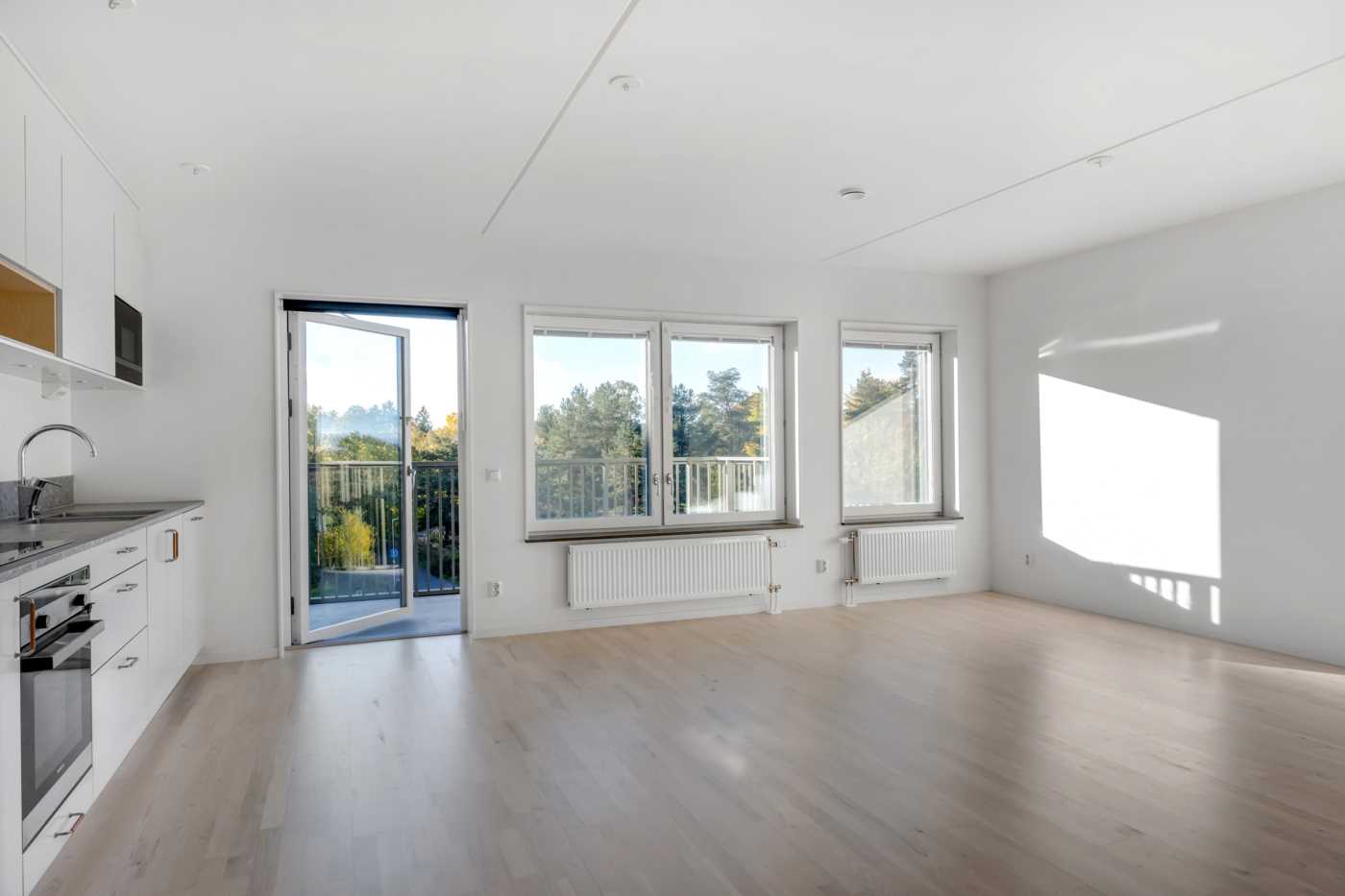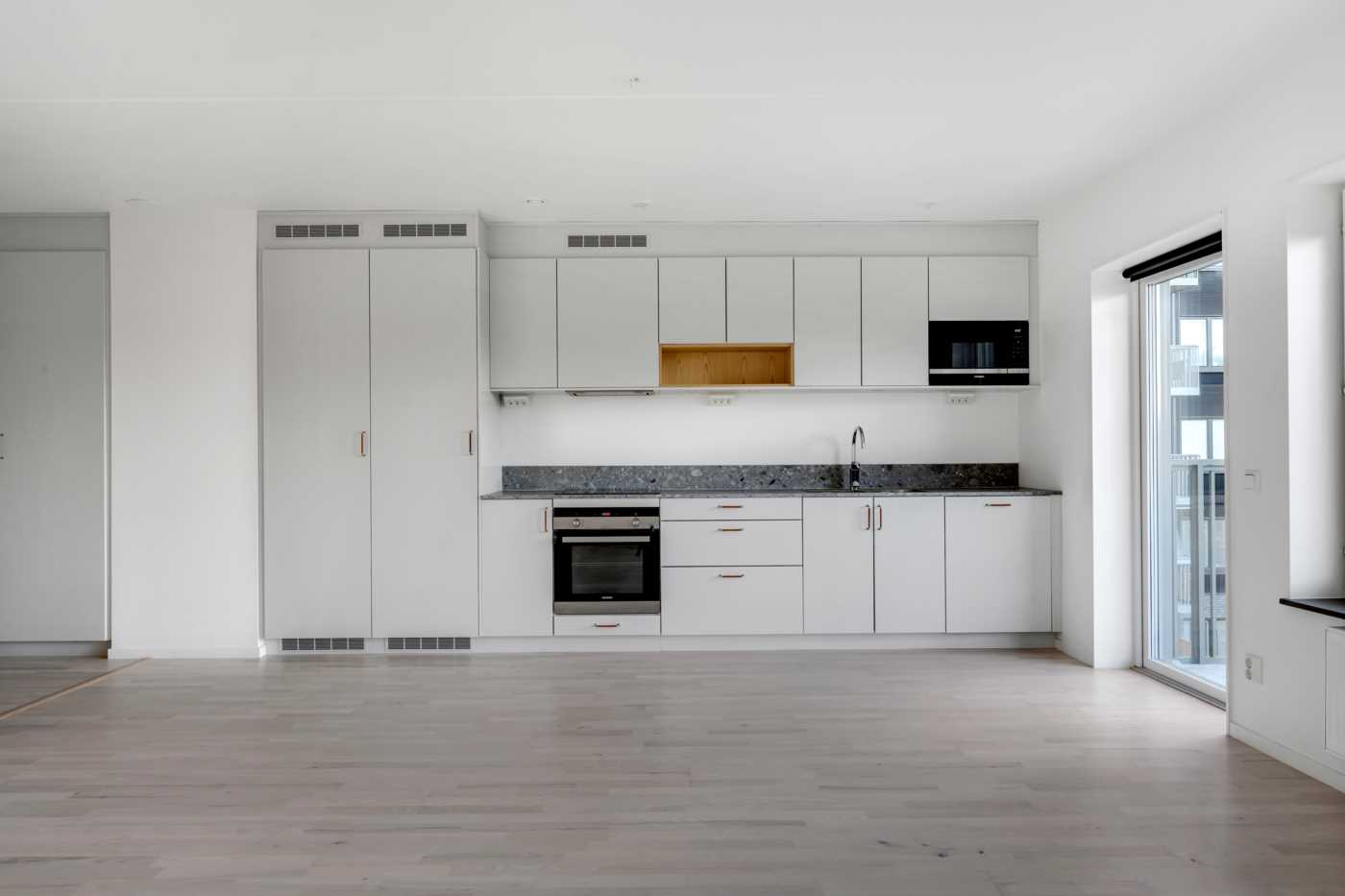 Bostaden har en sober inredning, som med ljusa mjuka toner och fina detaljer, skapar en sammanhållen och tidlös känsla. Redan i hallen möts du av en vacker vy mot grönskan utanför. Social och trivsam öppen planlösning där det stilrena köket är en naturlig del av inredningen i rummet. Köksluckorna från Ballingslöv har en pärlgrå nyans samt en öppen hylla/dekorskåp i askfanér. Väggskåpen har praktisk push open-funktion och bänkskåpen handtag med läderdetalj. Bänkskivan och stänkskydd är terrazzoinspirerad. Vitvarorna, med fullstor kyl och frys, inbyggd ugn och micro samt spishäll kommer från Siemens.