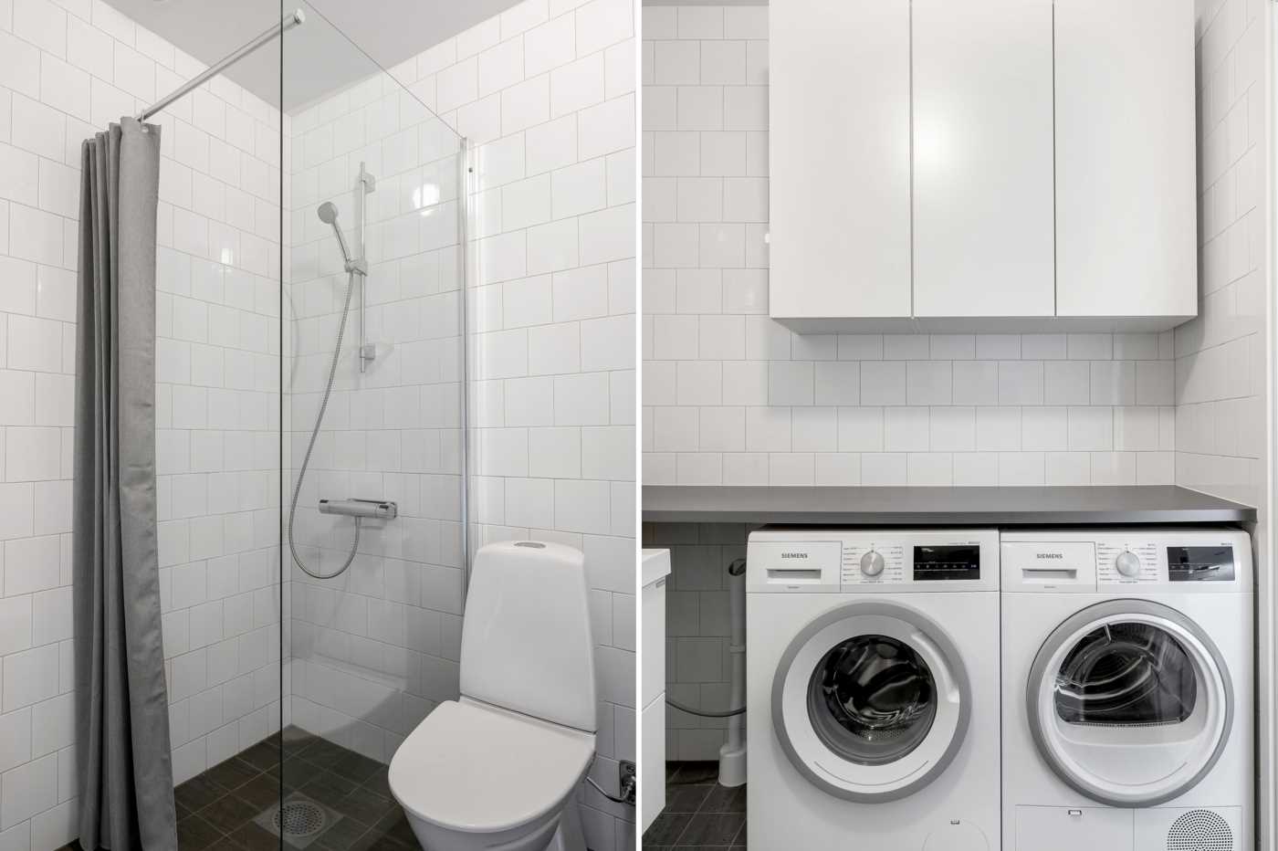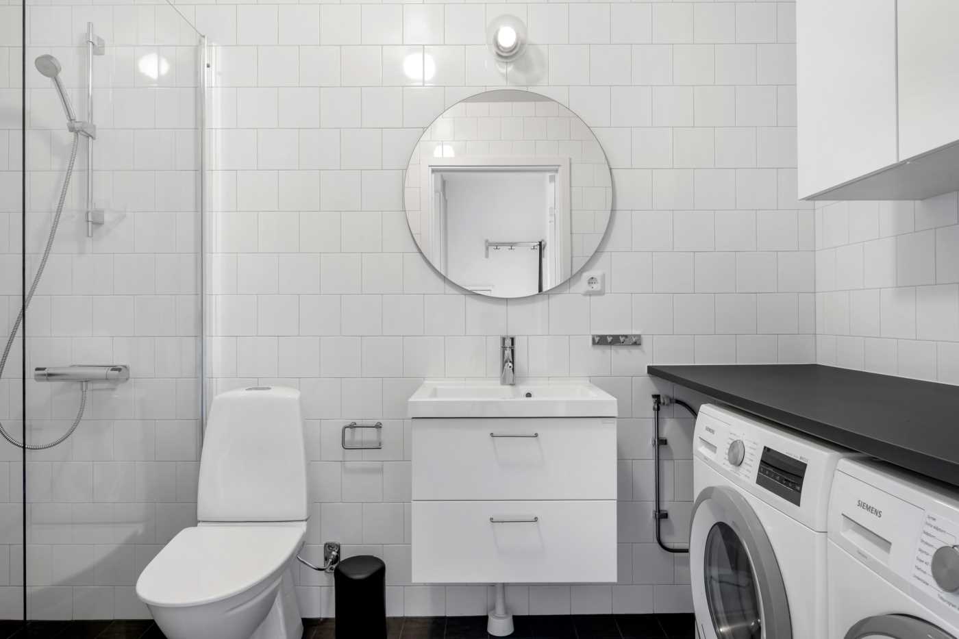 Rymligt badrum med klädvårdsavdelning. Klinker i mörkgrå granitkeramik och vitt kakel, skåp och kommod i vitt. Stor rund spegel ovanför handfatet och trevlig belysning. Tvättmaskin och torktumlare med praktisk bänk ovanför samt väggfasta skåp med bra förvaringsutrymmen.