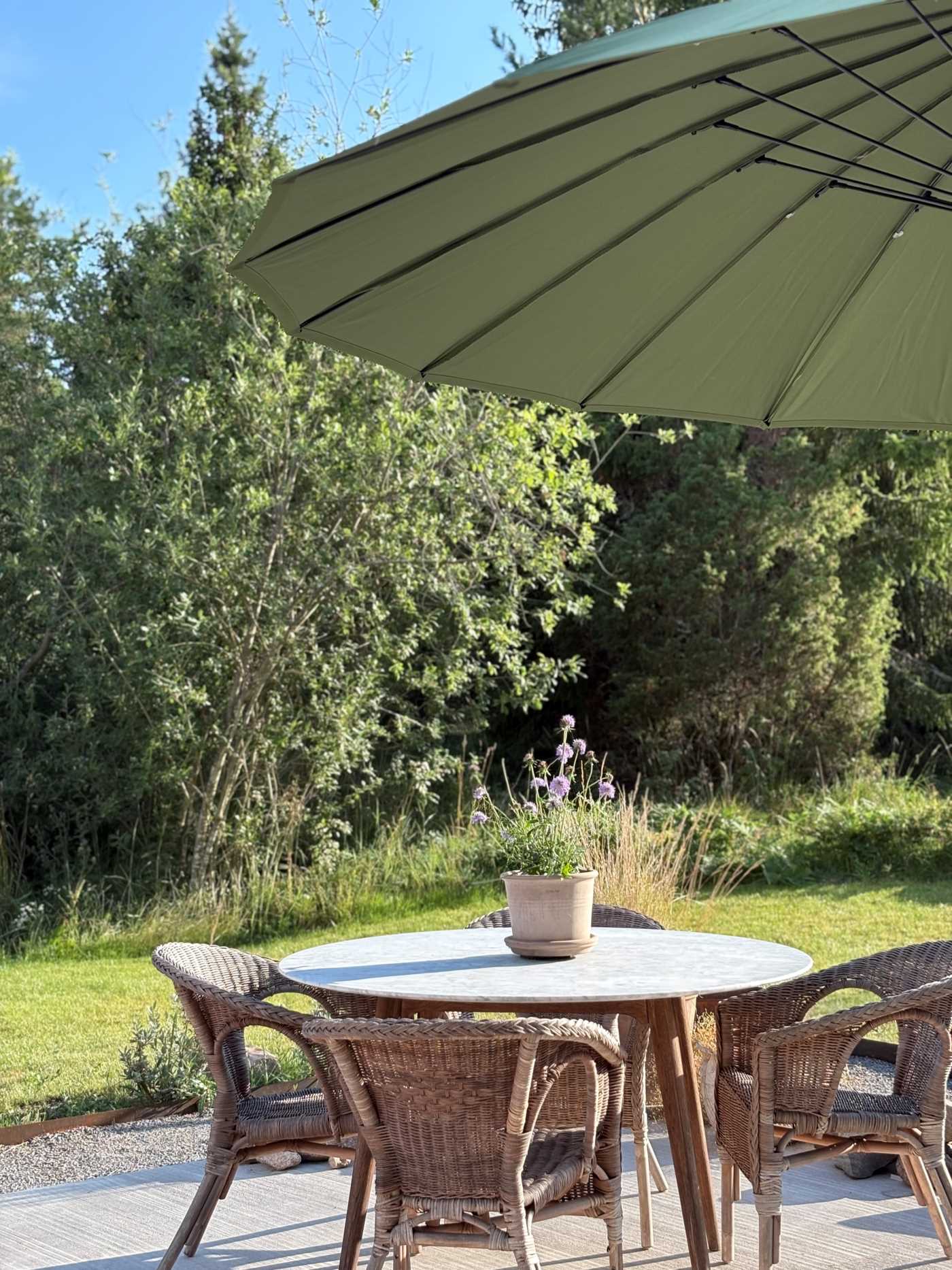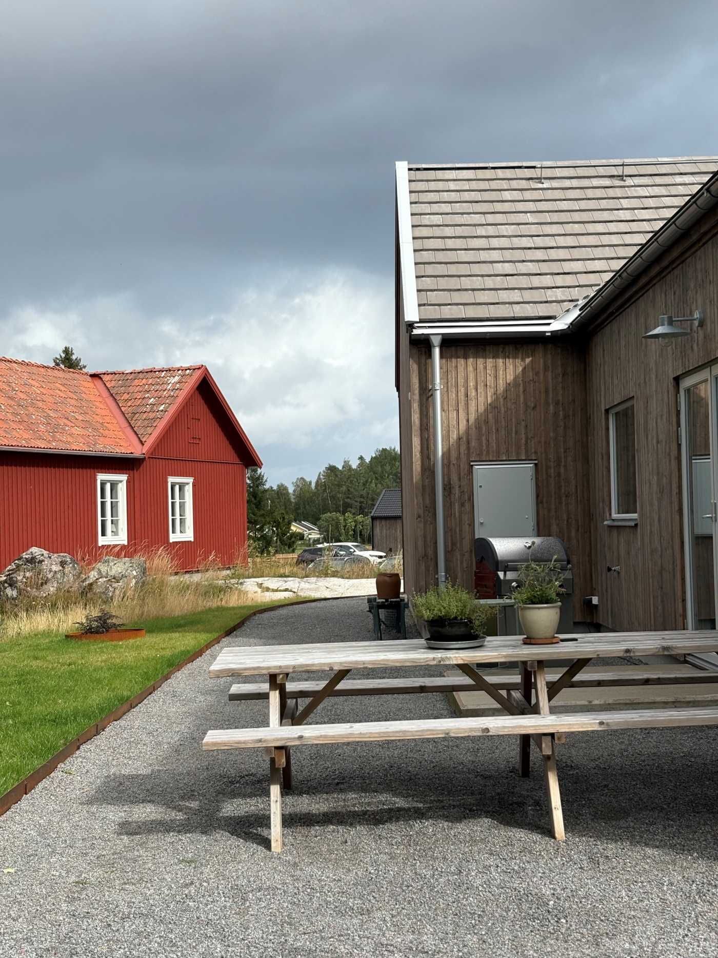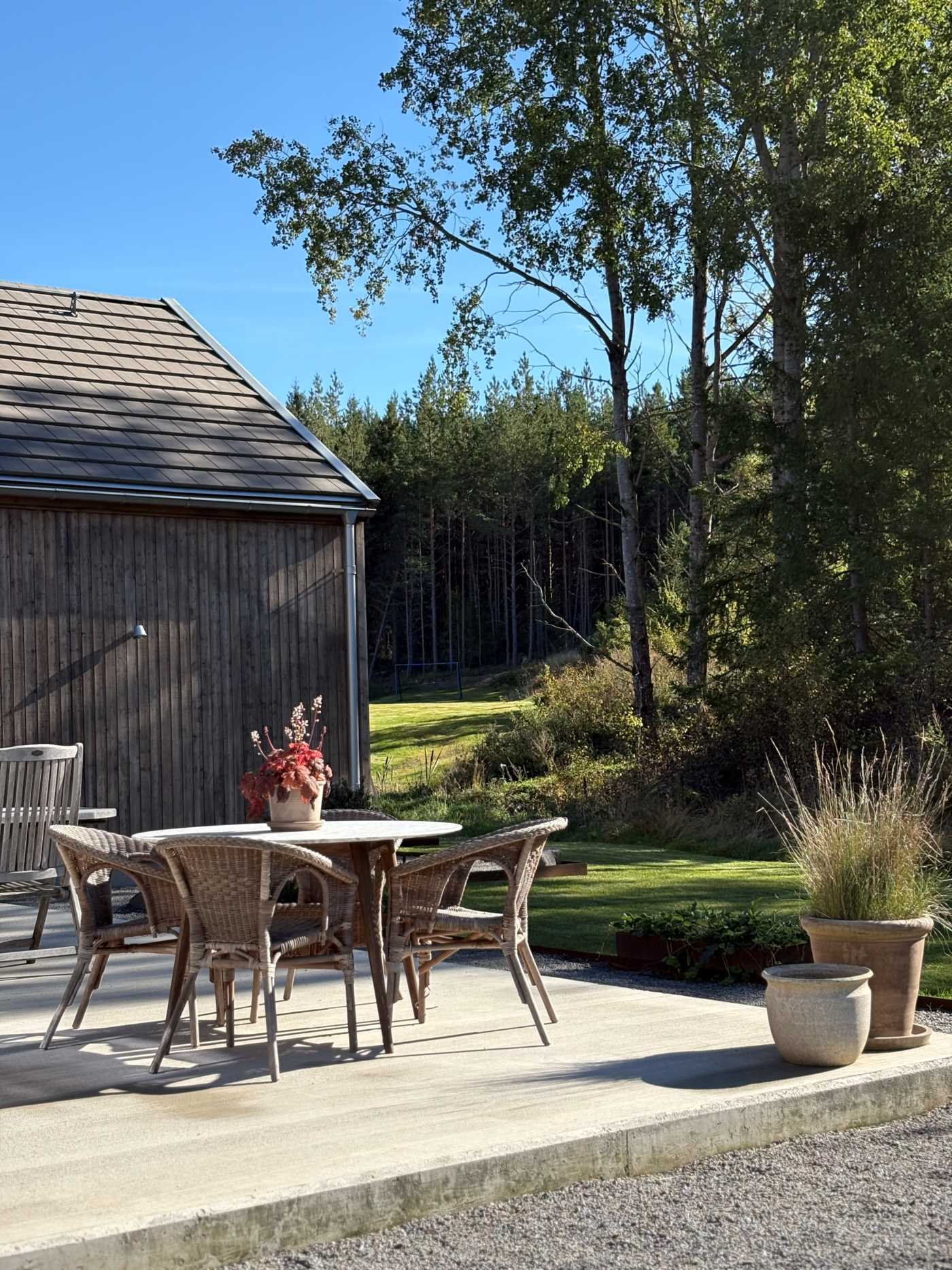 I anslutning till köket finns en rymlig matplats som rymmer stora sällskap. Härifrån nås via helglasade pardörrar den underbara och skyddade uteplatsen i vinkel och via likadana pardörrar nås på motsatt sida husets ena gavel med grillplats och vacker utsikt.
