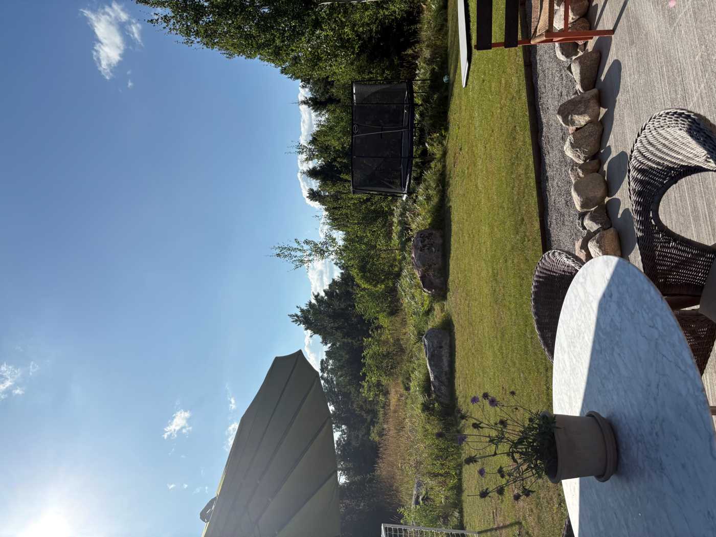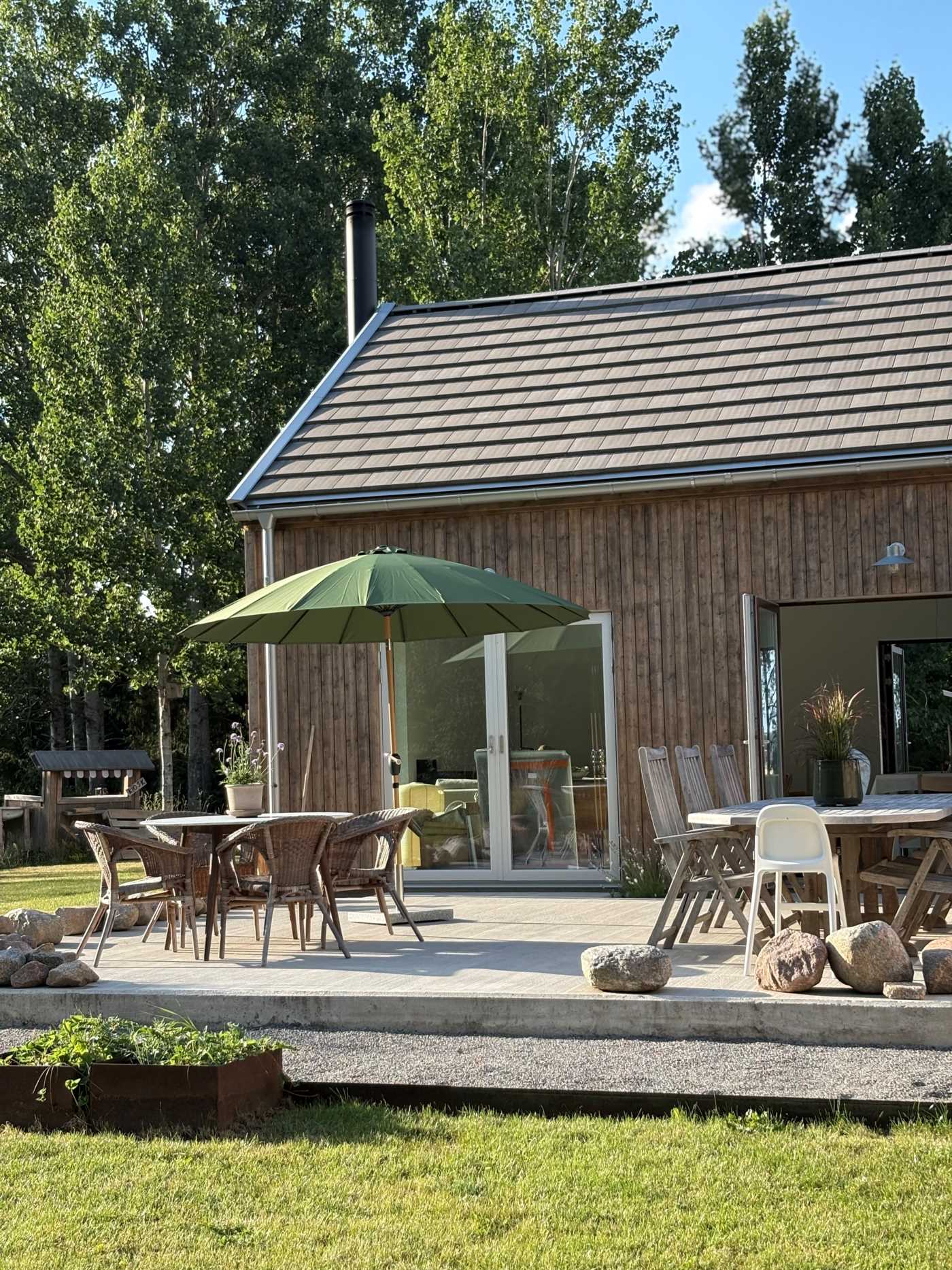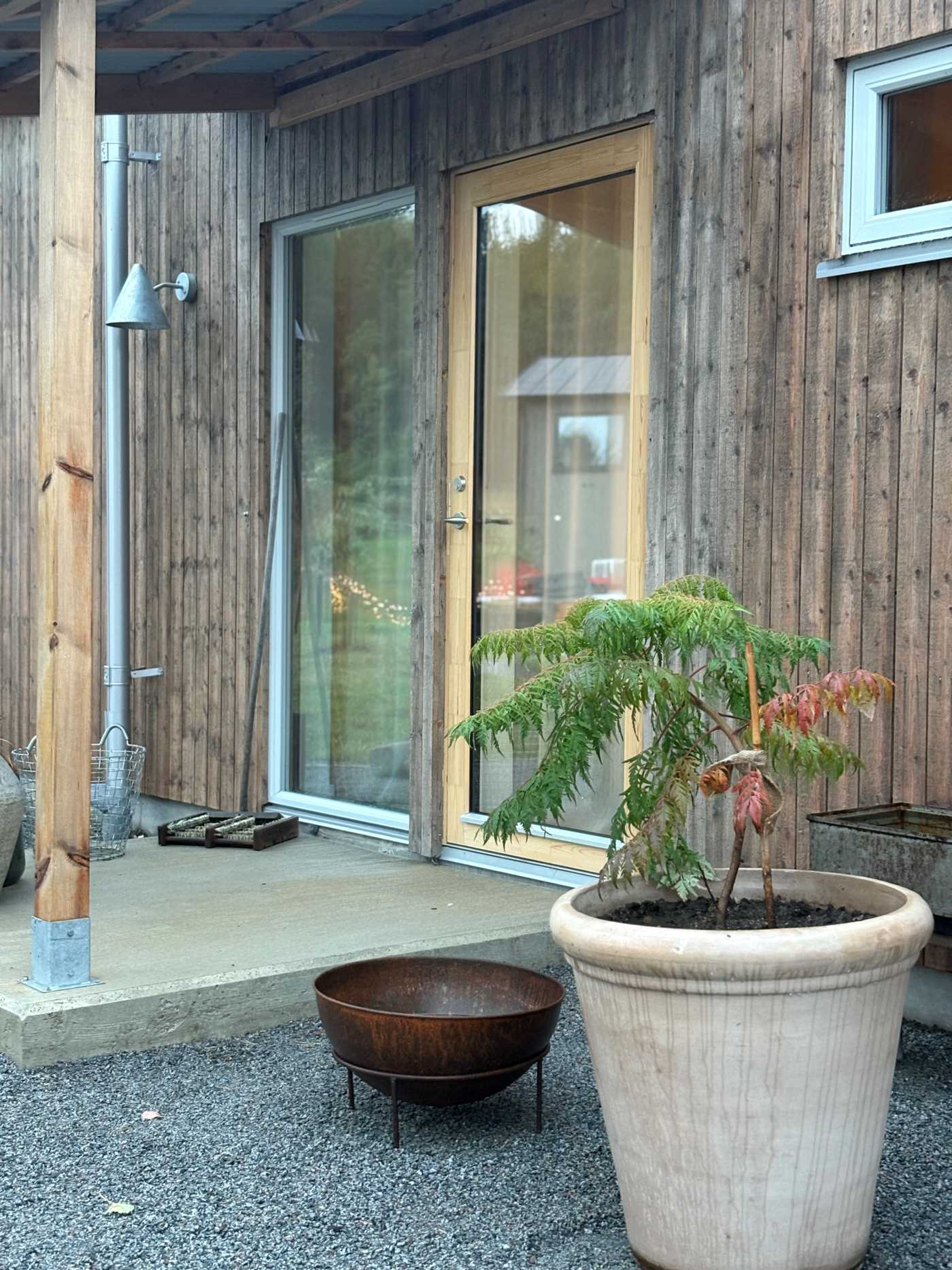 I anslutning till köket finns en rymlig matplats som rymmer stora sällskap. Härifrån nås via helglasade pardörrar den underbara och skyddade uteplatsen i vinkel och via likadana pardörrar nås på motsatt sida husets ena gavel med grillplats och vacker utsikt.