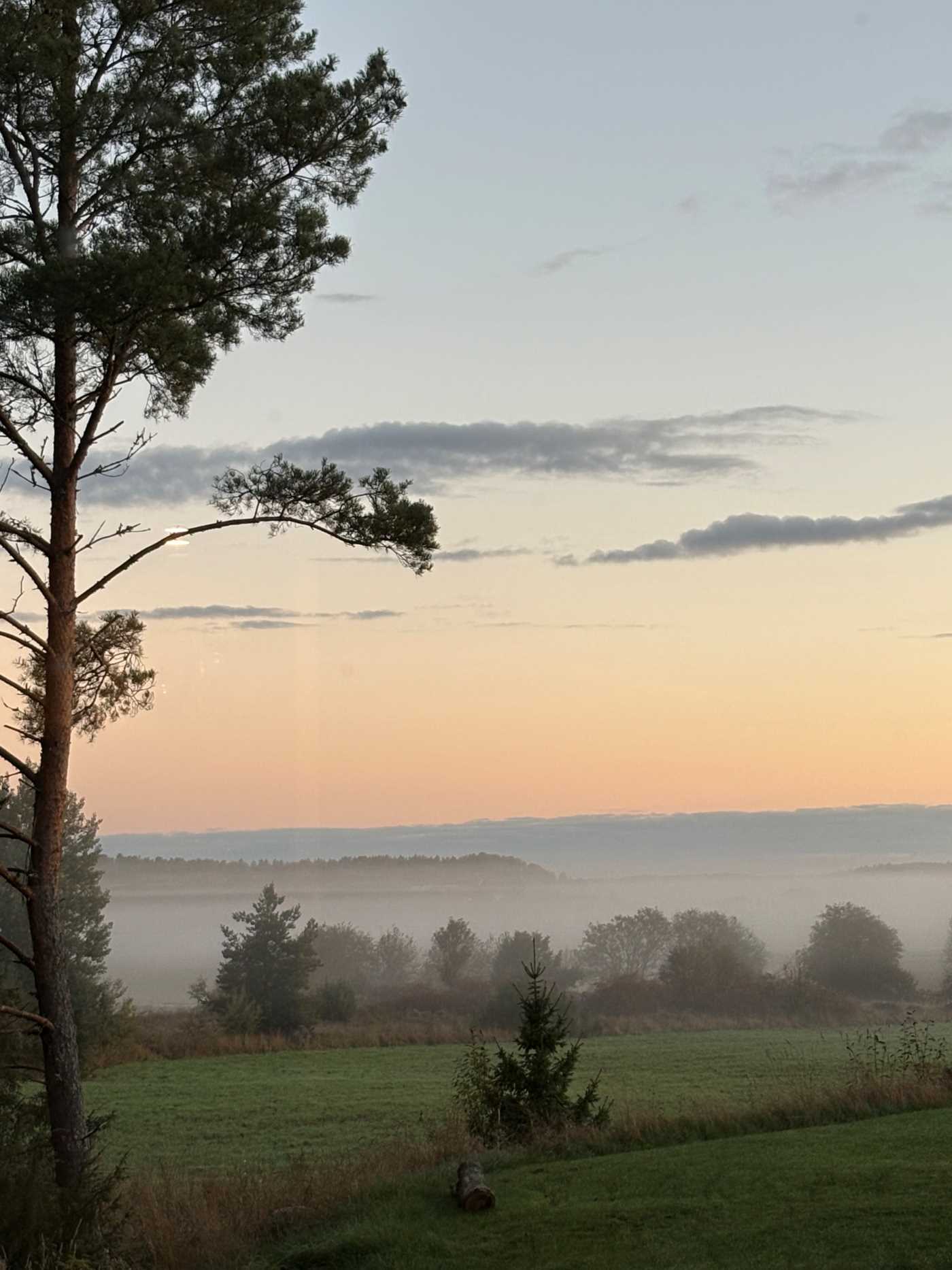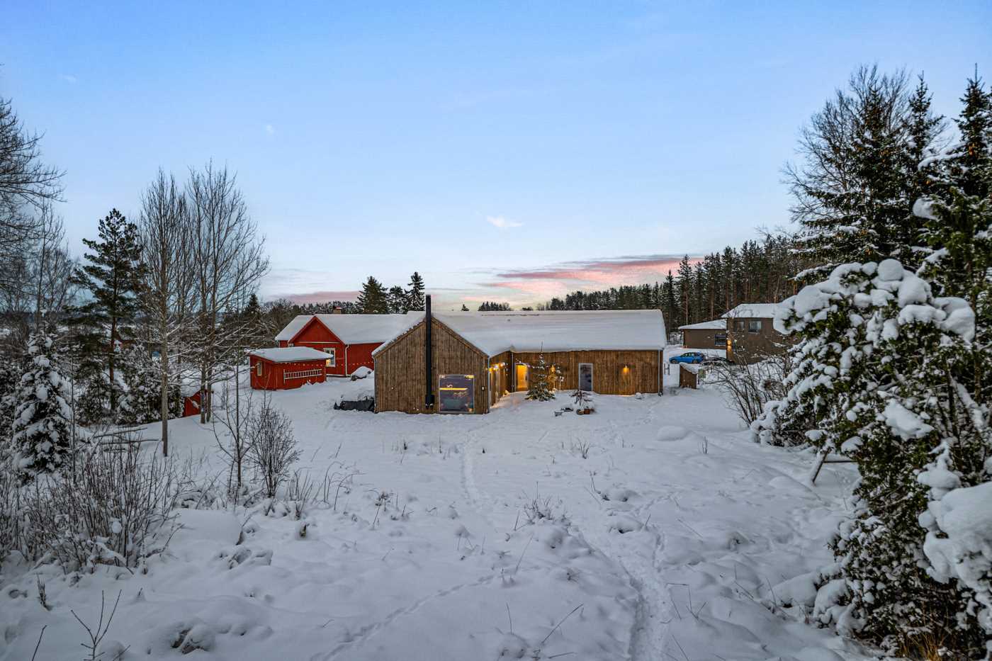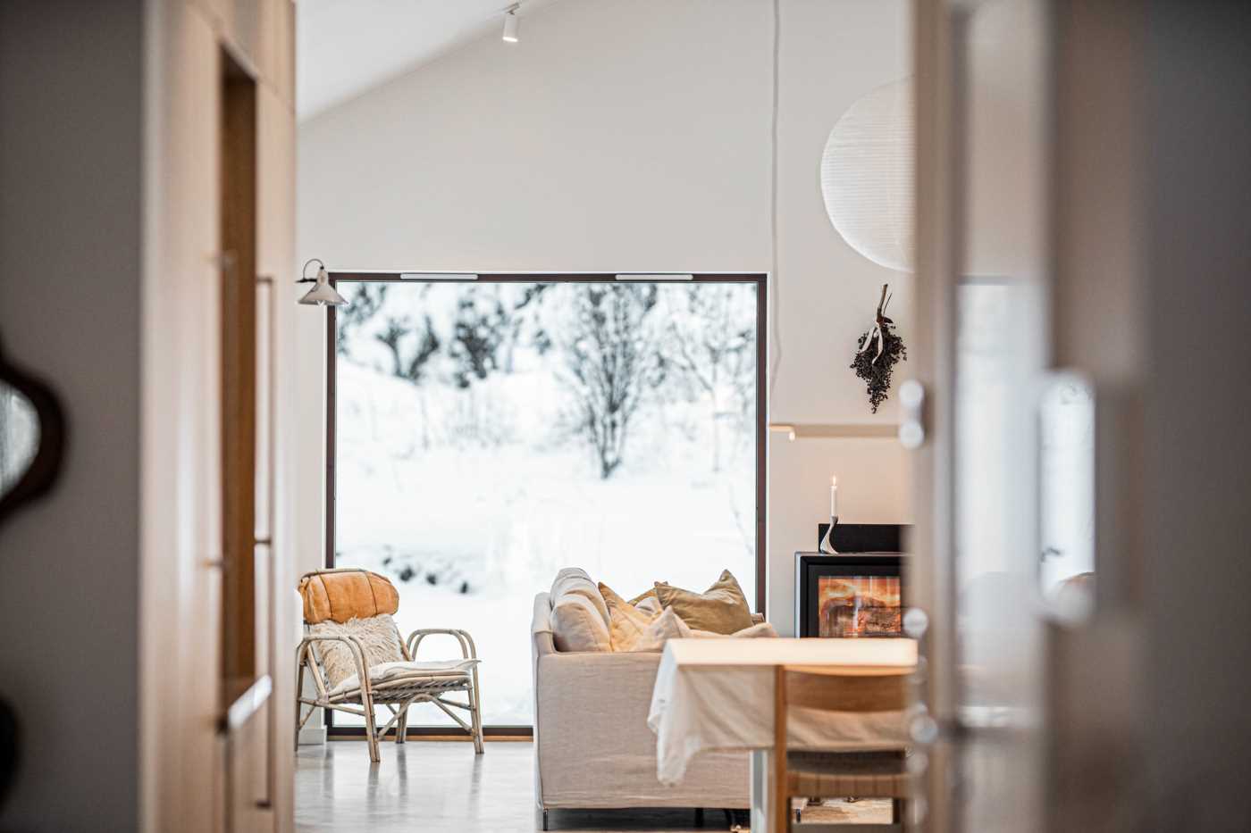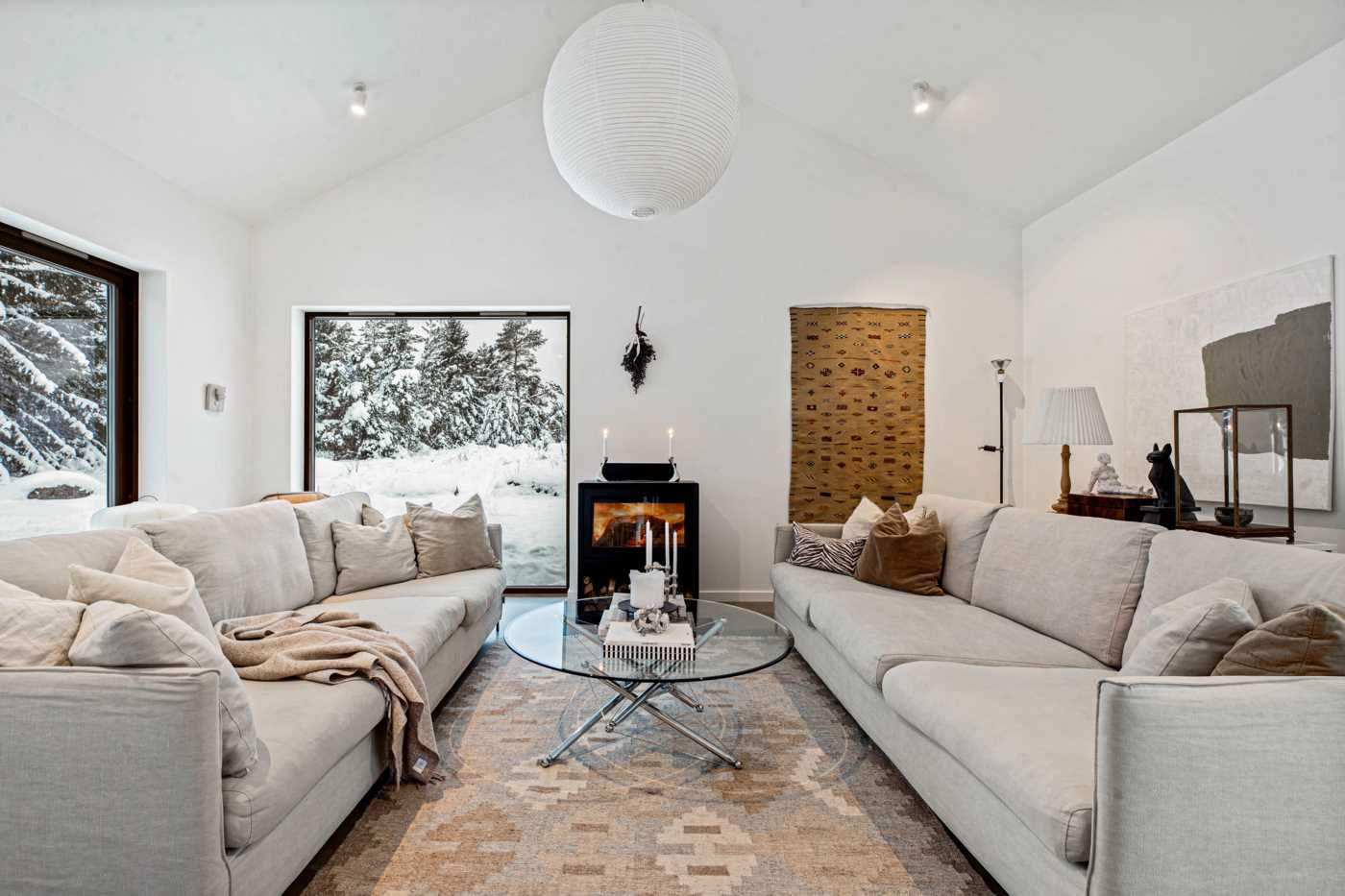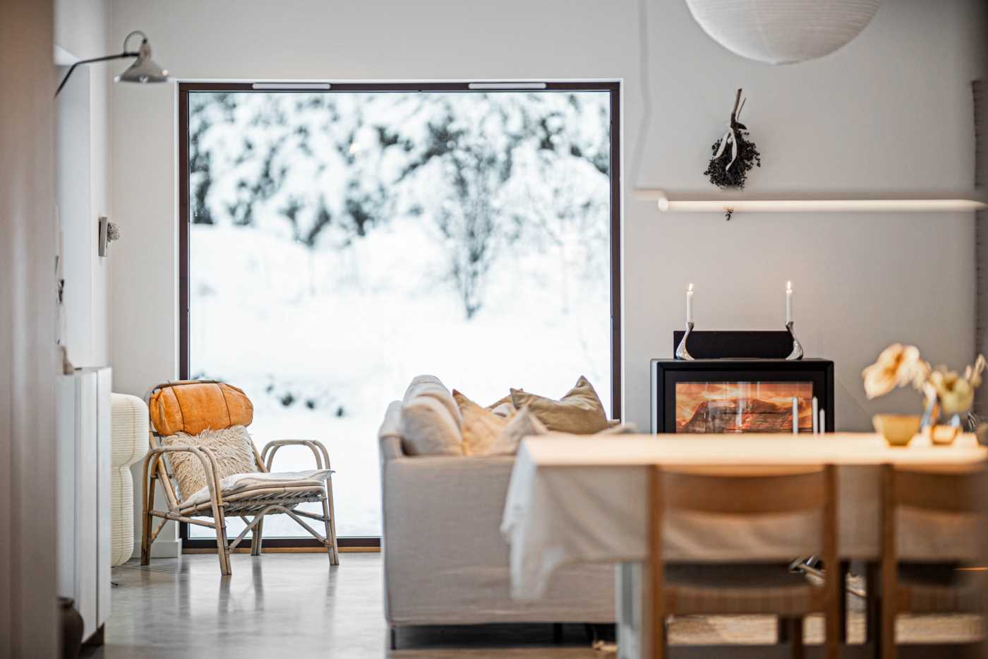 Vardagsrummsdelen har generöst med utrymme för större soffgrupp framför en stilfull och värmande braskamin Contura 310. Även från vardagsrummet leder helglasade pardörrar ut till den skyddade uteplatsen och här finns ytterligare ljusinsläpp via ett stort golvfönster med vacker vy över den egna lilla skogen och vidare ut över landskapet.