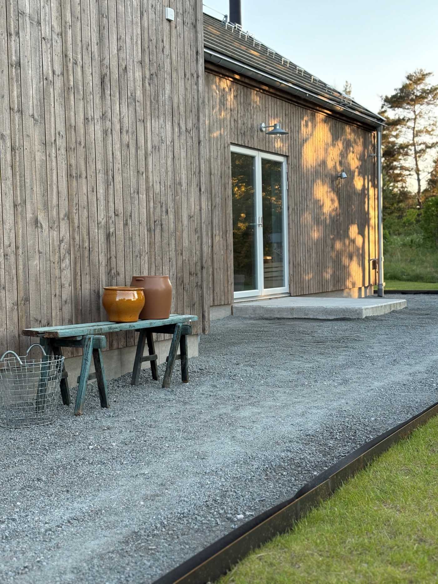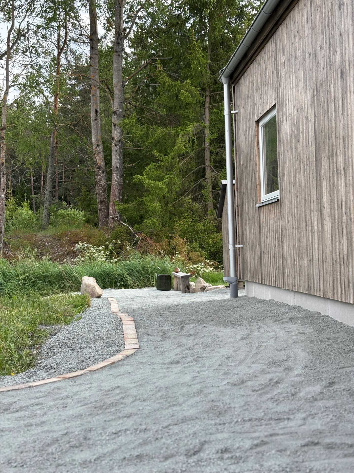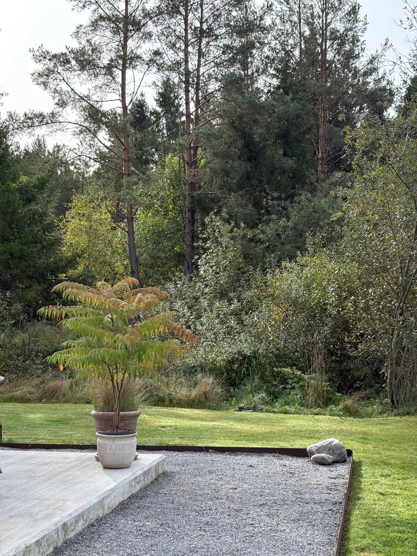 Den välplanerade och trivsamma trädgårdstomten om 2 013 kvm är skyddat belägen med fin skog som närmsta granne och vacker vy över landskapet erbjuder både vackra planteringar, fina gräsytor och en del av tomten har lämnats orörd och är därmed naturtomt för att ge en lugn övergång till omgivande natur. Utemiljön runt bostaden harmonierar väl med husets interiör med betonggjutna trappavsatser, nylagda grusgångar runt hela huset och cortenstålskanter som vackert ramar in både planteringar och gräsmattan. På husets trädgårdssida med skyddat läge i husets vinkel finns en underbar uteplats med en gjuten betongaltan i fint solläge. För att kunna belysa trädgården är det förberett med utdragen el på flera ställen, här finns även ett trefasuttag och det finns två vattenutkastare med både kall- och varmvatten. För den som önskar bygga ett garage finns en ritning på ett stort garage att tillgå.