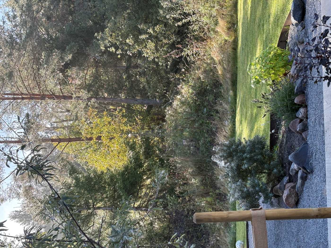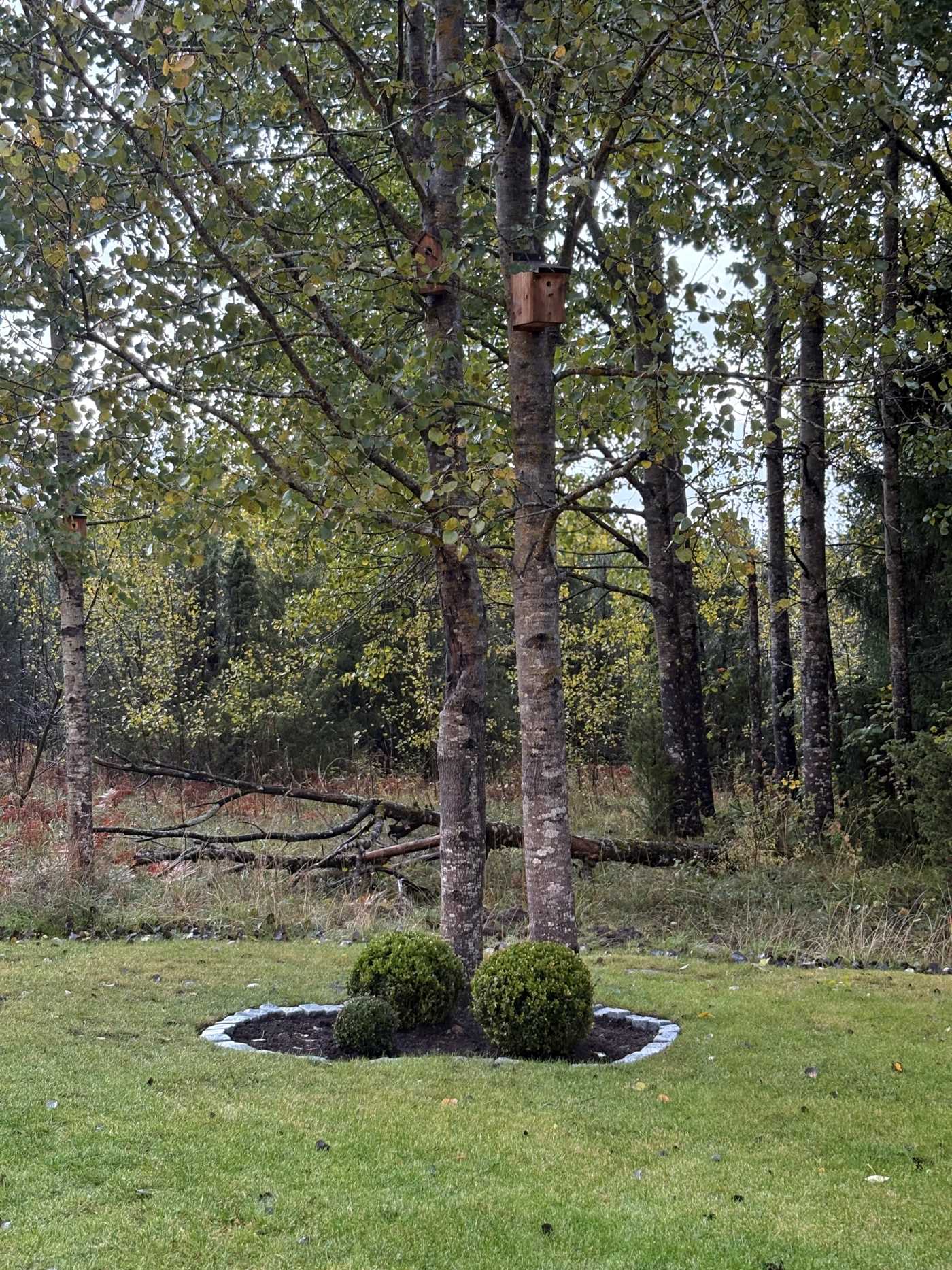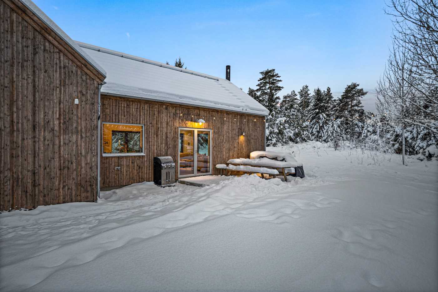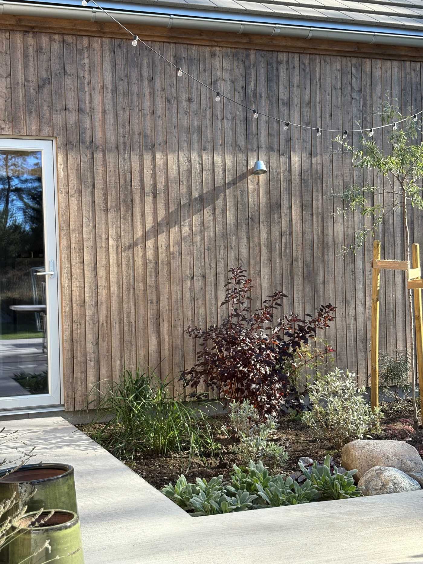 Den välplanerade och trivsamma trädgårdstomten om 2 013 kvm är skyddat belägen med fin skog som närmsta granne och vacker vy över landskapet erbjuder både vackra planteringar, fina gräsytor och en del av tomten har lämnats orörd och är därmed naturtomt för att ge en lugn övergång till omgivande natur. Utemiljön runt bostaden harmonierar väl med husets interiör med betonggjutna trappavsatser, nylagda grusgångar runt hela huset och cortenstålskanter som vackert ramar in både planteringar och gräsmattan. På husets trädgårdssida med skyddat läge i husets vinkel finns en underbar uteplats med en gjuten betongaltan i fint solläge. För att kunna belysa trädgården är det förberett med utdragen el på flera ställen, här finns även ett trefasuttag och det finns två vattenutkastare med både kall- och varmvatten. För den som önskar bygga ett garage finns en ritning på ett stort garage att tillgå.