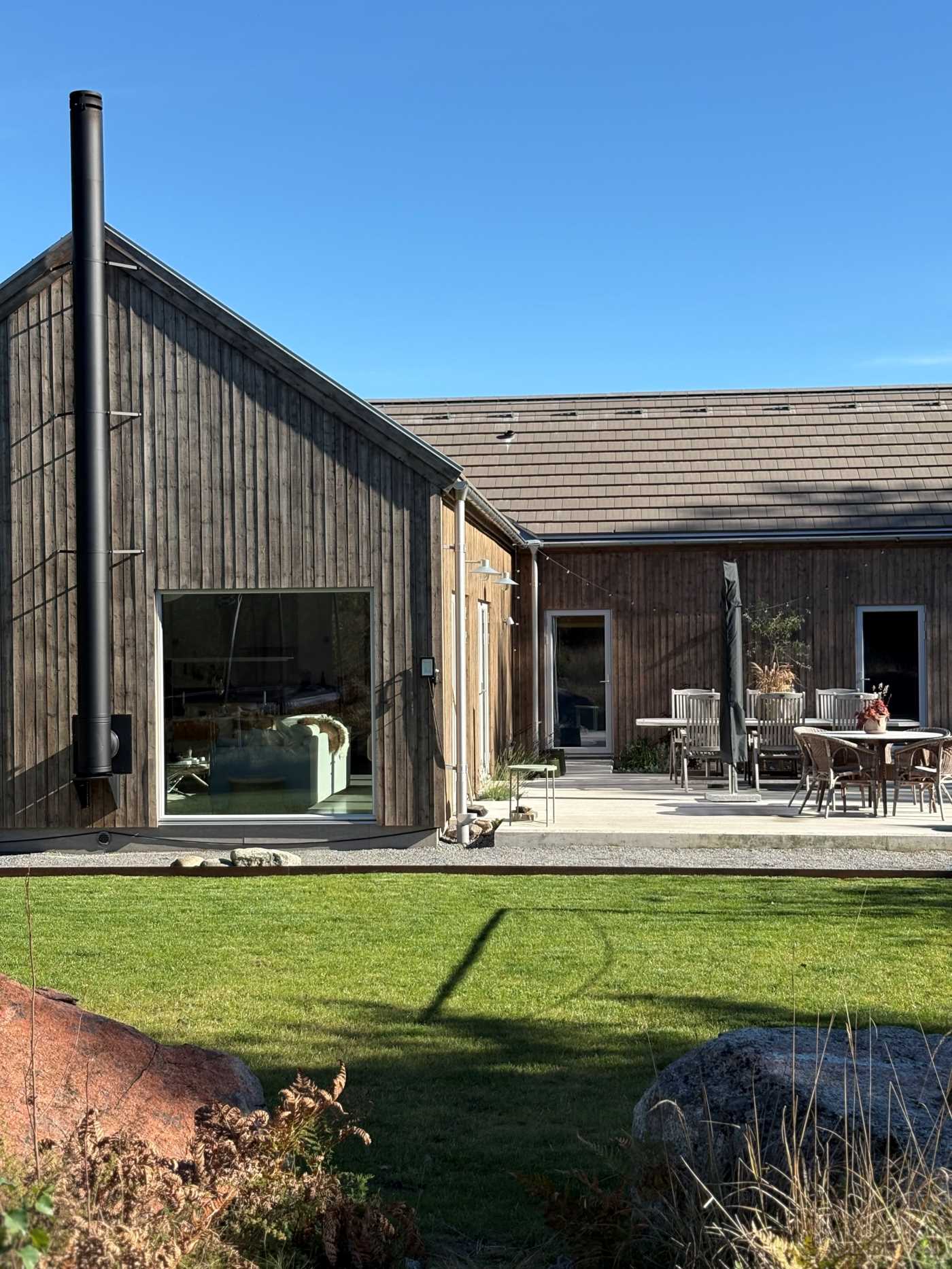 Husets vinkeldel har underbar rymd med ryggåstak där ljuset flödar in via flera fönsterpartier, här finner man huset fantastiska sällskapsdel med öppen planlösning mellan kök, matplats och vardagsrum. Det stilfulla U-formade köket har inredning från Vedum med luckor i vitlaserad ek och vackra arbetsbänkar i kompositsten från Dekker Nordic, en dröm för den matlagningsintresserade med en spis från Smeg med dubbla ugnar och en bred induktionshäll samt en fläkt från Fjäråskupan. Vidare finns här en köksö med fin extra arbetsyta och trevligt ”häng” med sittplats för tre, självklart har detta kök även en ljuvlig kaffestation. Från matplatsen med utrymme för stora sällskap nås via helglasade pardörrar den underbara uteplatsen i vinkel och via likadana pardörrar nås åt andra hållet husets ena gavel med perfekt grillplats. Vardagsrummet har en värmande braskamin från Contura och även härifrån nås via helglasade pardörrar den skyddade uteplatsen.