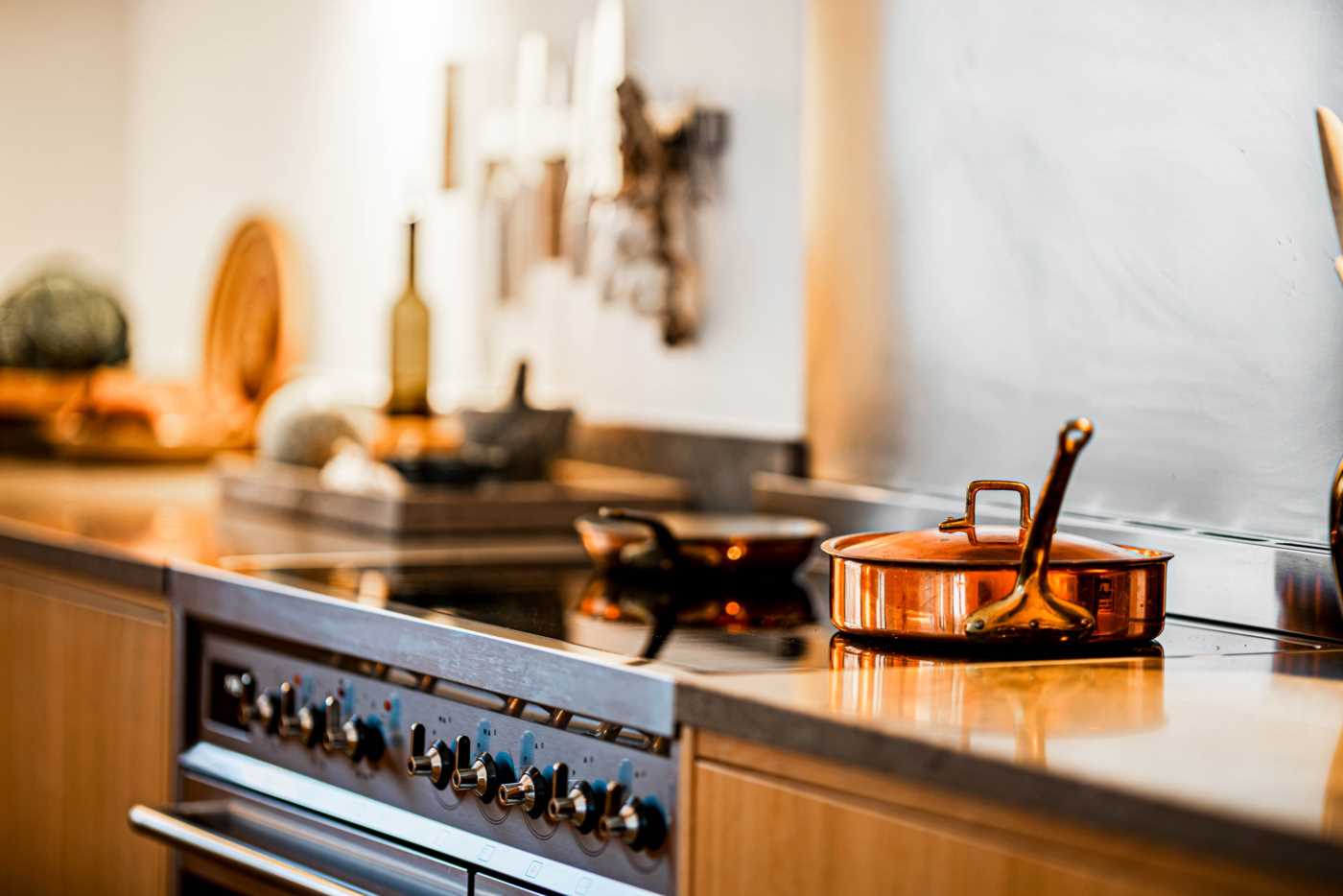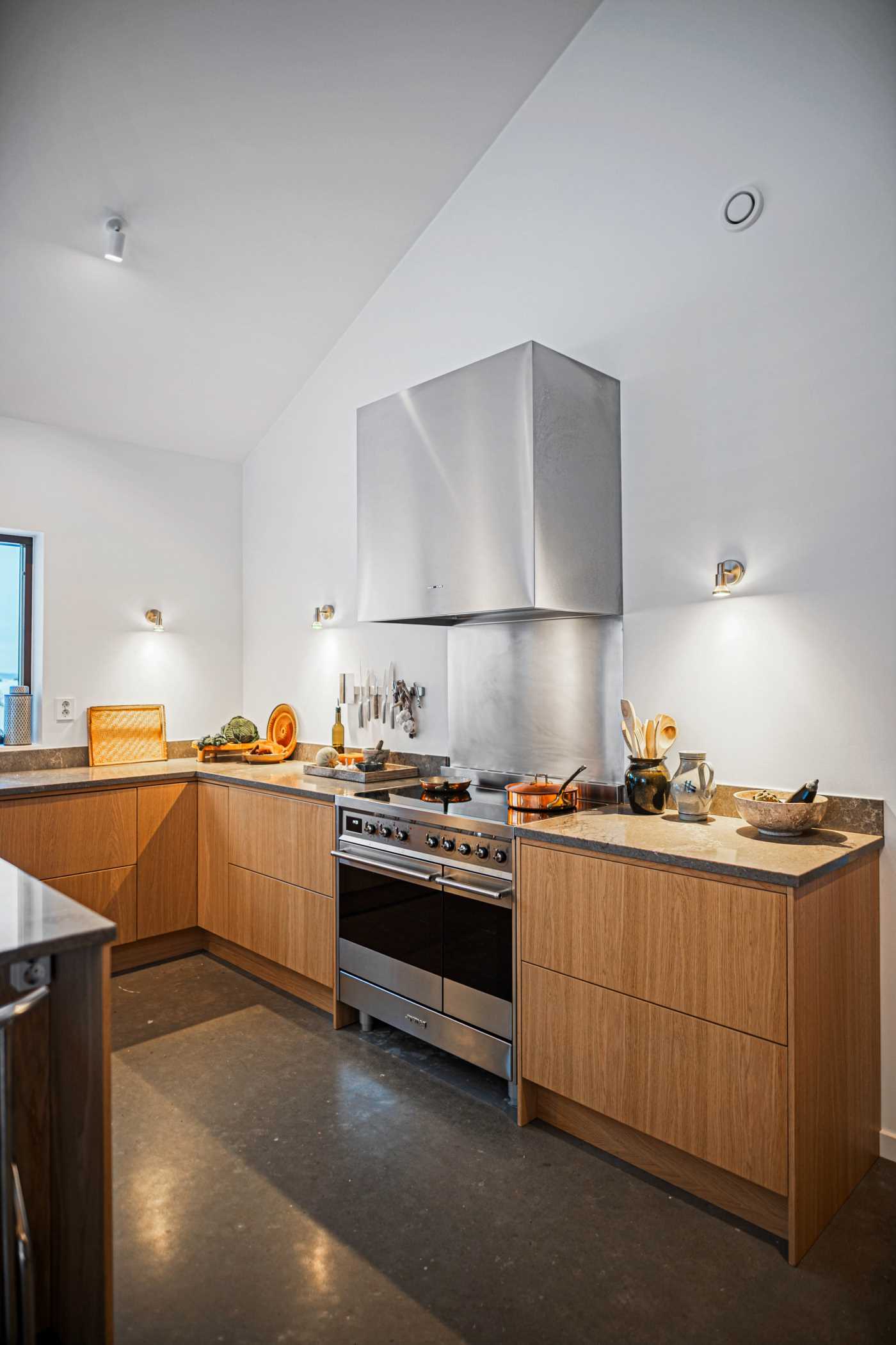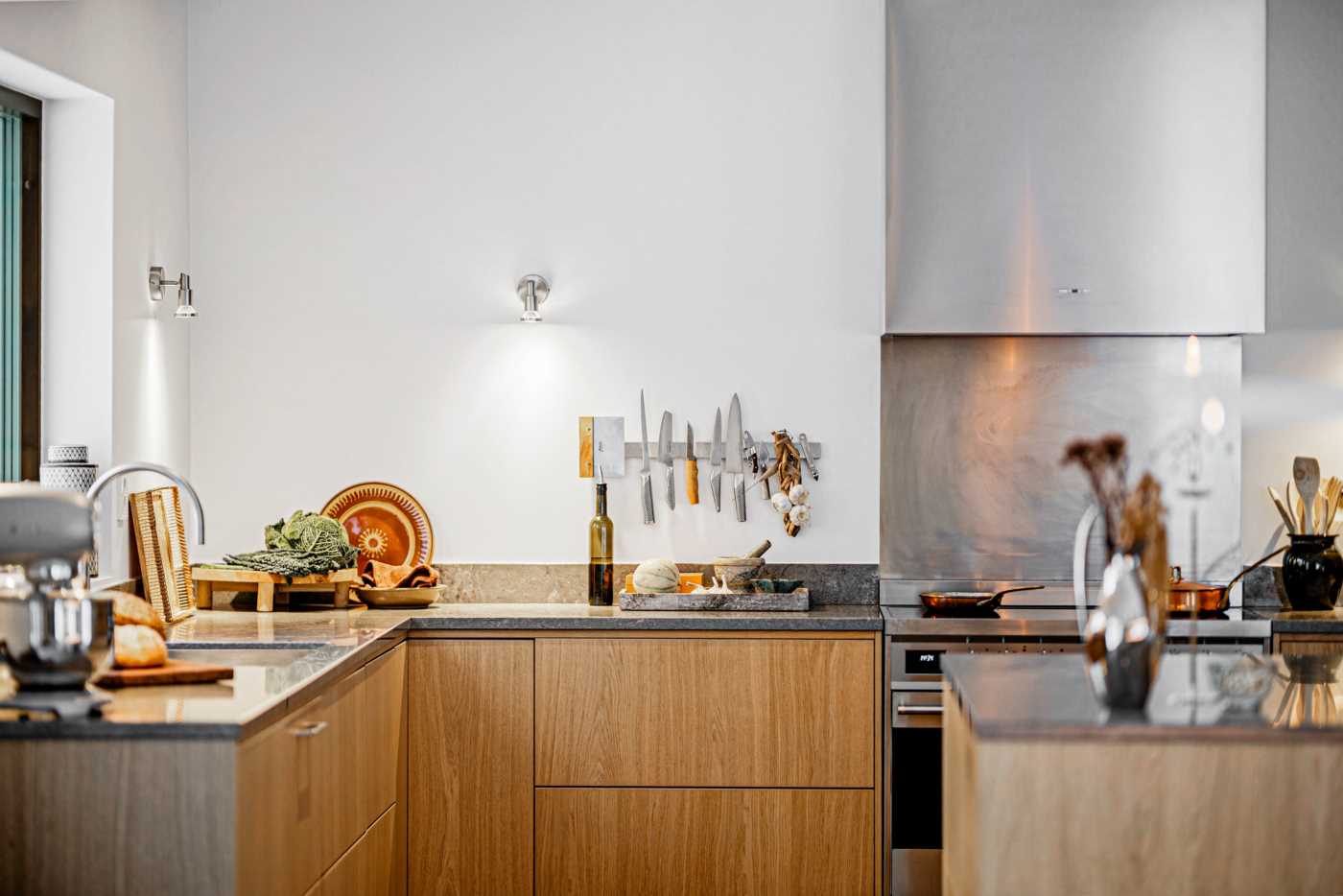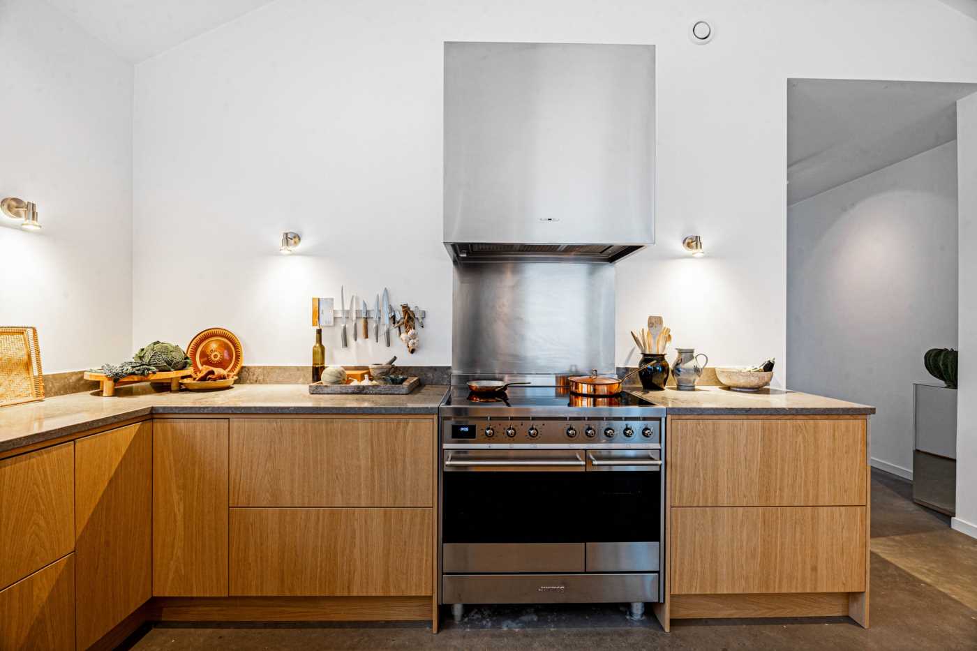 Köket är utrustat med en spis med bred induktionshäll från Smeg med dubbla ugnar, fläkt från Fjäråskupan samt integrerad kyl, frys och diskmaskin från Siemens.