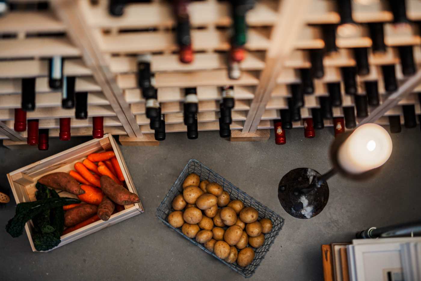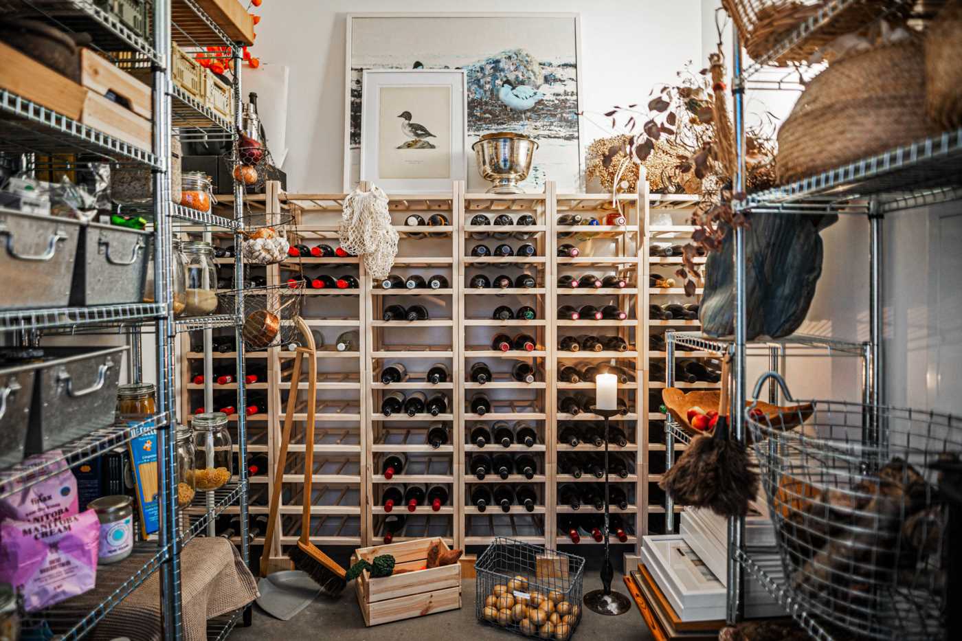 Med ingång från entréhallen och i nära anslutning till köket finns ett rymligt förråd som idag nyttjas som stort fint skafferi. Vita väggar och betonggolv.