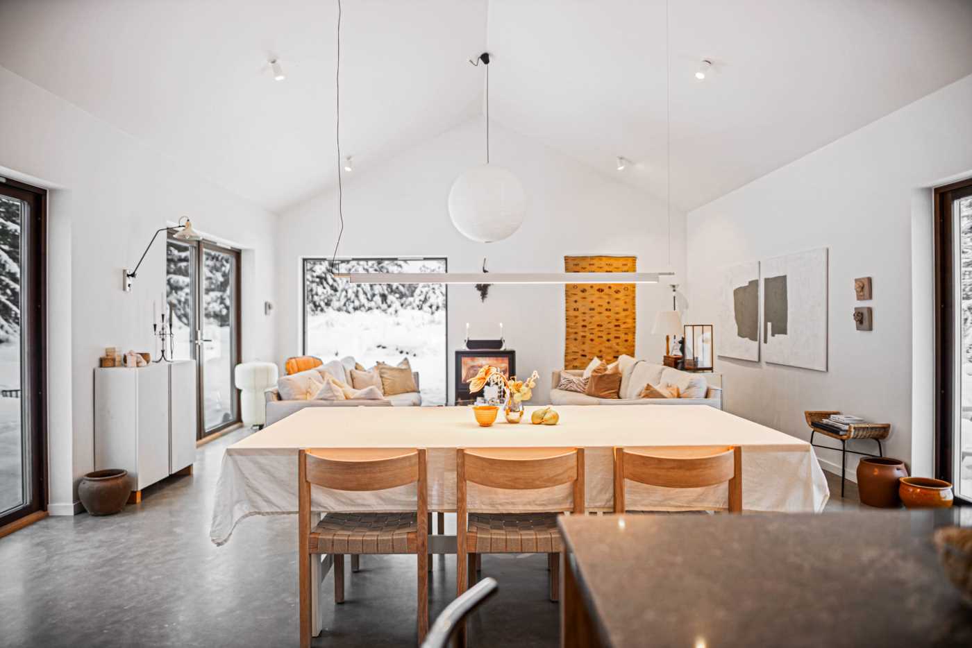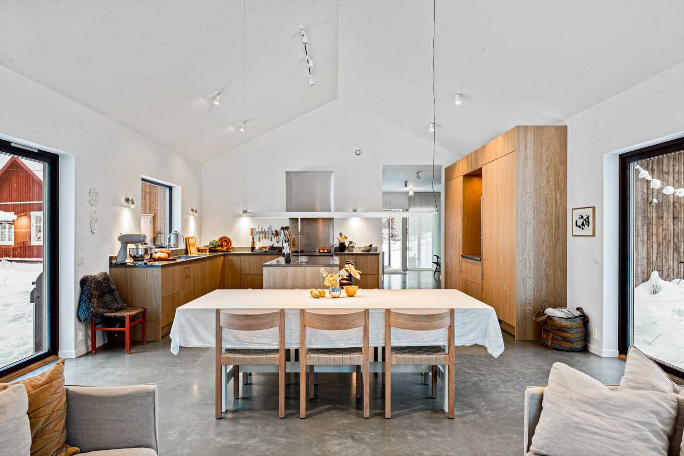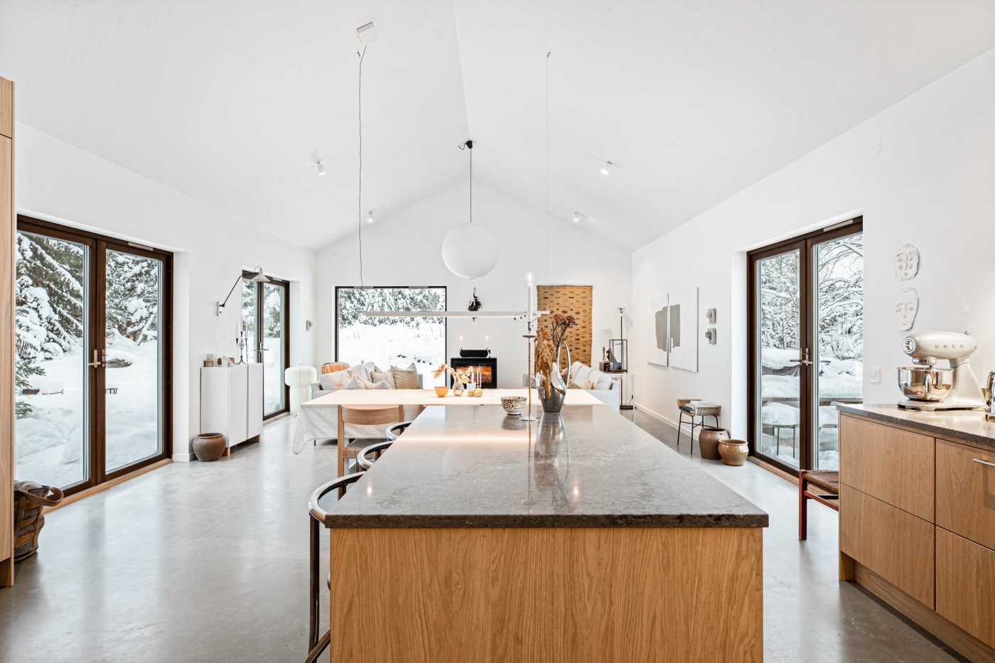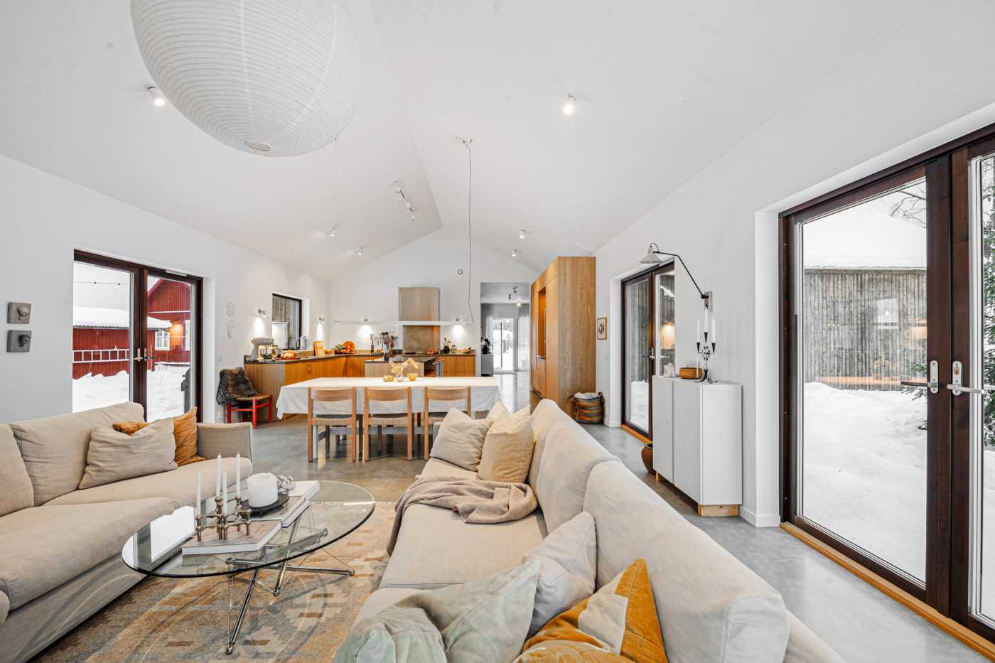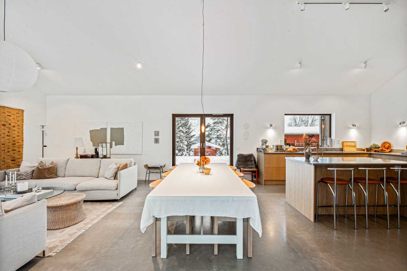 Från entrén ser man in i villans vinkeldel och det fantastiska sällskapsutrymmet med öppen planlösning mellan kök, matplats och vardagsrum. Här är det ryggåstak med sagolik rymd och ljuset flödar in genom flertalet stora fönsterpartier varav tre med helglasade dubbeldörrar ute till trädgården. Sällskapsdelen har vita väggar, vackert betonggolv med vattenburen golvvärme och spotlights i tak.