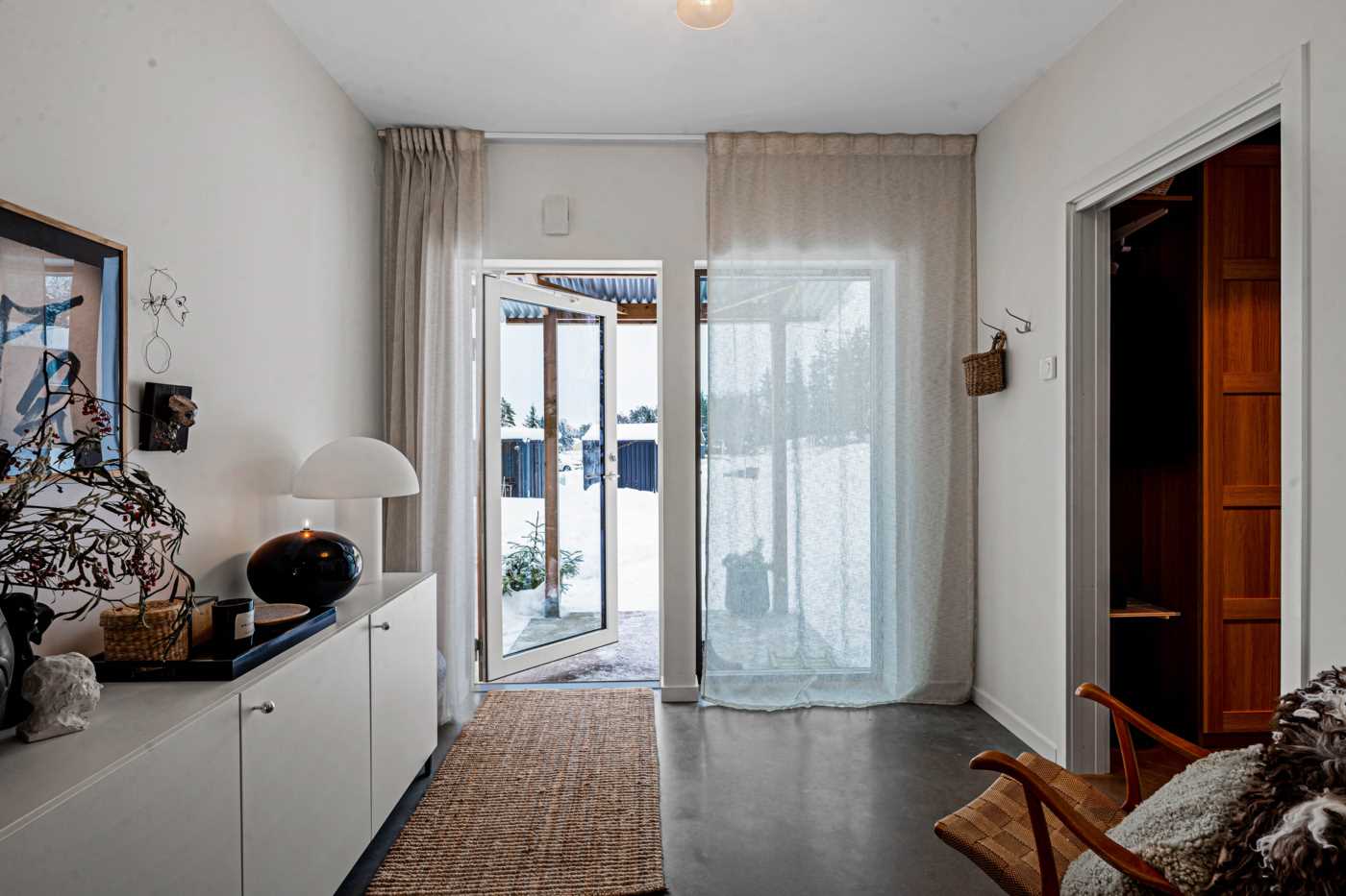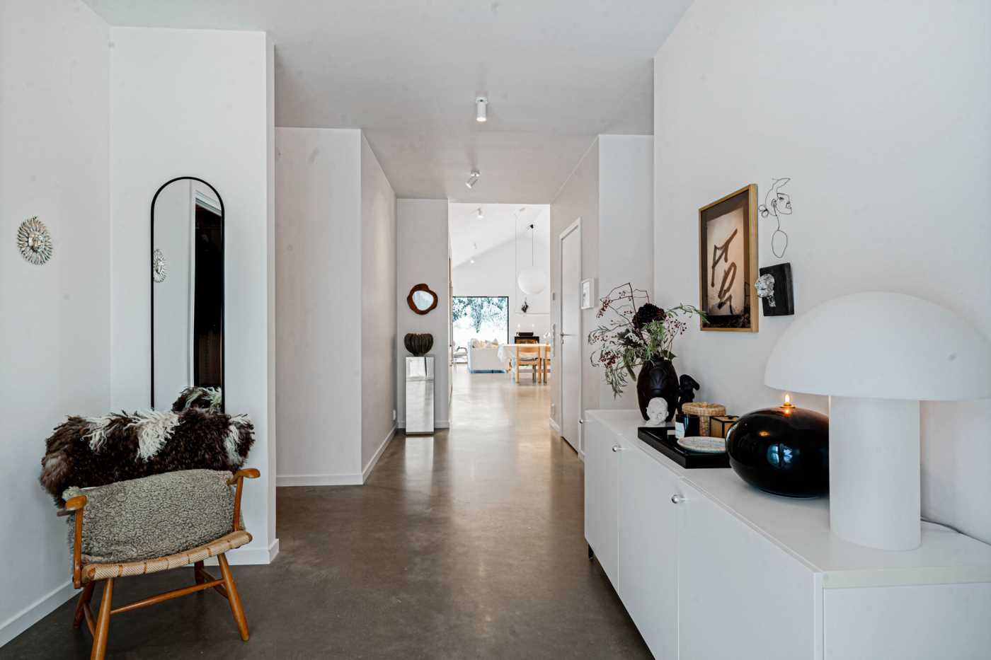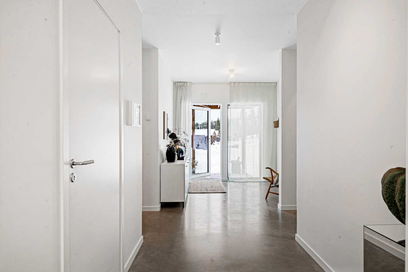 Välkommande entré med fint ljusinsläpp via både helglasad entrédörr och golvfönster. Vita väggar och vackert slipat betonggolv med vattenburen golvvärme.