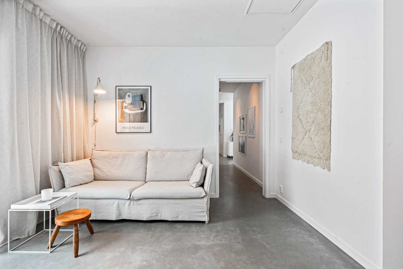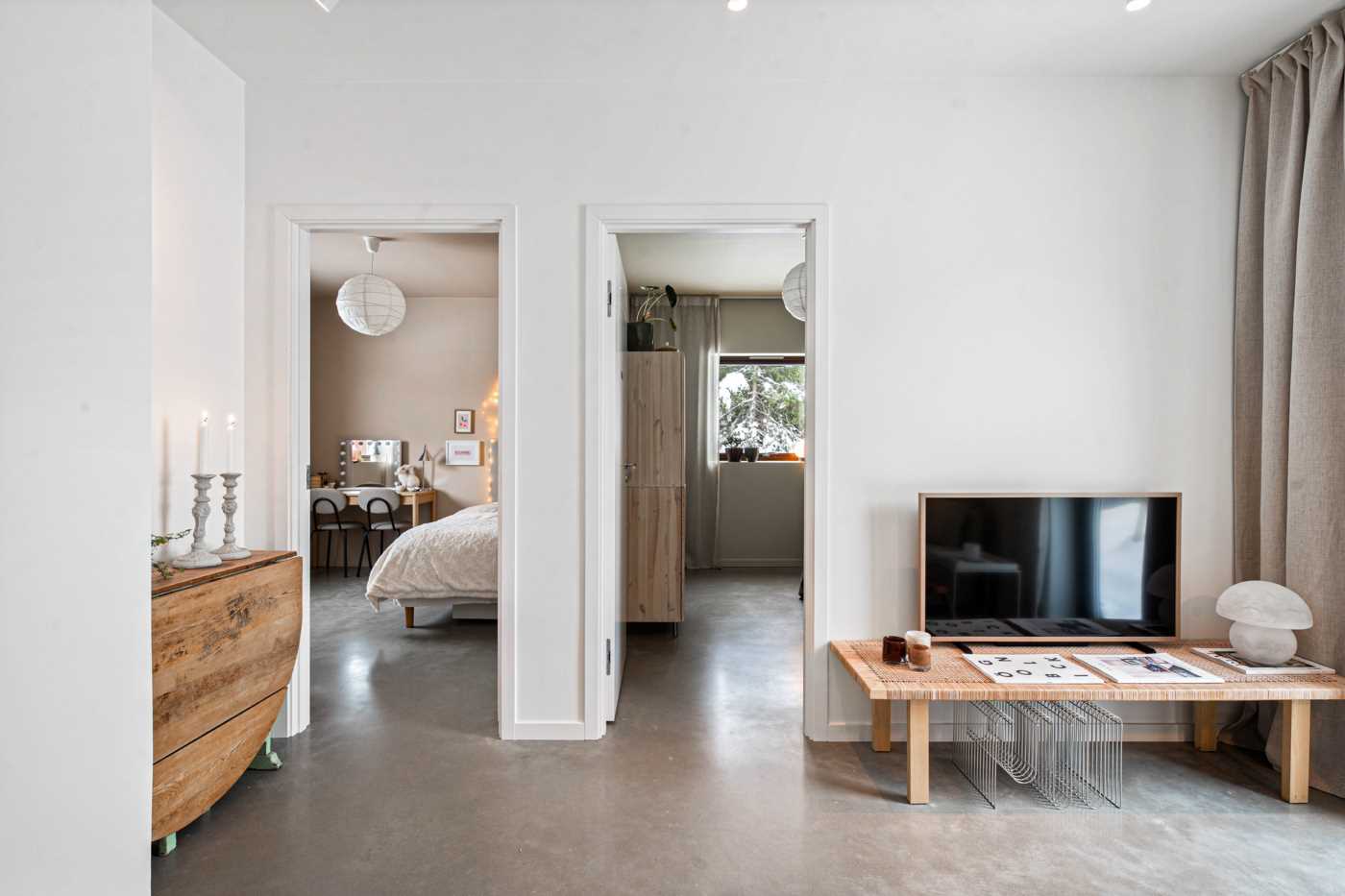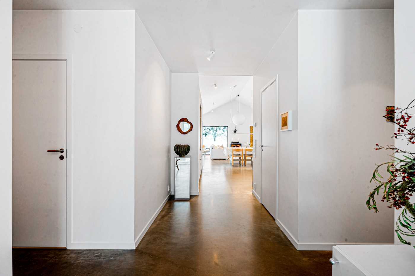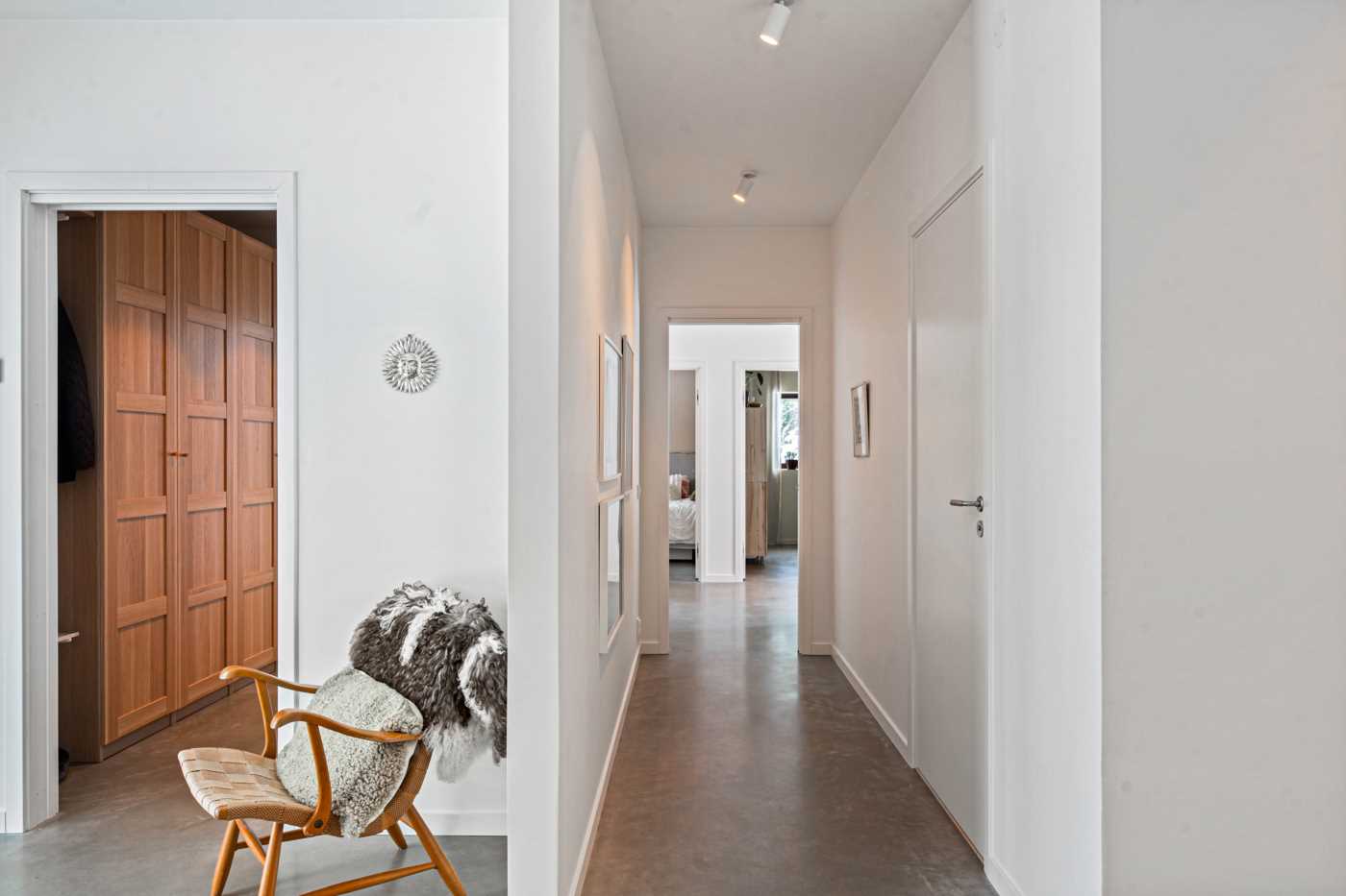 Från entrén leder en passage till resterande rum. Vita väggar och betonggolv.