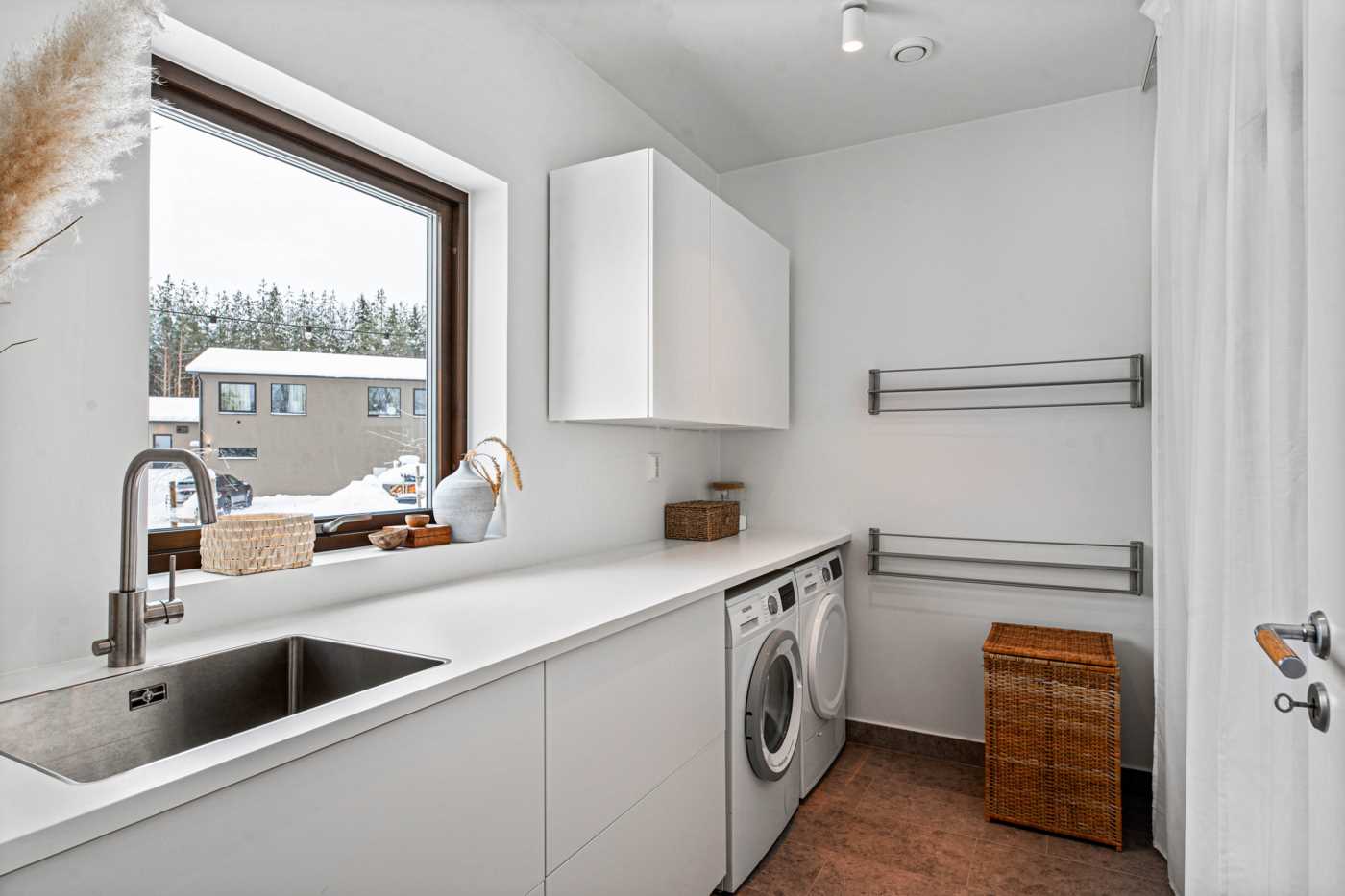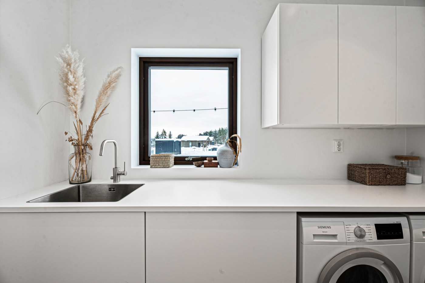 Från kapprummet nås tvättstugan med ljusinsläpp via ett fönster med vy mot entrésidan. Här finns en rejäl arbetsbänk i laminag med ho och generöst med förvaring i både under- och överskåp. Tvättmaskin och torktumlare från Siemens är placerade under arbetsbänken. Här finns husets effektiva bergvärmepump från Nibe samt bakom ett draperi finns husets vattenanläggning med hydropress och vattenavhärdare. Vita väggar och klinker på golv.