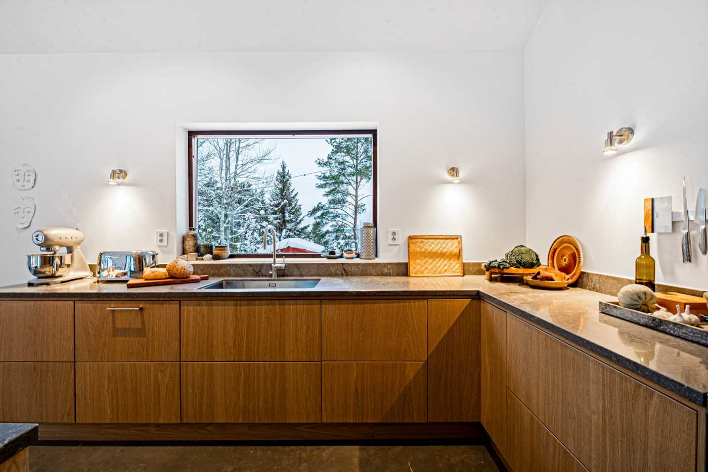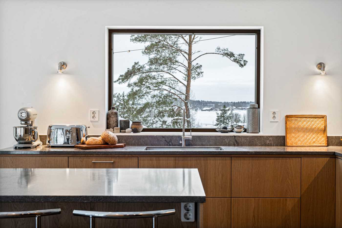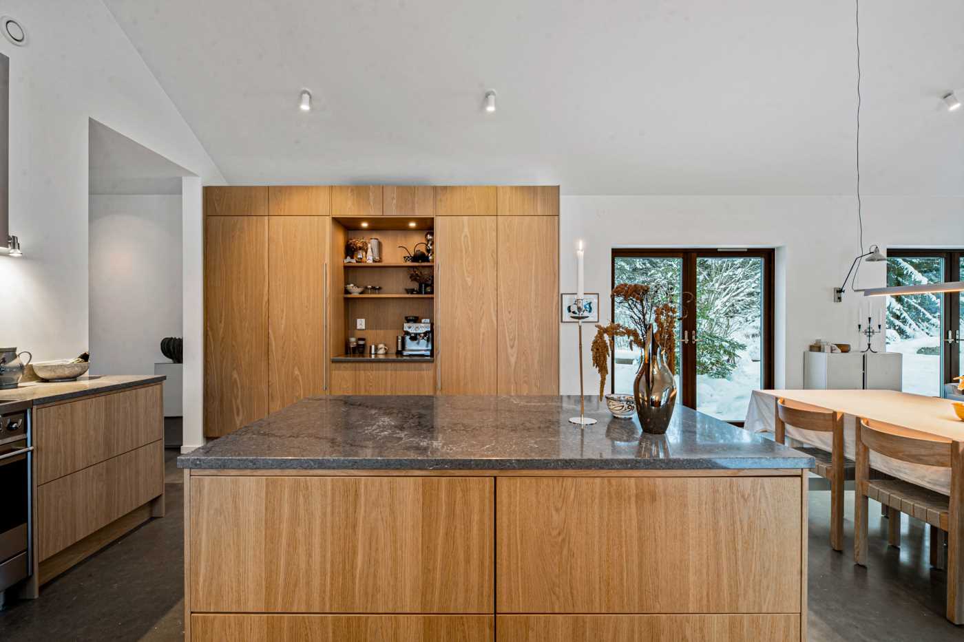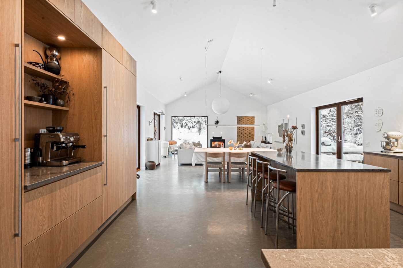Det stilrena köket från Vedum har luckor i vitlaserad ek och vackra arbetsbänkar i kompositsten från Dekker Nordic, här finns många genomtänkta och påkostade detaljer. Köket har arbetsvänlig U-form med generöst med arbetsytor och förvaring i underskåp och lådor, dessutom finns här en köksö som förutom extra arbetsyta och förvaring även har sittplats för tre. Självklart har detta kök en lyxig kaffestation och i anslutning till diskhon finns ett fönster med magisk utsikt över landskapet.