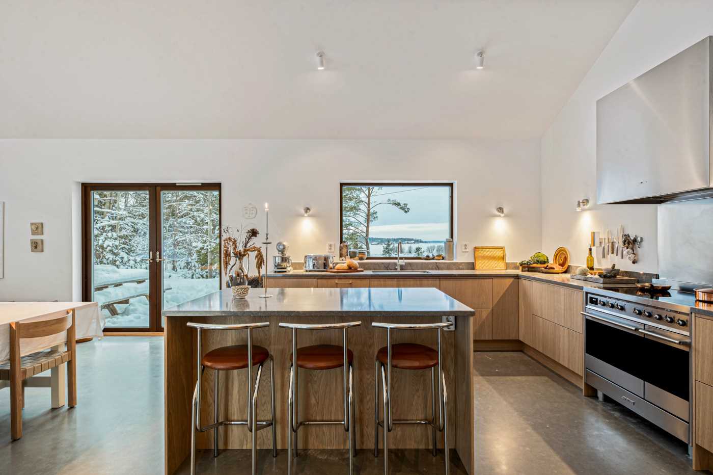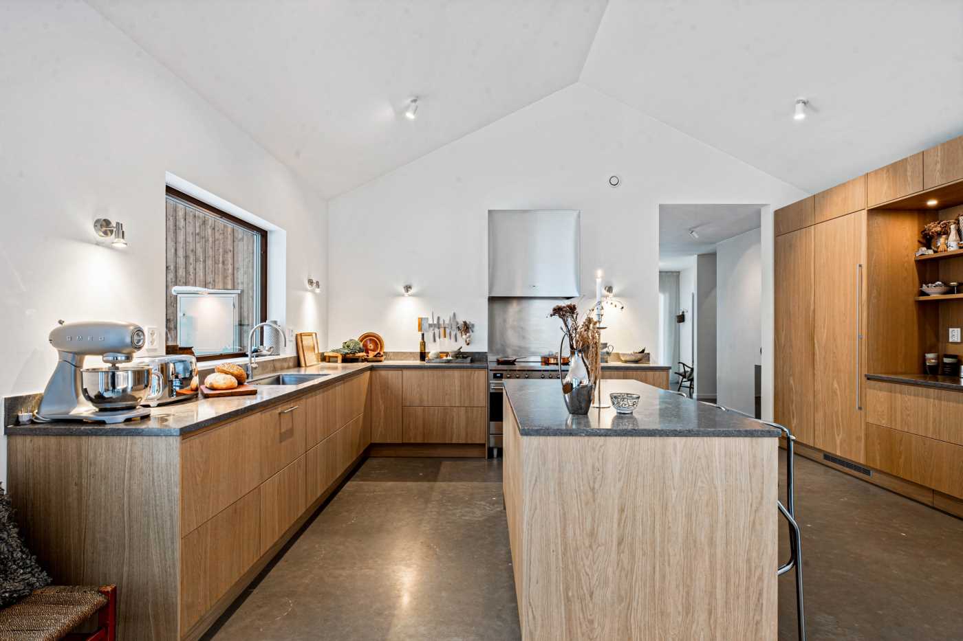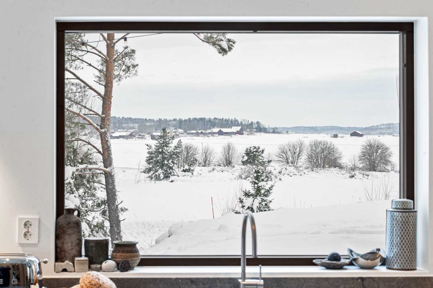 Det stilrena köket från Vedum har luckor i vitlaserad ek och vackra arbetsbänkar i kompositsten från Dekker Nordic, här finns många genomtänkta och påkostade detaljer. Köket har arbetsvänlig U-form med generöst med arbetsytor och förvaring i underskåp och lådor, dessutom finns här en köksö som förutom extra arbetsyta och förvaring även har sittplats för tre. Självklart har detta kök en lyxig kaffestation och i anslutning till diskhon finns ett fönster med magisk utsikt över landskapet.
