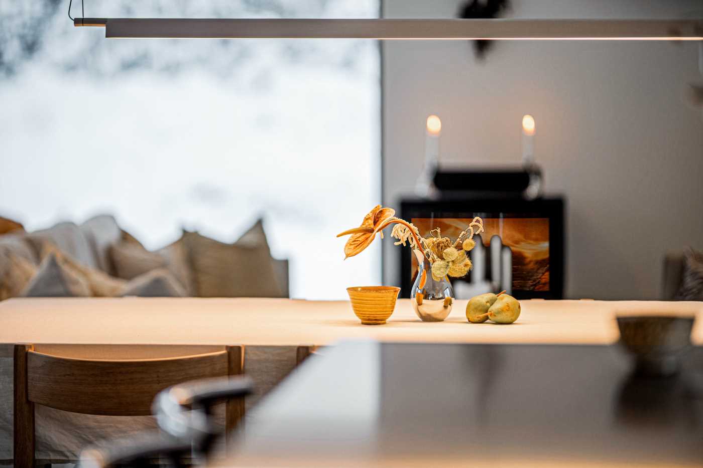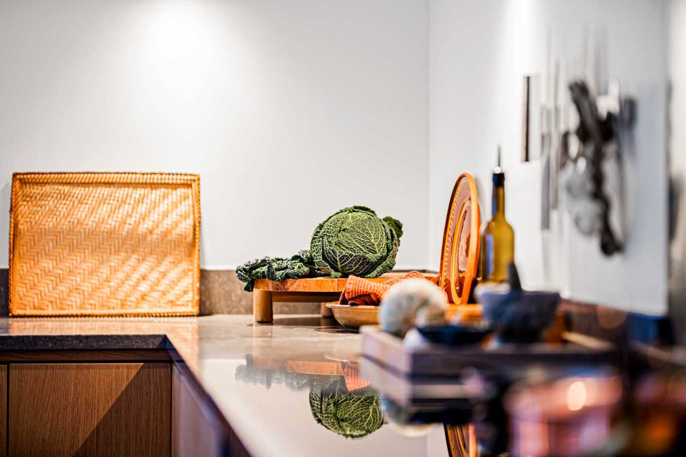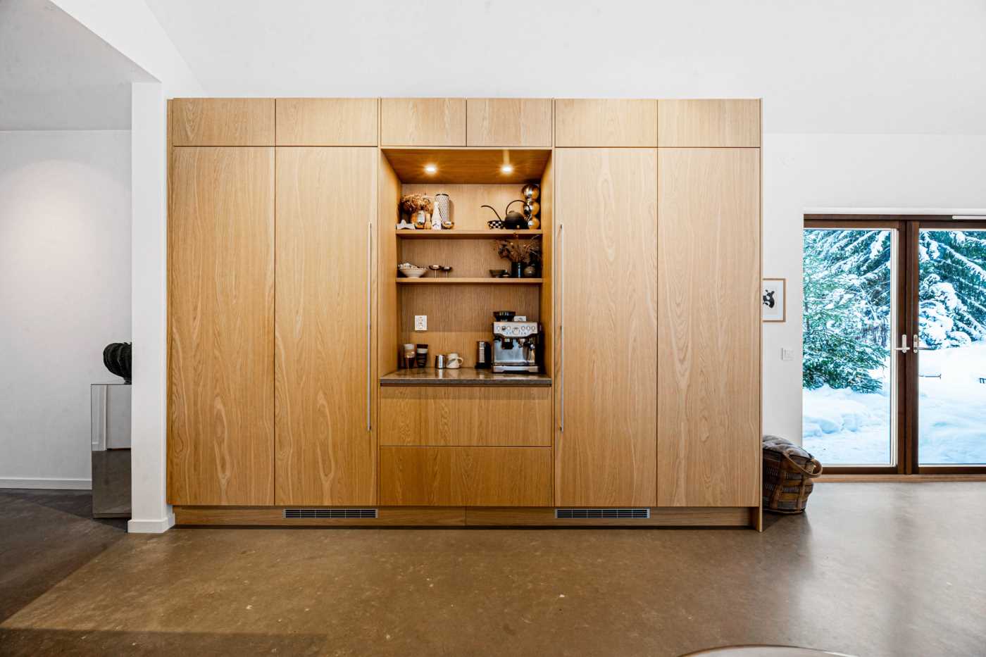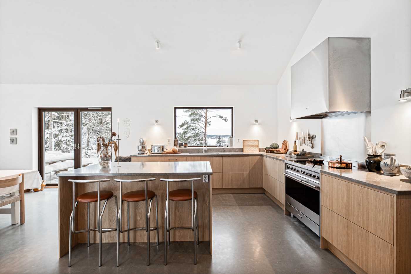 Det stilrena köket från Vedum har luckor i vitlaserad ek och vackra arbetsbänkar i kompositsten från Dekker Nordic, här finns många genomtänkta och påkostade detaljer. Köket har arbetsvänlig U-form med generöst med arbetsytor och förvaring i underskåp och lådor, dessutom finns här en köksö som förutom extra arbetsyta och förvaring även har sittplats för tre. Självklart har detta kök en lyxig kaffestation och i anslutning till diskhon finns ett fönster med magisk utsikt över landskapet.