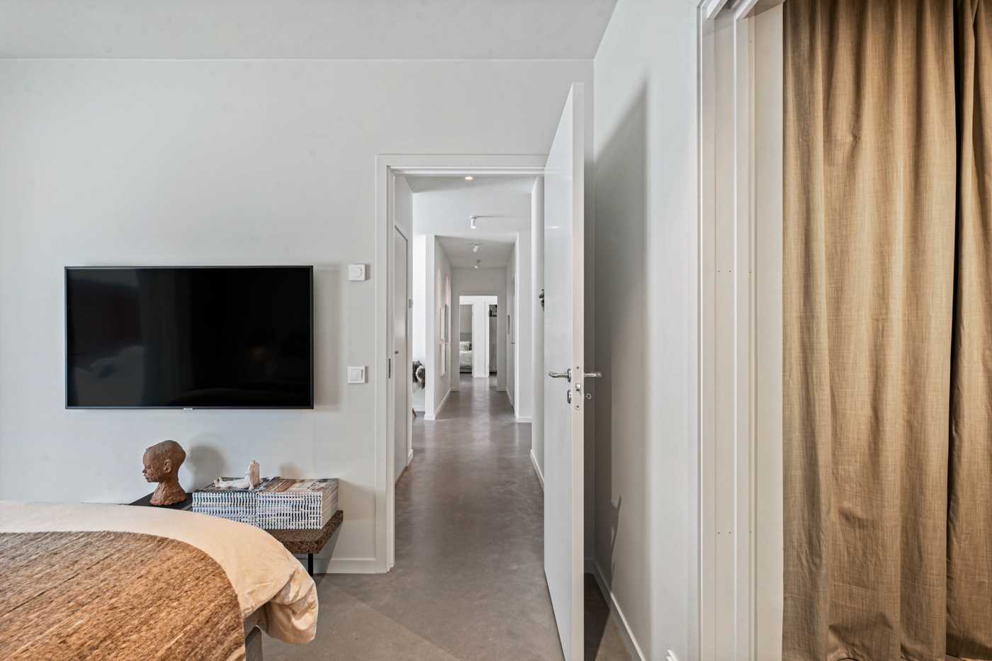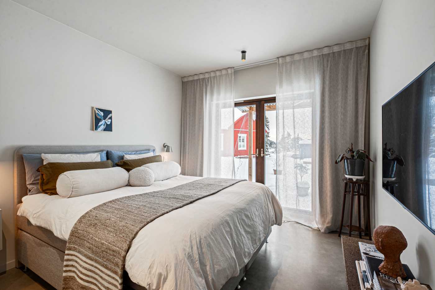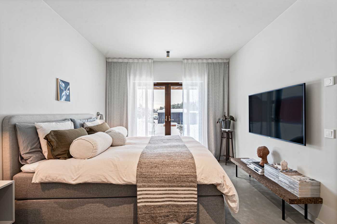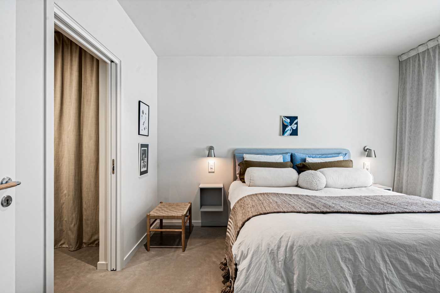 Master bedroom med vackert ljusinsläpp via helglasade pardörrar som leder ut till mindre uteplats i form av betonggolv med tak. Via en skjutdörr nås ett dressingroom som även erbjuder plats för en bra kontorsplats. Vita väggar och betonggolv. Sänglamporna är fast monterade, även spotlighten i taket och ingår i köpet precis som det två eluttagen med både USB-A och USB-C uttag hör till huset.