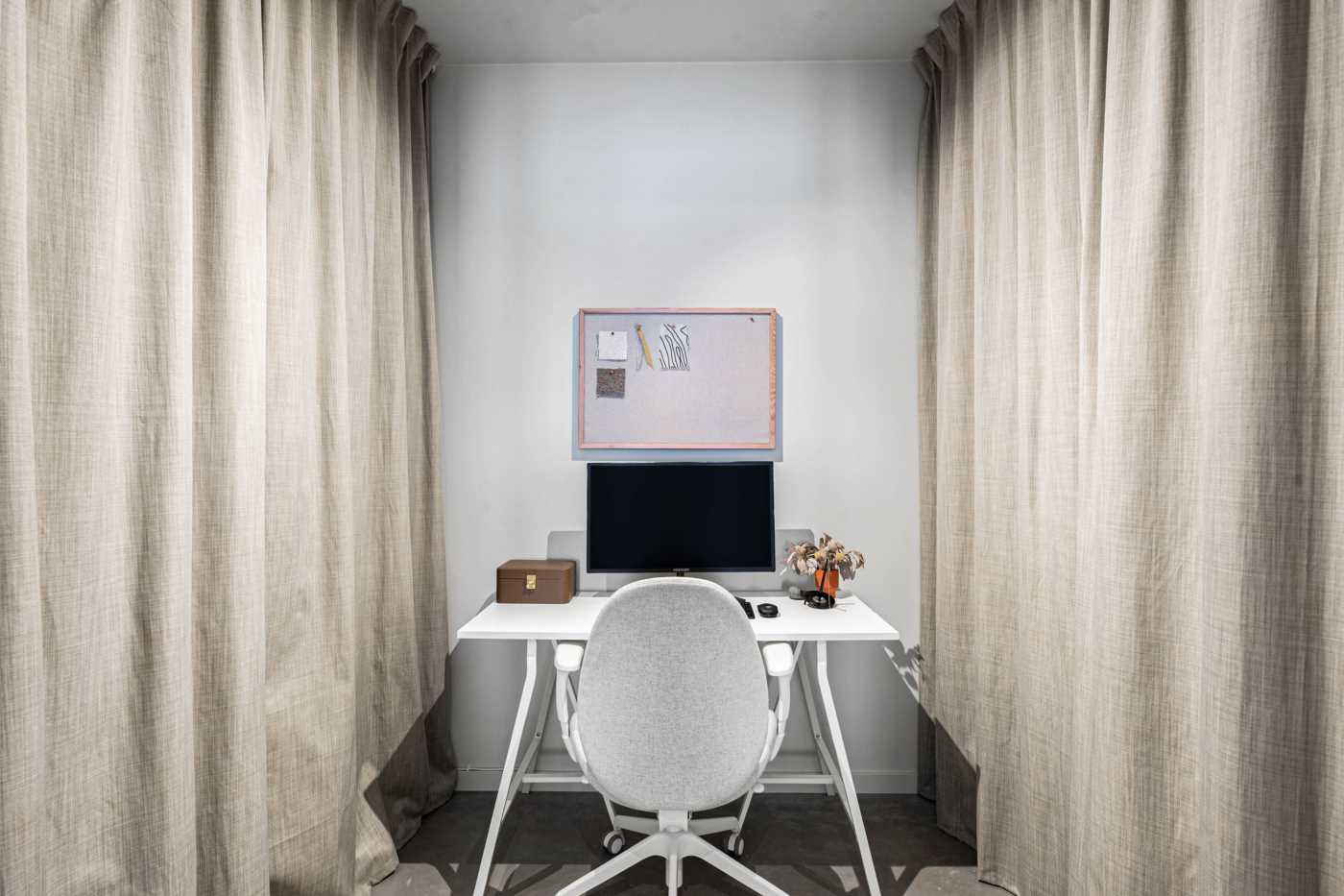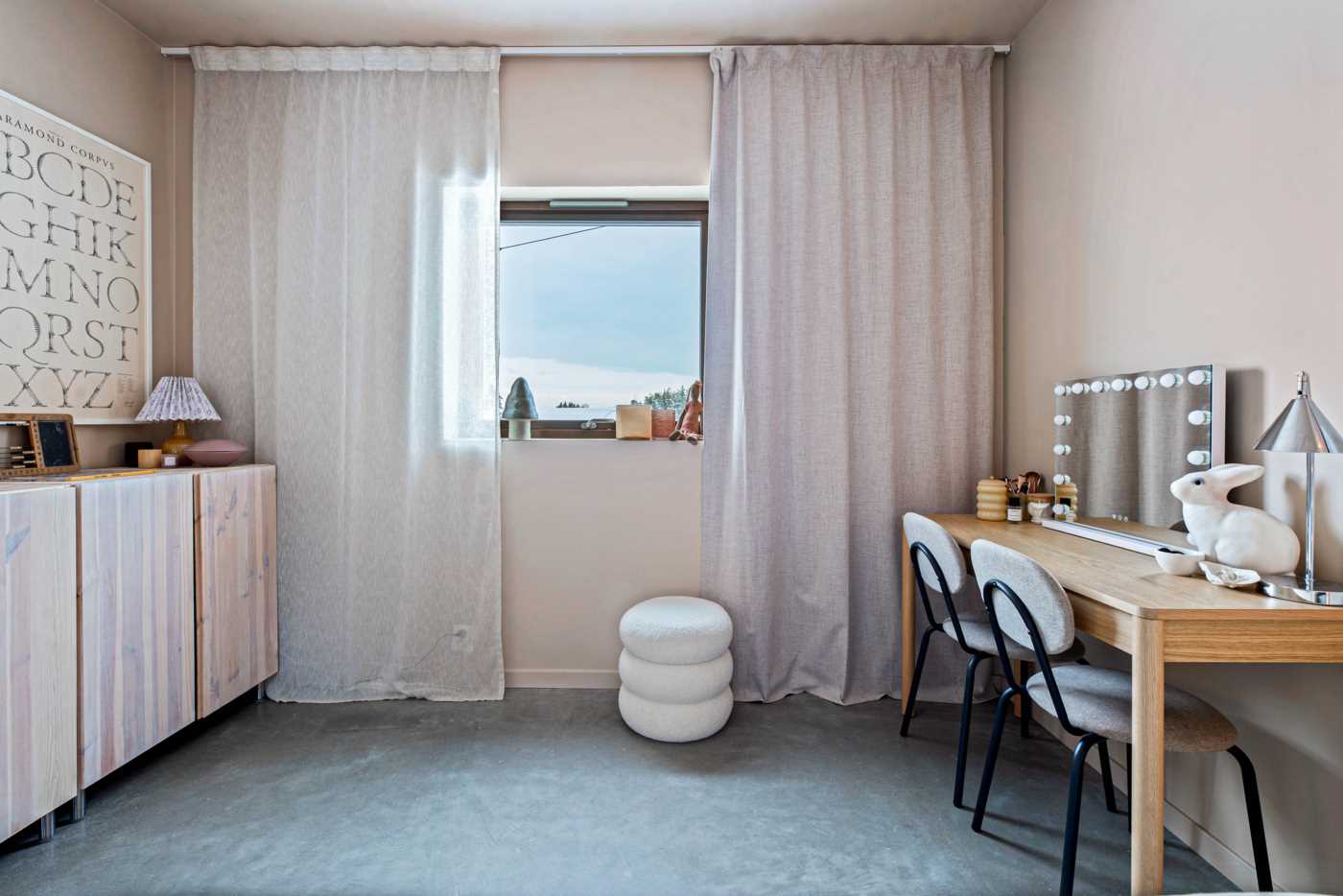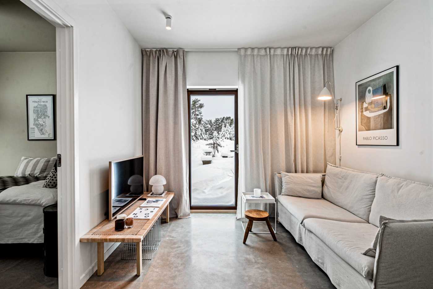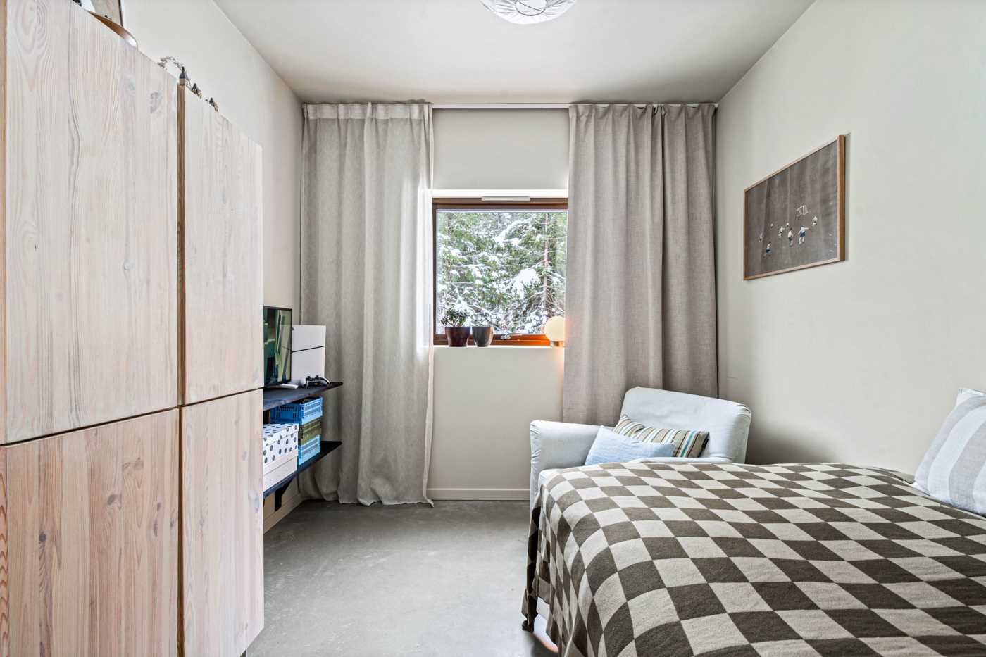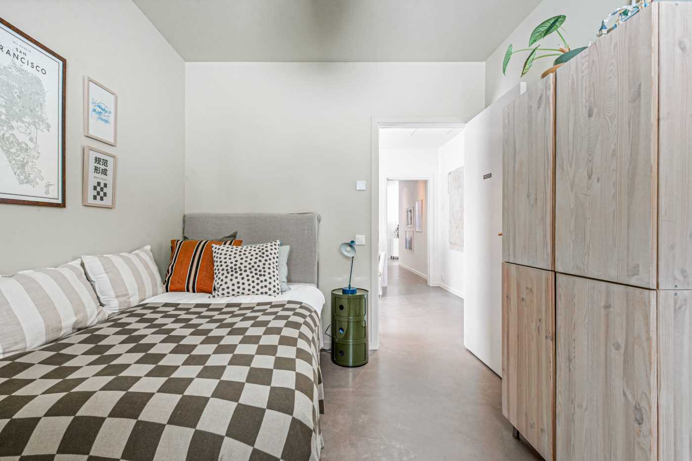 Master bedroom med vackert ljusinsläpp via helglasade pardörrar som leder ut till mindre uteplats i form av betonggolv med tak. Via en skjutdörr nås ett dressingroom som även erbjuder plats för en bra kontorsplats. Vita väggar och betonggolv. Sänglamporna är fast monterade, även spotlighten i taket och ingår i köpet precis som det två eluttagen med både USB-A och USB-C uttag hör till huset.