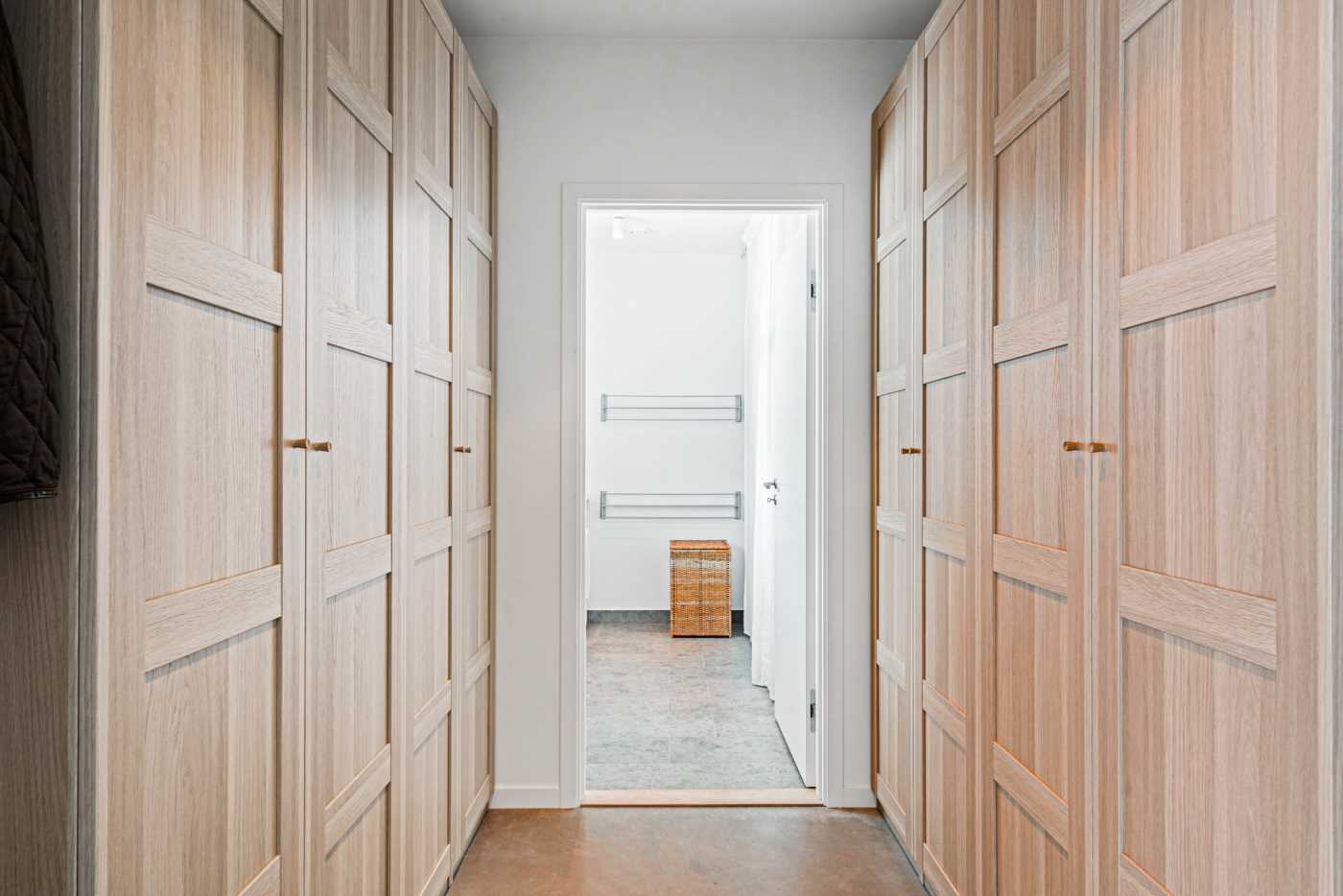 I anslutning till entrén finns ett kapprum med generös förvaring i både två hatthyllor och fyra dubbla garderober (från IKEA). Vita väggar och betonggolv.