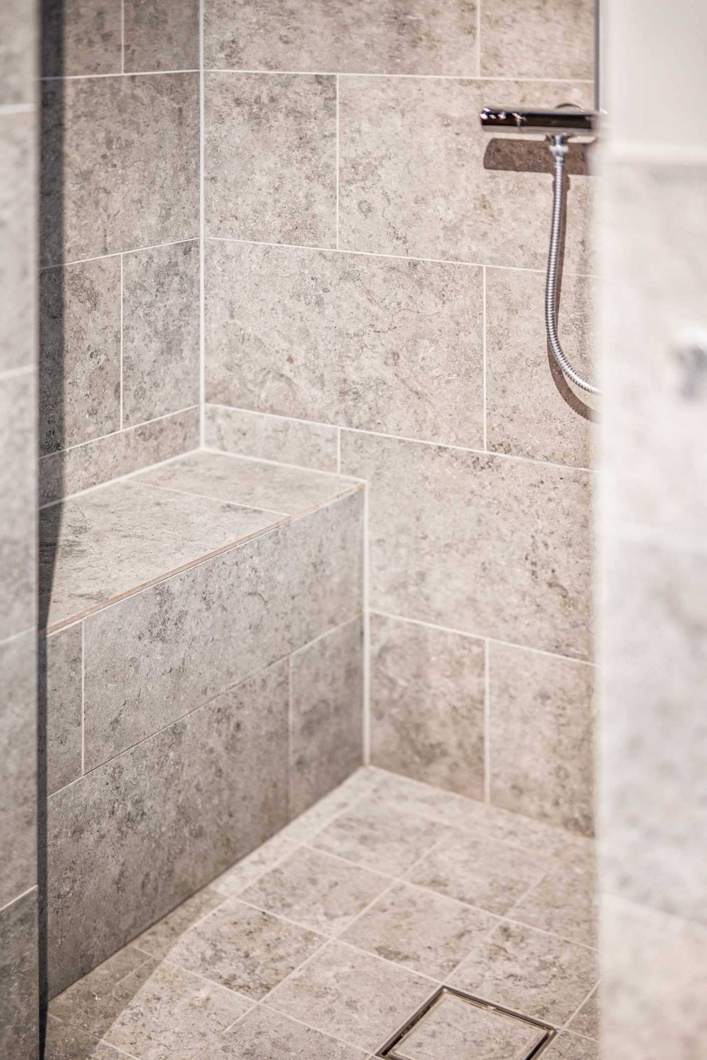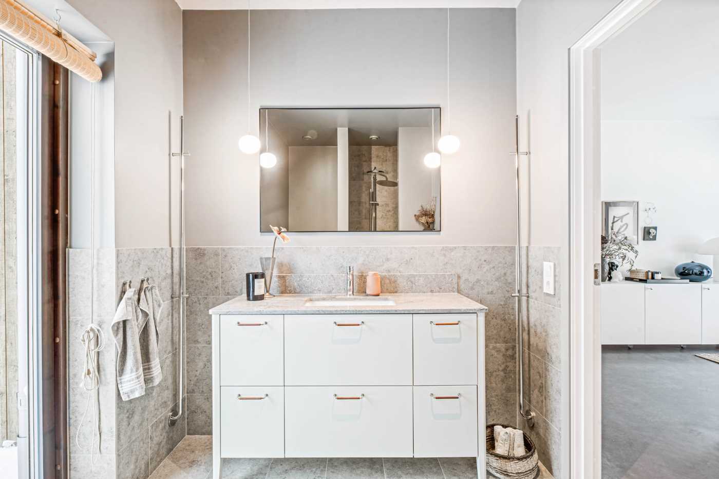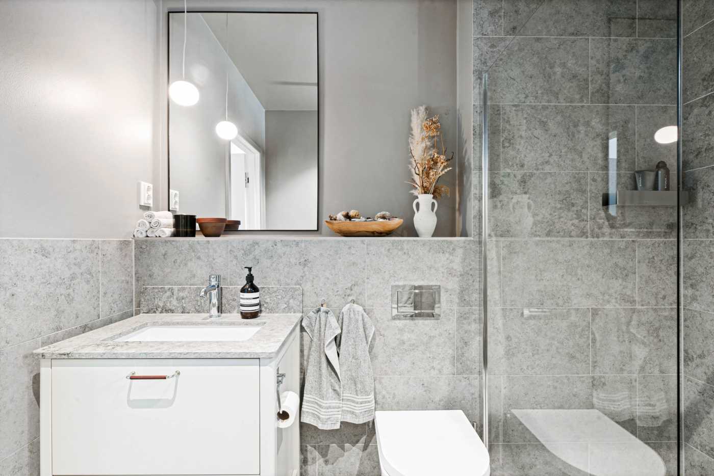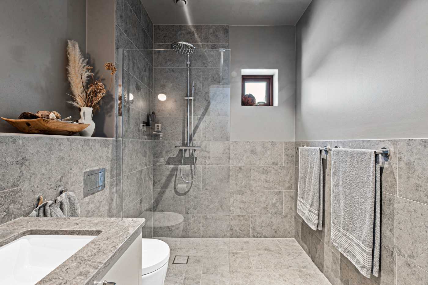 Sobert duschrum i gråbeige toner med med matchande kakel på golv och till brösthöjd på väggar, ovan kaklet är väggarna och taket målade ton i ton med kaklet. Duschrummet är utrustat med helkaklad duschhörna med stilren avgränsande glasvägg, spegel ovan kommod från Vedum med kompositsten från Dekker Nordic och infällt handfat samt vägghängd wc.