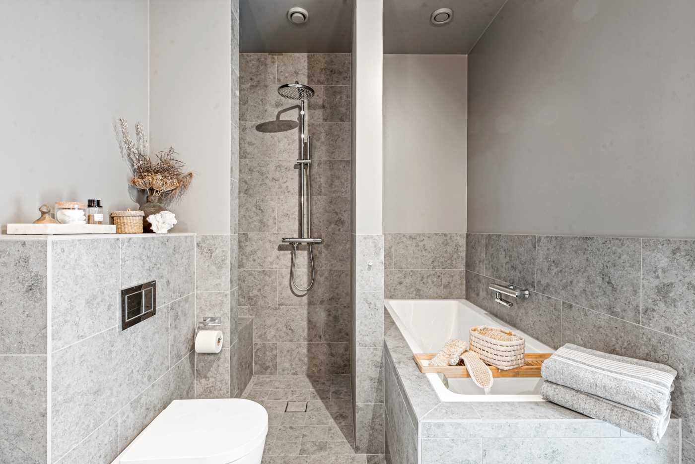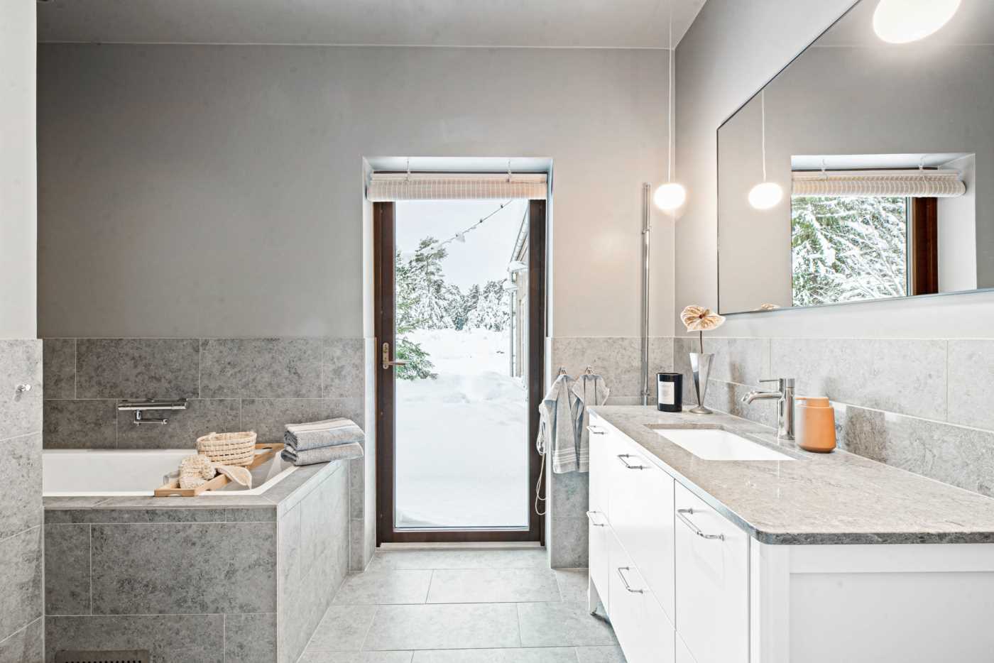 Badrum med samma vackra och stilrena materialval och färgsättning som i duschrummet. Här finns både ett inkaklat badkar och en lyxig duschnisch med kaklad sittbänk och infällda nischer. Ovanför den generösa kommoden från Vedum med kompositsten från Dekker Nordic och infällt handfat finns en stor spegel. Badrummet är även utrustat med vägghängd wc, spotlights i tak och två stycken handdukstorkar. En helglasad dörr leder ut till den inbjudande uteplatsen.
