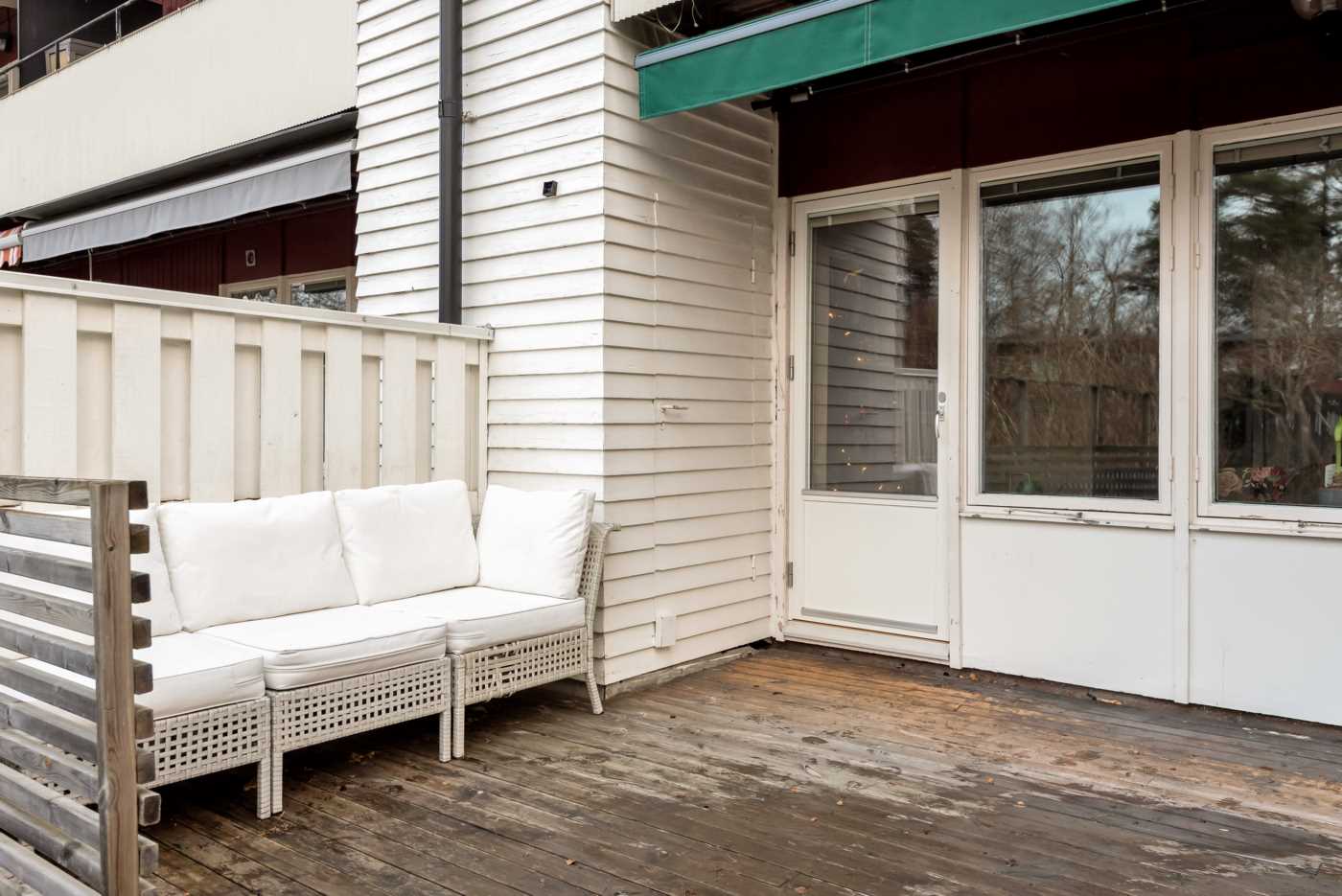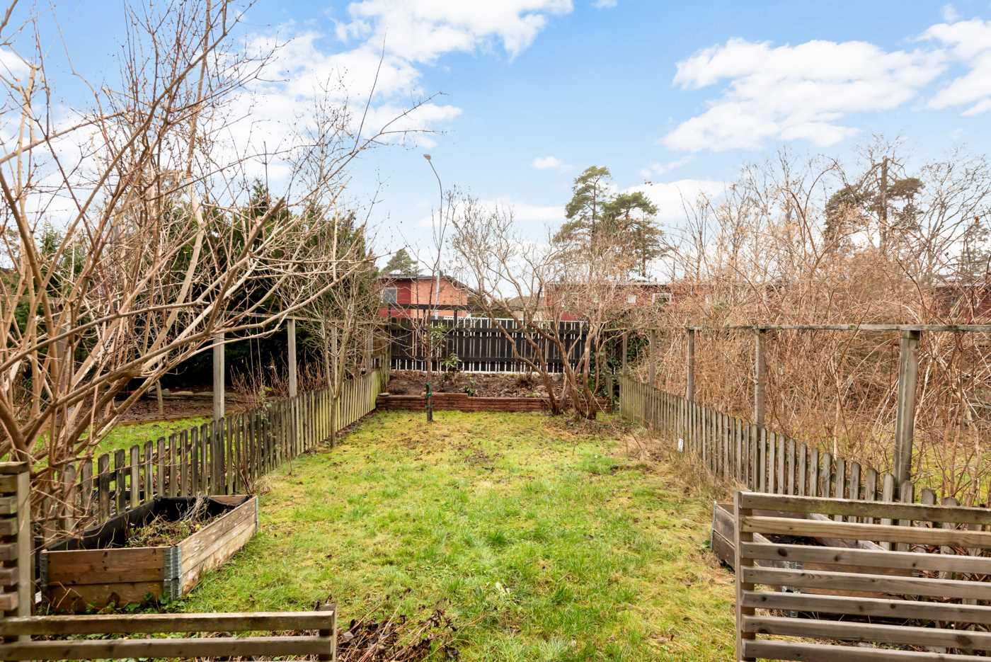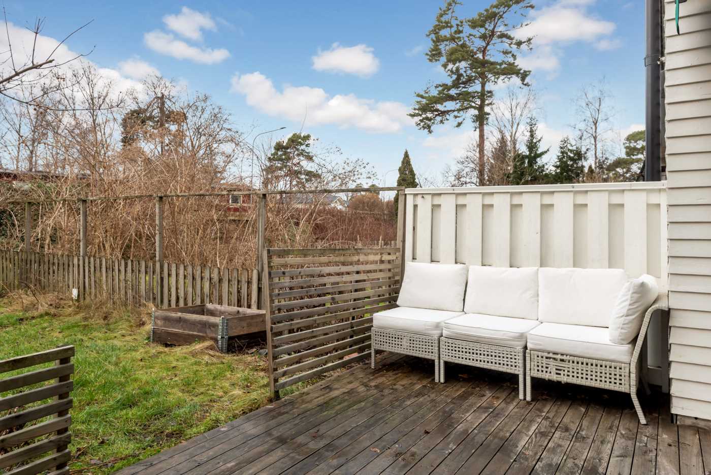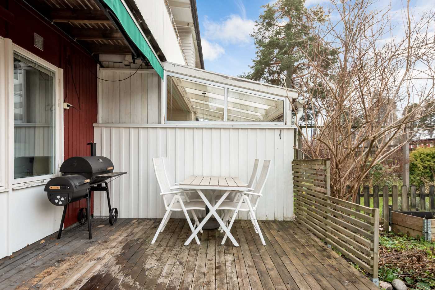 Sommartid kan ni spendera mycket tid på den egna uteplatsen som är belägen i fördelaktigt solläge mot sydväst och har en markis. Här finns trall inunder tak att placera möbelgrupper på, en lättskött trädgård med plats för egen odling samtidigt plats för barnens lek. Även på framsidan av huset finns möjlighet att njuta av utemiljön och grönytan.