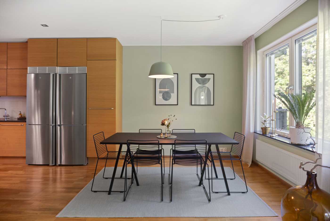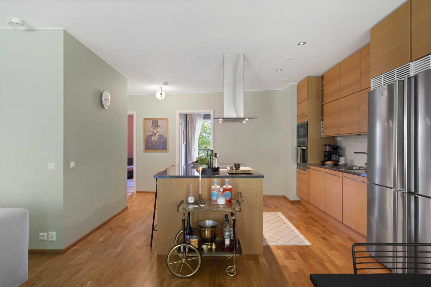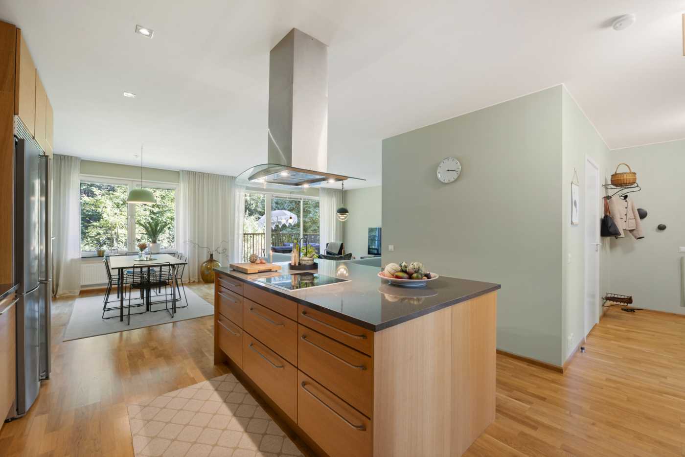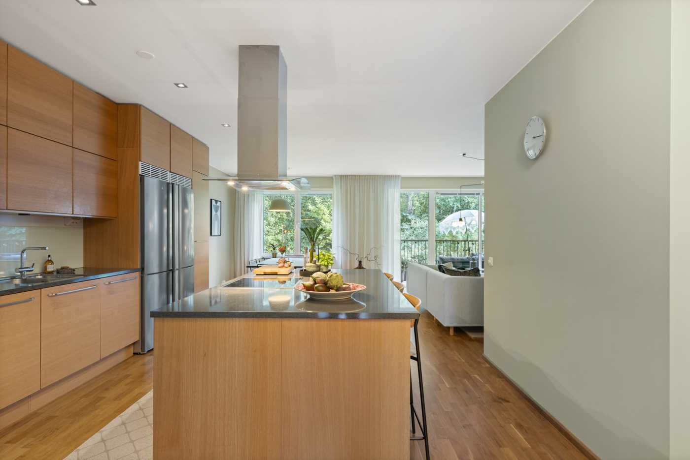 Från entrén är det öppen planlösning mot köket med stor arbetsvänlig köksö där induktionshällen är placerad, här finns fin arbetsyta, förvaring och trevligt barhäng med sittplats för tre. Köket har inredning från HTH med luckor i ekfanér och stänkskydd i glas ovan grå arbetsbänkar i laminat. I anslutning till köket finns plats för större matgrupp framför ett dubbelfönster med vy mot Stadsskogen. Vackert lindblomsgröna väggar, professionellt målade 2023 och ekparkett på golv.