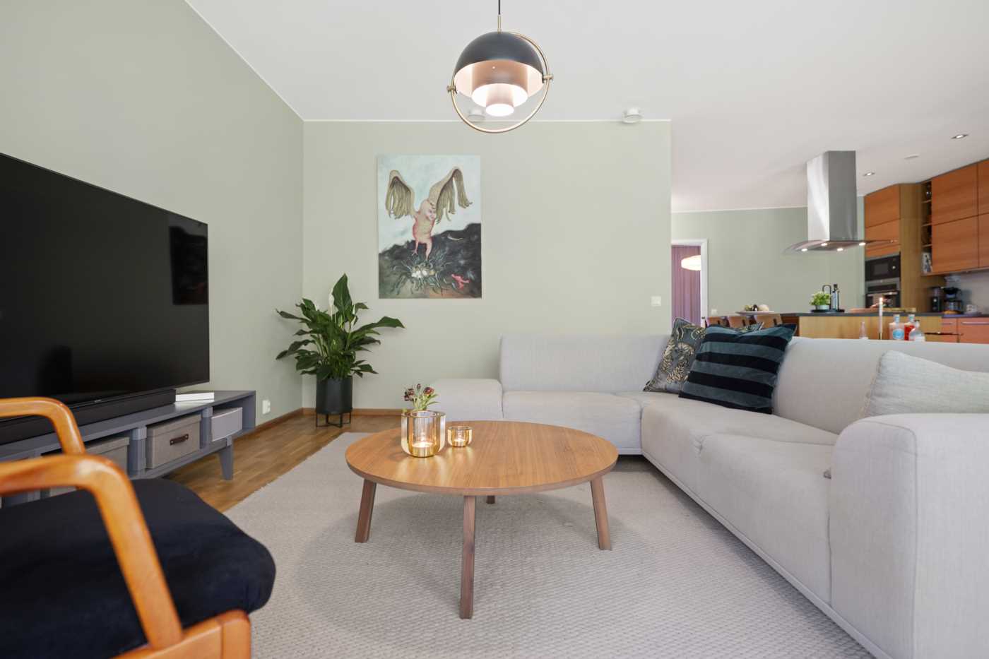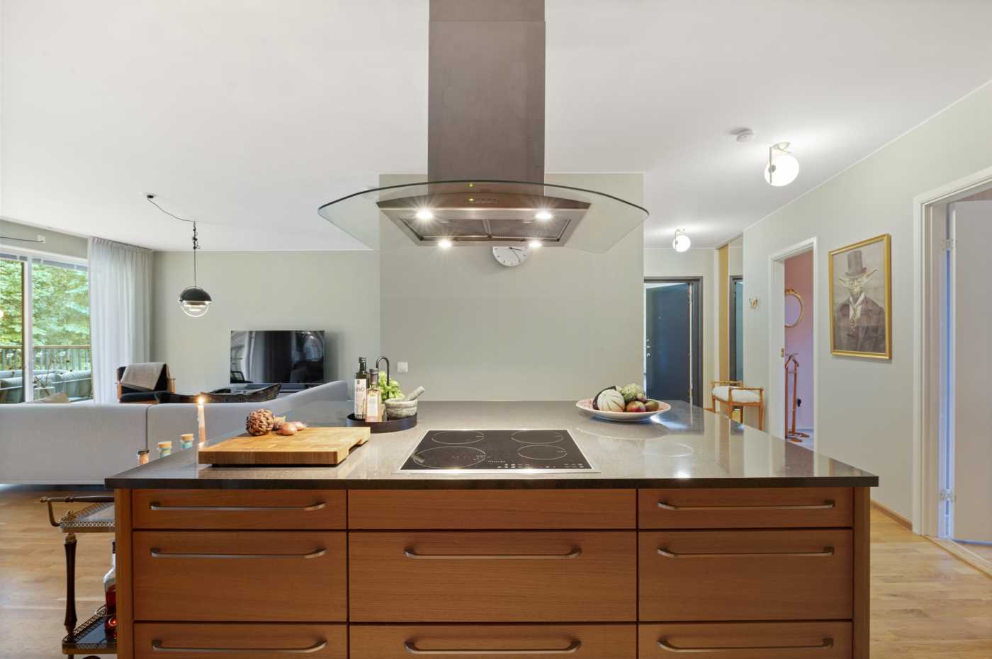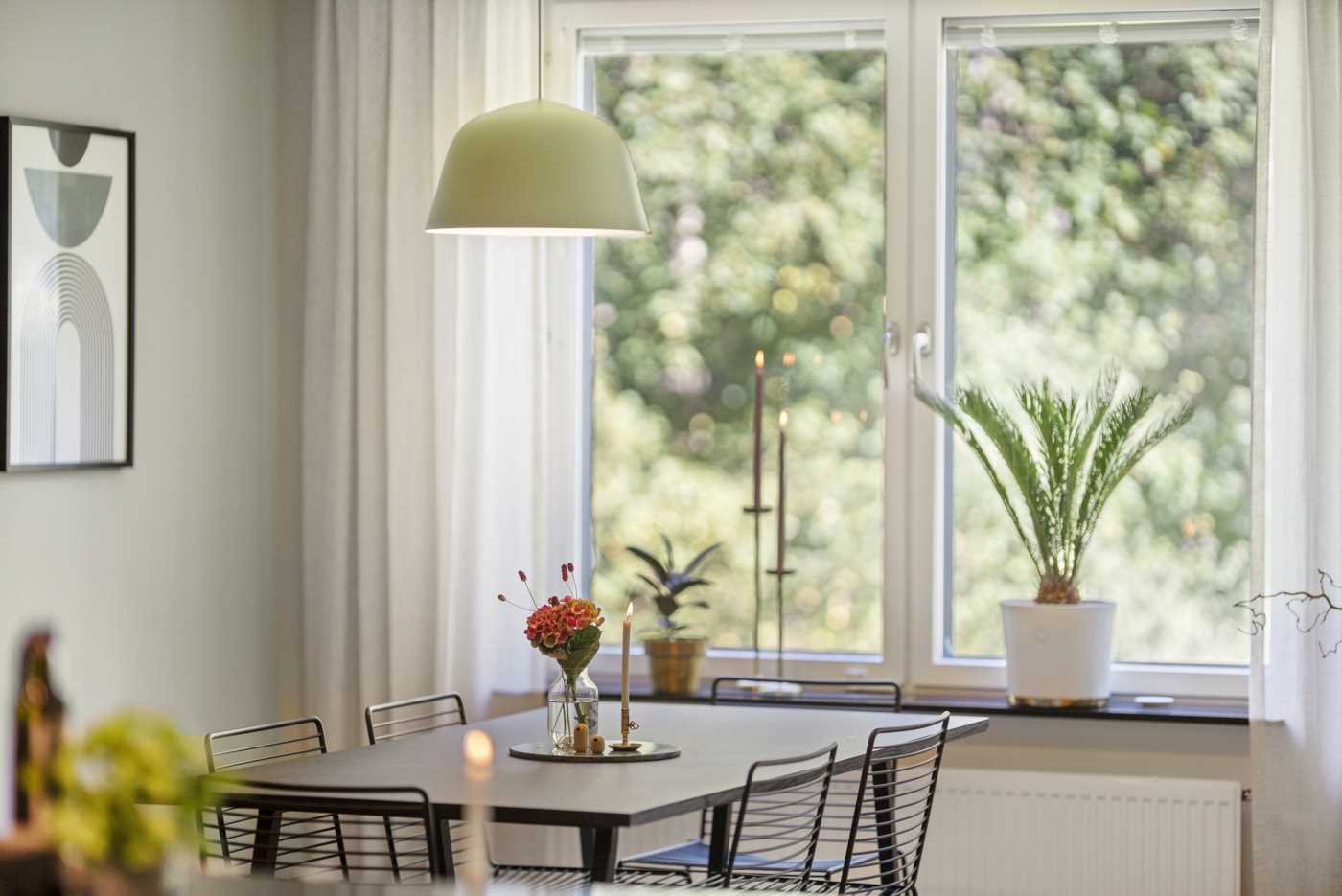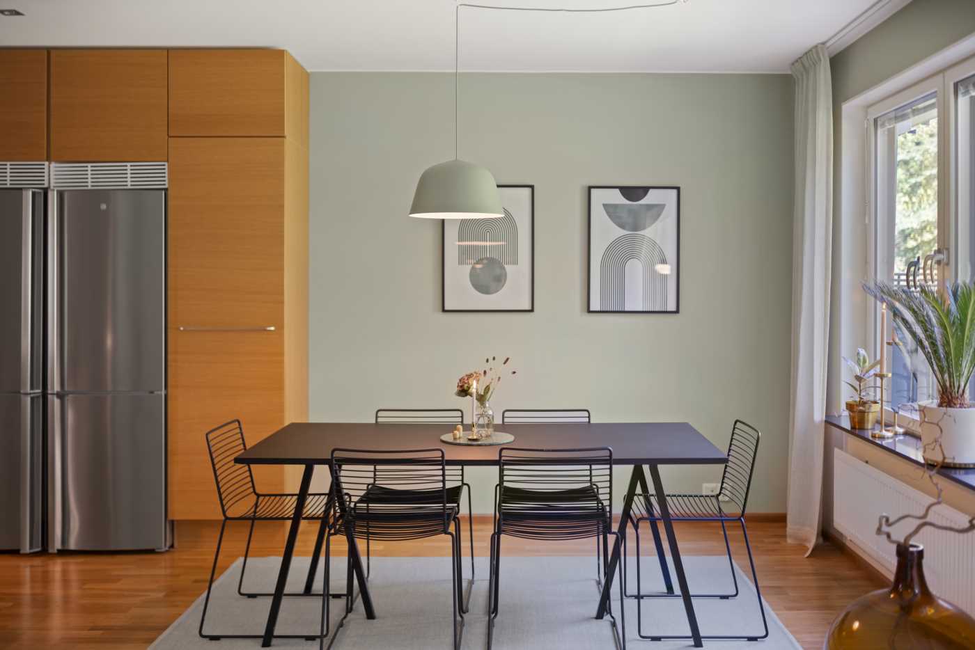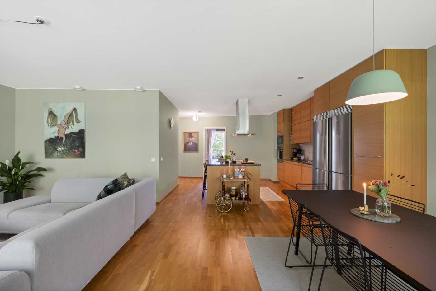 Från entrén är det öppen planlösning mot köket med stor arbetsvänlig köksö där induktionshällen är placerad, här finns fin arbetsyta, förvaring och trevligt barhäng med sittplats för tre. Köket har inredning från HTH med luckor i ekfanér och stänkskydd i glas ovan grå arbetsbänkar i laminat. I anslutning till köket finns plats för större matgrupp framför ett dubbelfönster med vy mot Stadsskogen. Vackert lindblomsgröna väggar, professionellt målade 2023 och ekparkett på golv.