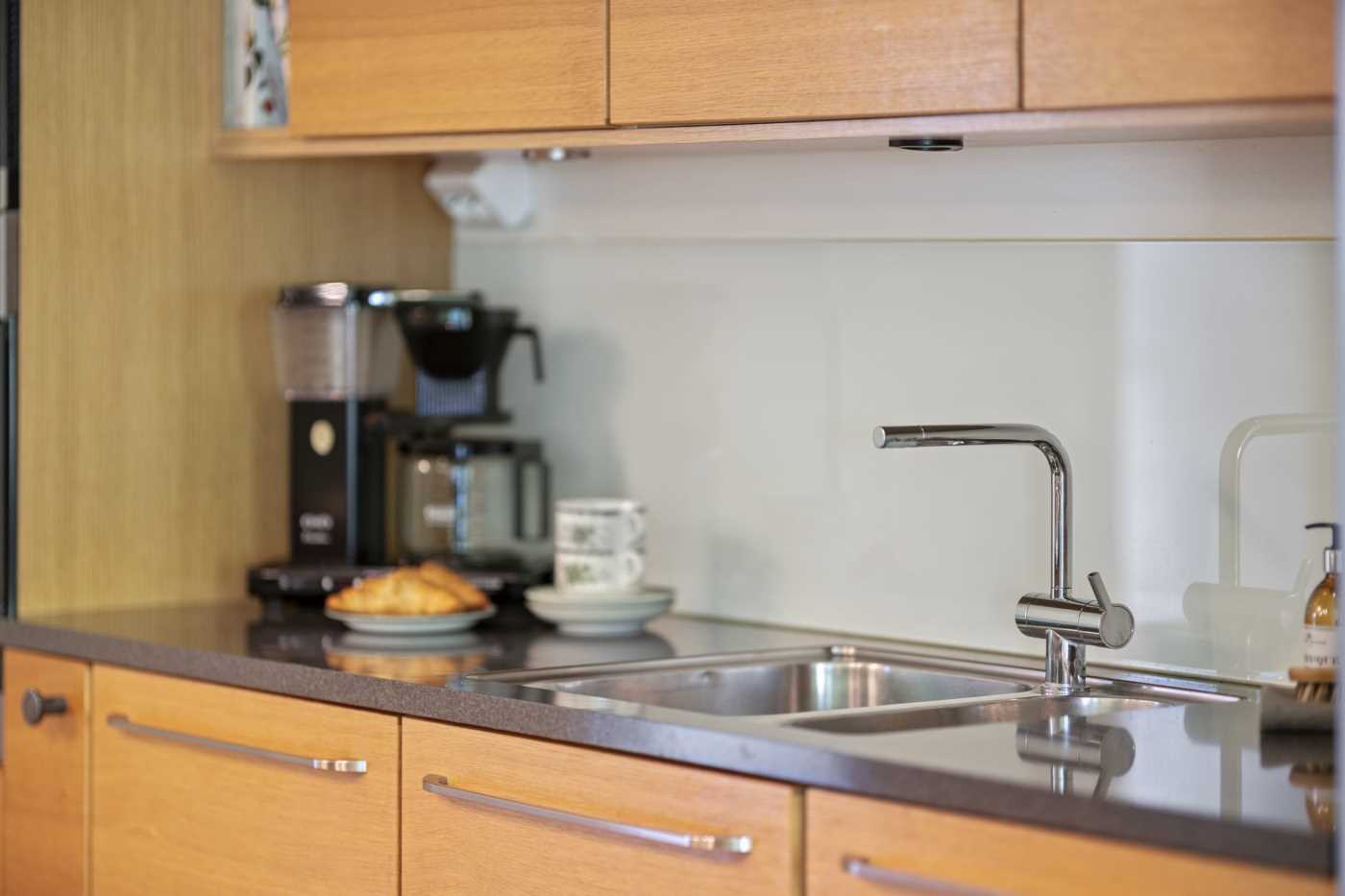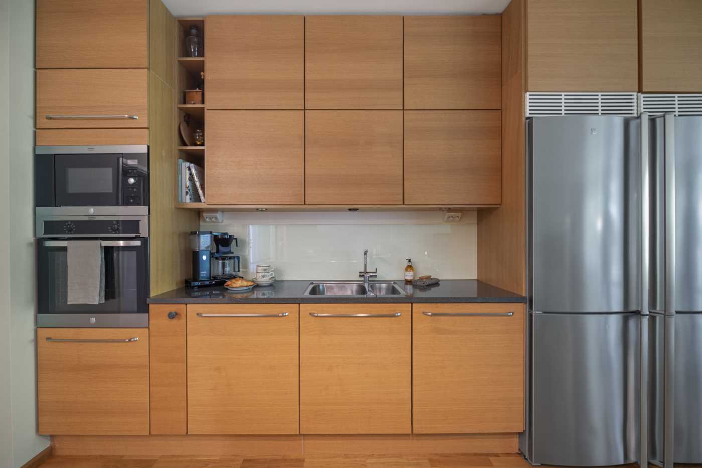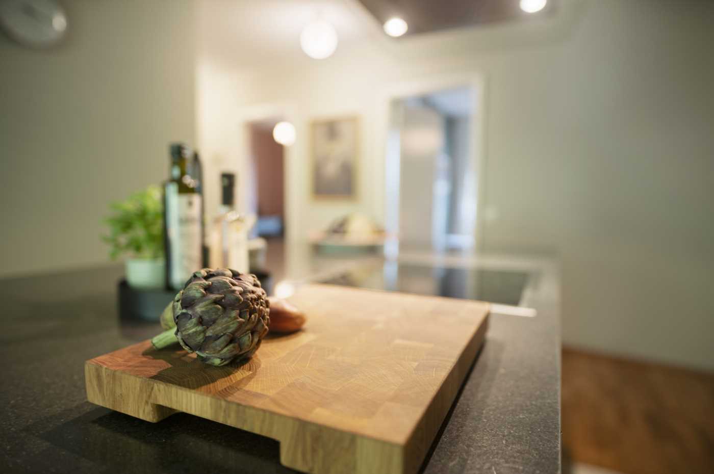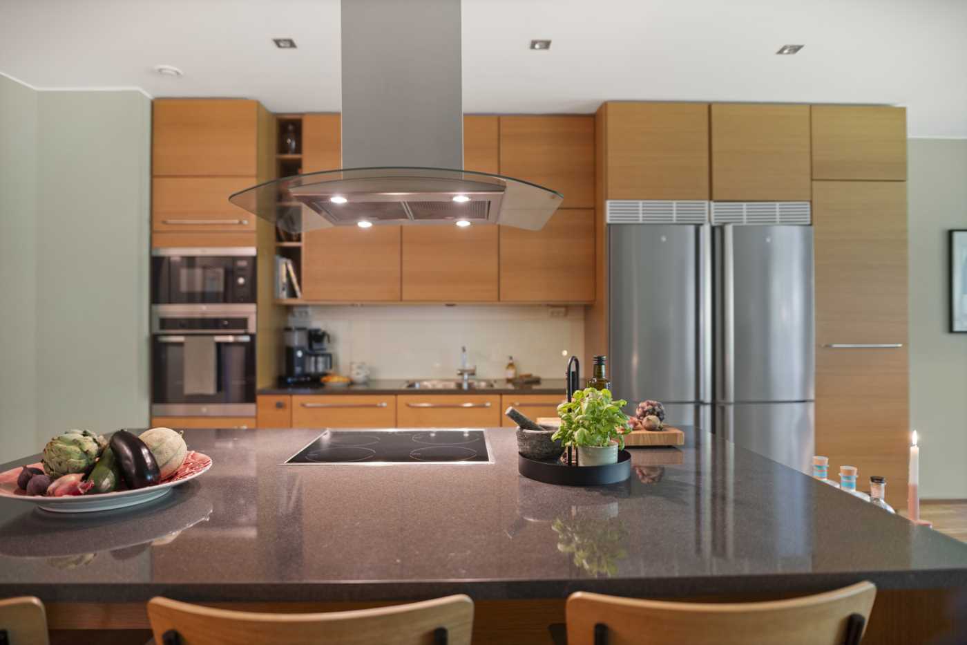 Från entrén är det öppen planlösning mot köket med stor arbetsvänlig köksö där induktionshällen är placerad, här finns fin arbetsyta, förvaring och trevligt barhäng med sittplats för tre. Köket har inredning från HTH med luckor i ekfanér och stänkskydd i glas ovan grå arbetsbänkar i laminat. I anslutning till köket finns plats för större matgrupp framför ett dubbelfönster med vy mot Stadsskogen. Vackert lindblomsgröna väggar, professionellt målade 2023 och ekparkett på golv.