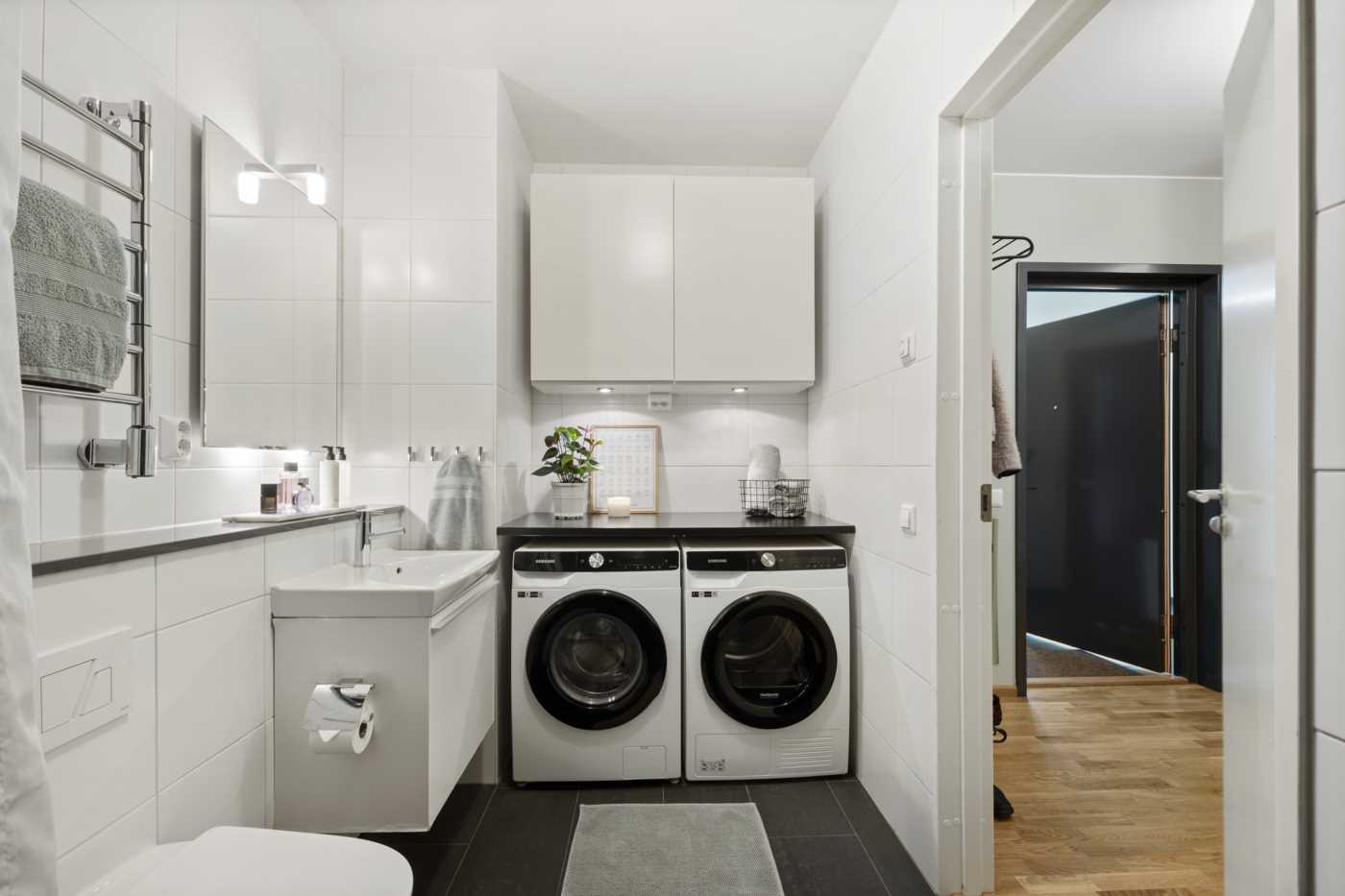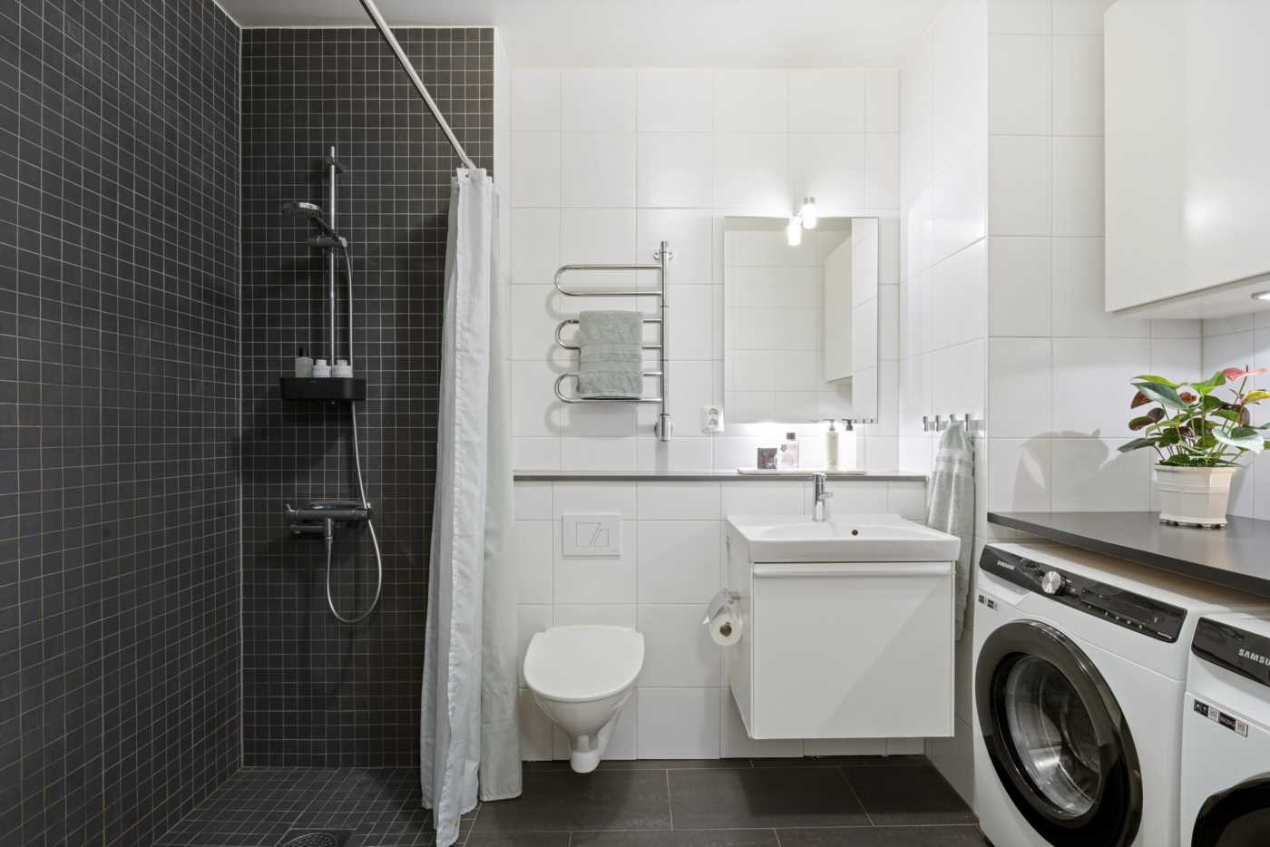 Rymligt och stilrent duschrum med vitt kakel på väggar och klinker i stilfull grå nyans på golvet med matchande mosaik i duschen. Här finns en spegel med belysning ovan en kommod, duschplats bakom draperi (med plats för ett badkar), handdukstork samt vägghängd wc. Tvättsektion med tvättmaskin och torktumlare, båda från Samsung 2023, under arbetsbänk samt förvaring i överskåp.
