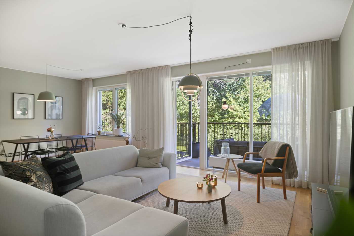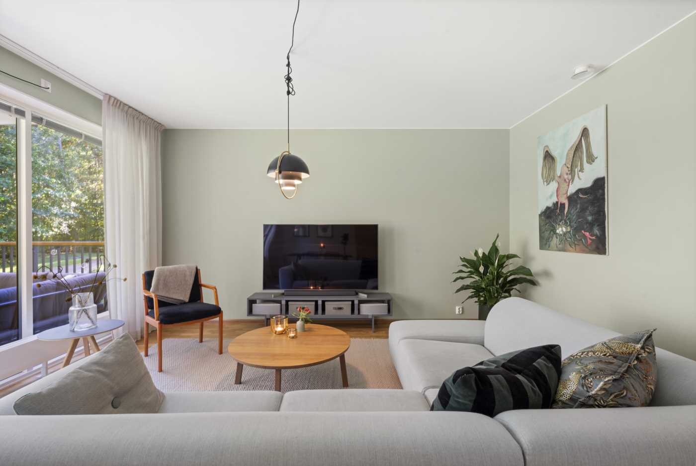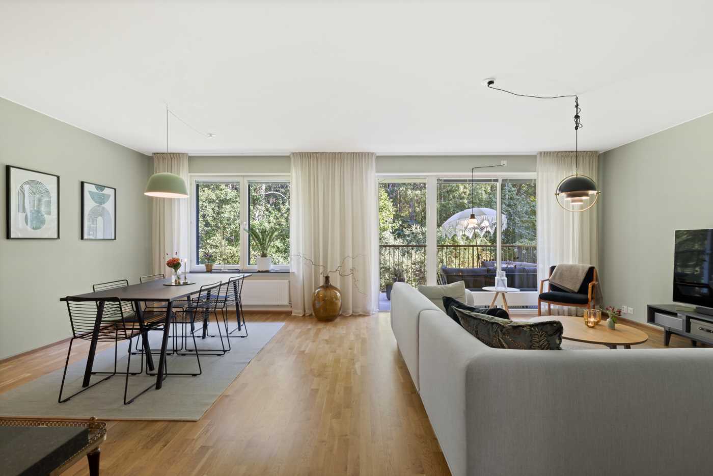 Mellan köket och vardagsrummet är det öppen planlösning i vinkel. Här finns generös plats för soffgrupp framför ett fönsterparti från golv till tak, med en helglasad dörr som leder ut till en större balkong med vy mot Stadsskogen. Lindblomsgröna väggar, professionellt målade 2023, och ekparkett på golv.