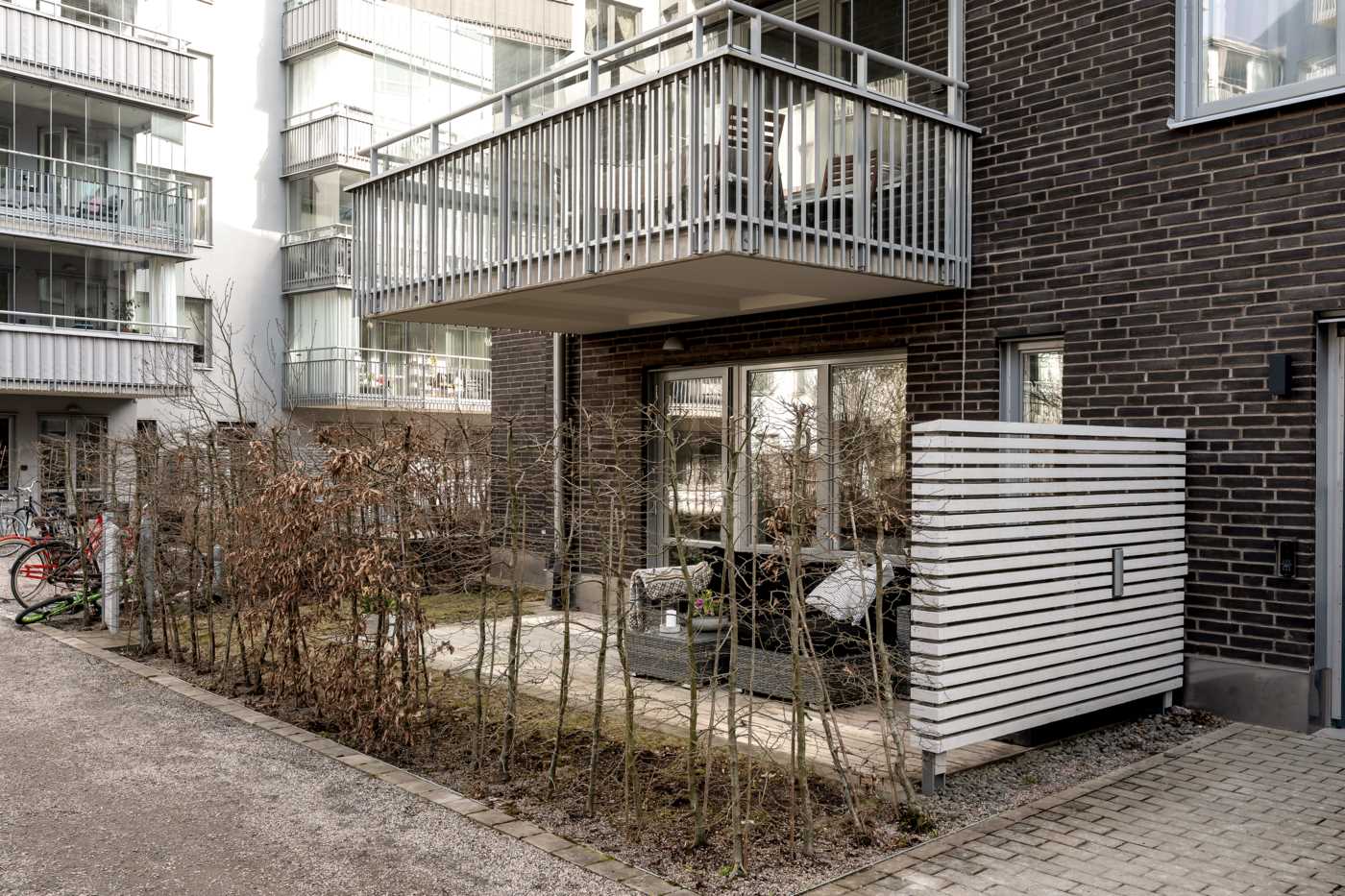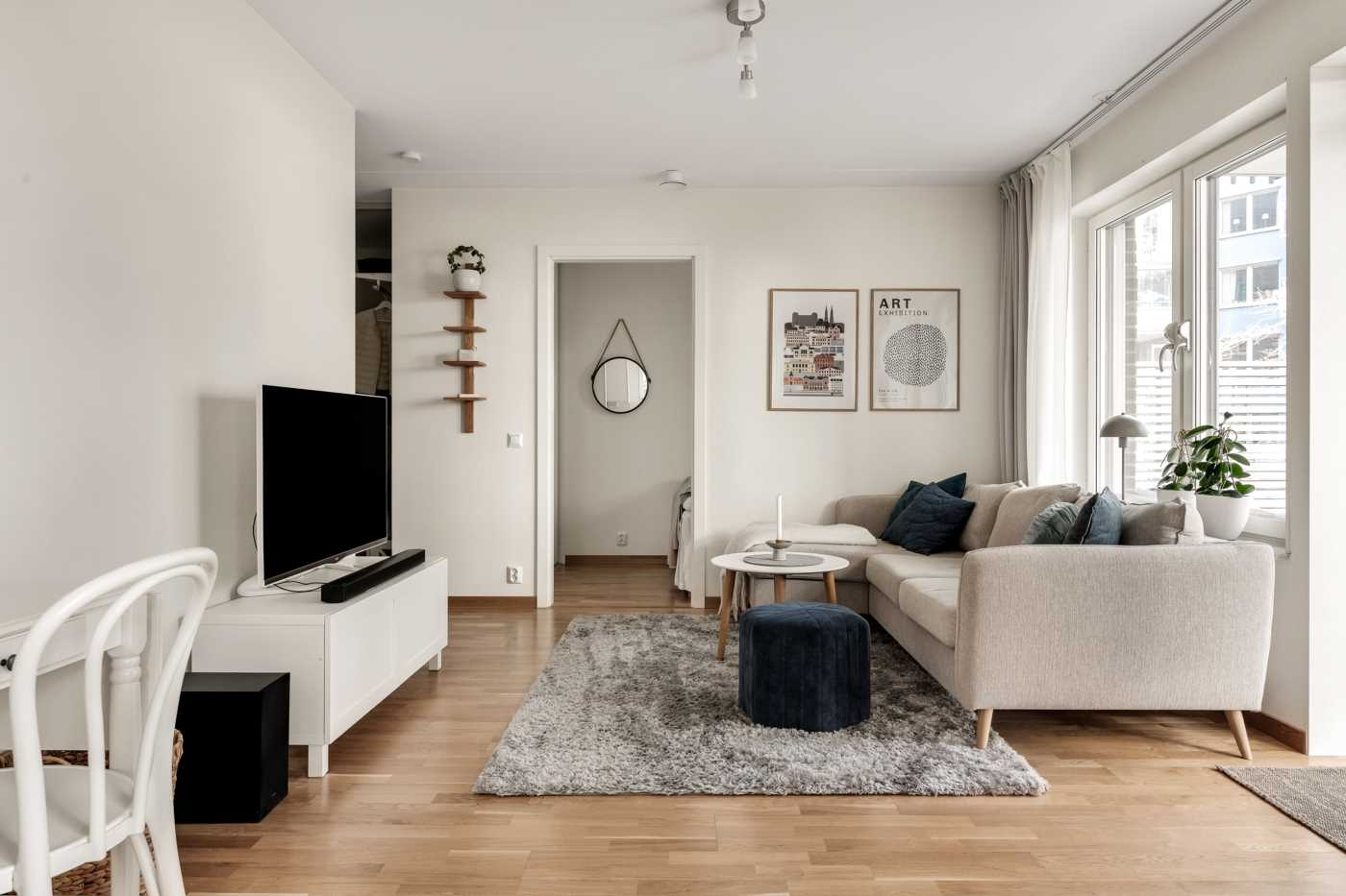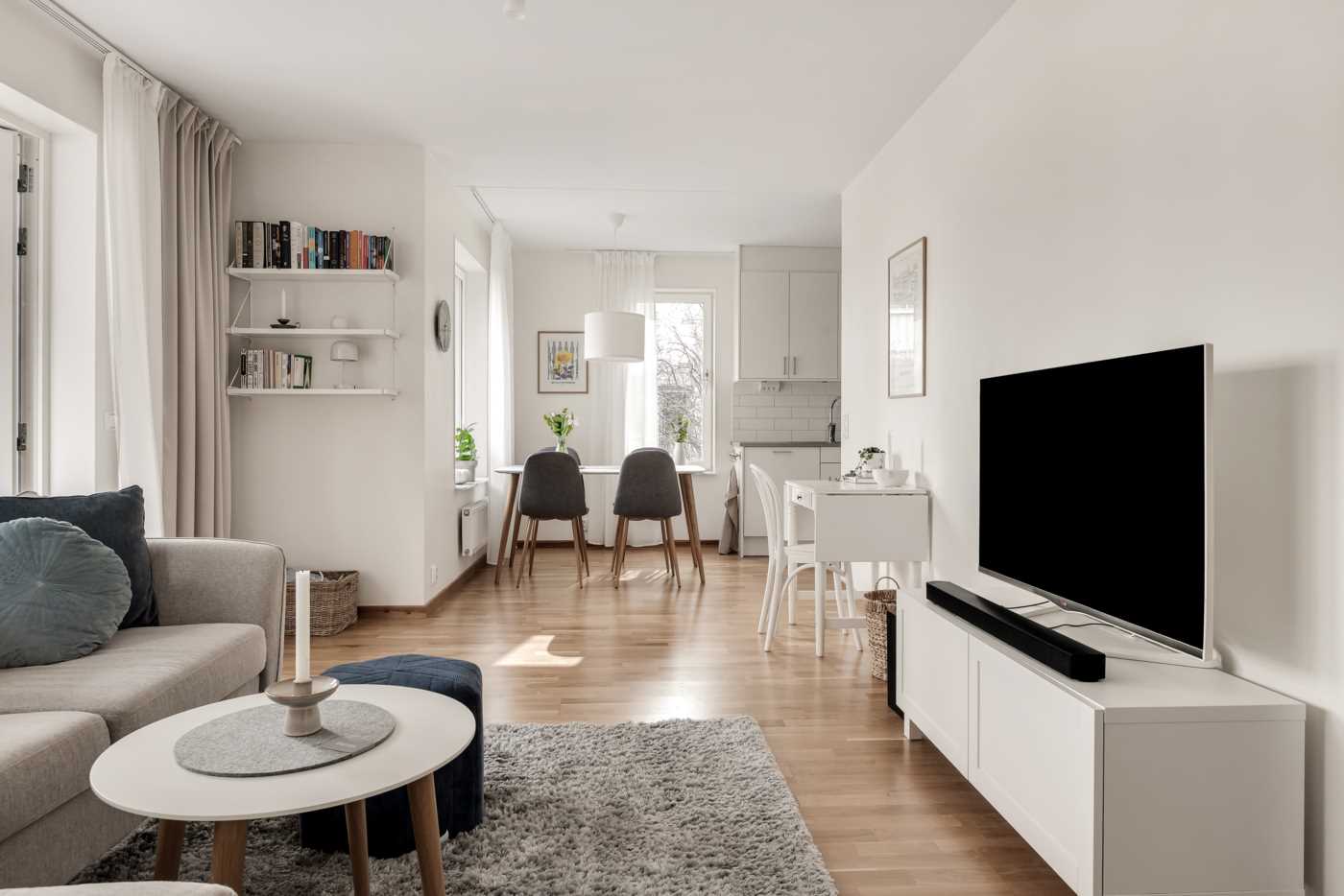 Vardagsrummet är rymligt och har plats för både TV-möbel och en soffgrupp, vilket gör det till en perfekt plats för att koppla av och njuta av en filmkväll eller bara ta det lugnt efter en lång dag. De stora fönstren ger ett fantastiskt ljusinsläpp och skapar en luftig atmosfär i rummet. Som en förlängning av vardagsrummet finns den trevliga uteplatsen som höjer mysfaktorn för denna lägenhet under sommarmånaderna för att njuta av utemiljön, här har du plats för trädgårdsmöbler men även att ha odlingslådor, häcken runt uteplatsen med sin grönska skapar en oas för avkoppling och social samvaro. Slå dig ner med en bok, ta en fika med familjen eller bara njut av att vara utomhus i en lugn och trevlig miljö.