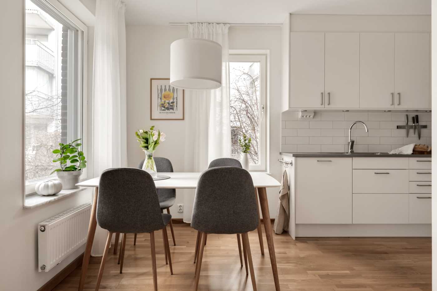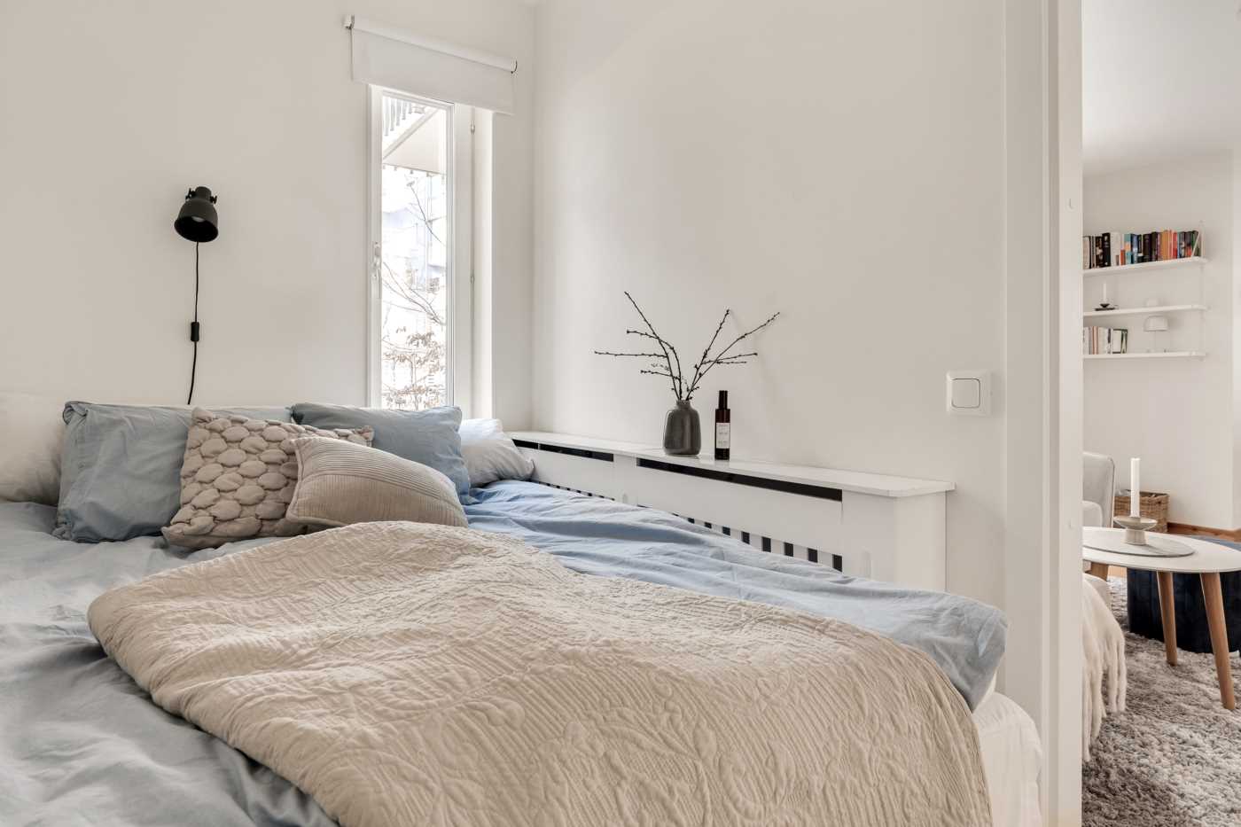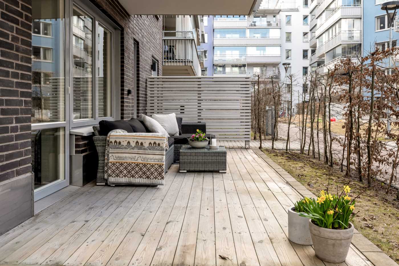 Vardagsrummet är rymligt och har plats för både TV-möbel och en soffgrupp, vilket gör det till en perfekt plats för att koppla av och njuta av en filmkväll eller bara ta det lugnt efter en lång dag. De stora fönstren ger ett fantastiskt ljusinsläpp och skapar en luftig atmosfär i rummet. Som en förlängning av vardagsrummet finns den trevliga uteplatsen som höjer mysfaktorn för denna lägenhet under sommarmånaderna för att njuta av utemiljön, här har du plats för trädgårdsmöbler men även att ha odlingslådor, häcken runt uteplatsen med sin grönska skapar en oas för avkoppling och social samvaro. Slå dig ner med en bok, ta en fika med familjen eller bara njut av att vara utomhus i en lugn och trevlig miljö.