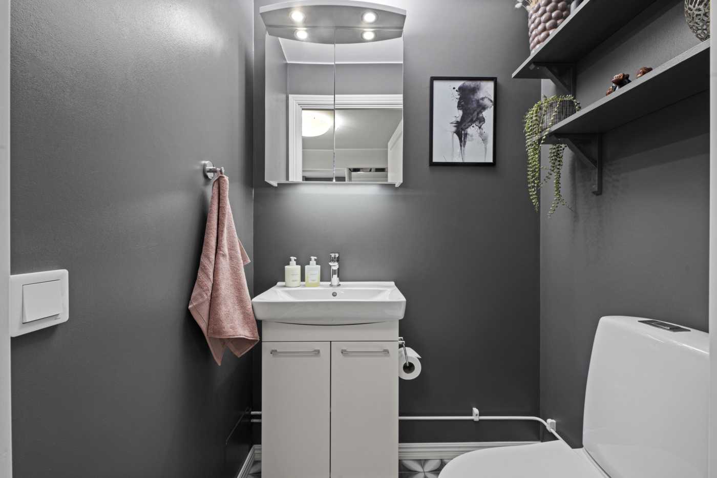 Gäst WC i anslutning till entrén med gråmålade väggar och mönstrad klinker på golv. Här finns ett spegelskåp med belysning ovan tvättställ med förvaring samt wc.