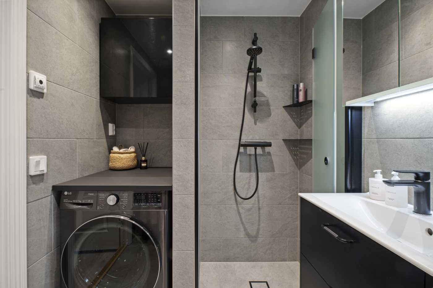 Stilrent och mycket yteffektivt duschrum med samma kakel i grå ton på väggar och golv, svarta detaljer samt infällda spotlights i tak. Här finns en duschnisch med vikbar frostad glasdörr, spegelskåp med belysning ovan tvättställ med kommod, handdukstork samt wc. Tvättsektion med arbetsbänk ovan kombinerad tvättmaskin/torktumlare från LG samt förvaring i ett överskåp. Kvalitetsdokument finns från hantverkarna som utförde renoveringen 2022.