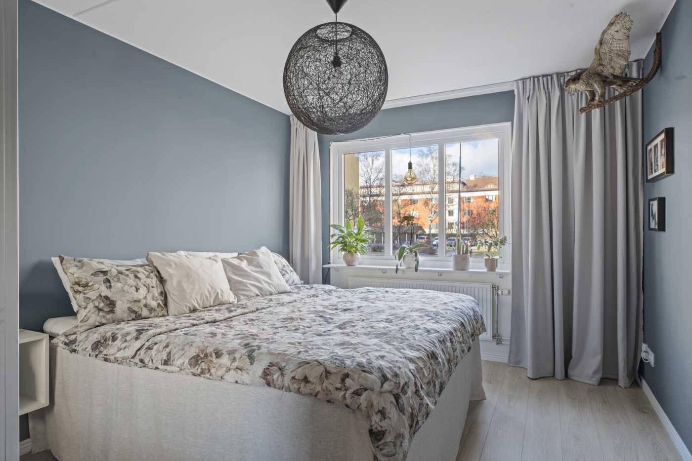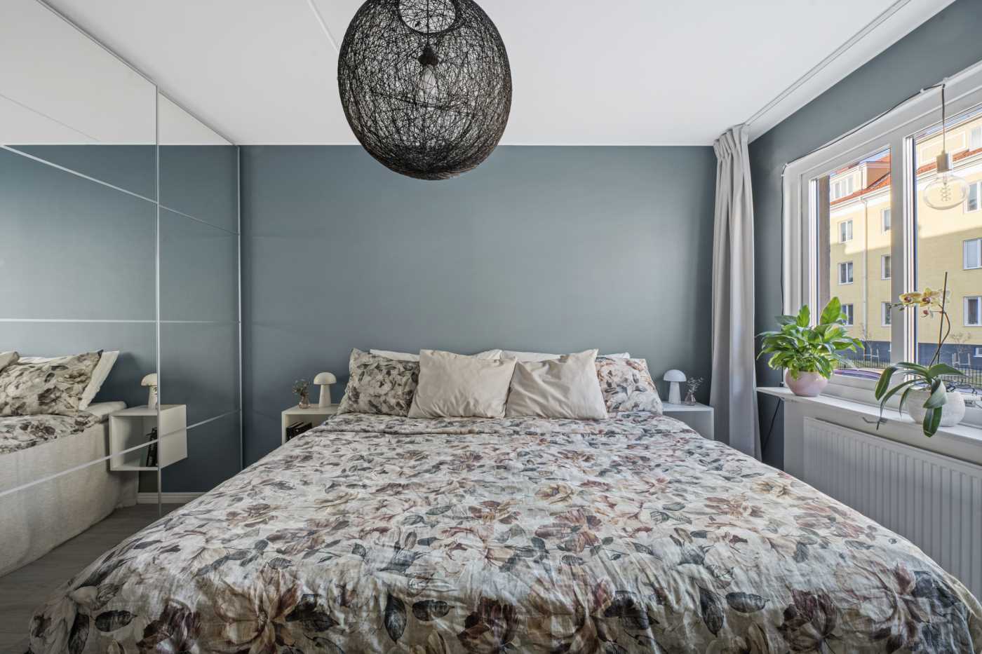 Stort trivsamt sovrum med fint ljusinsläpp via ett stort fönster och fin förvaring i skjutdörrsgarderob. Väggar målade i rogivande blågrå ton och grått vinylgolv av god kvalitet.