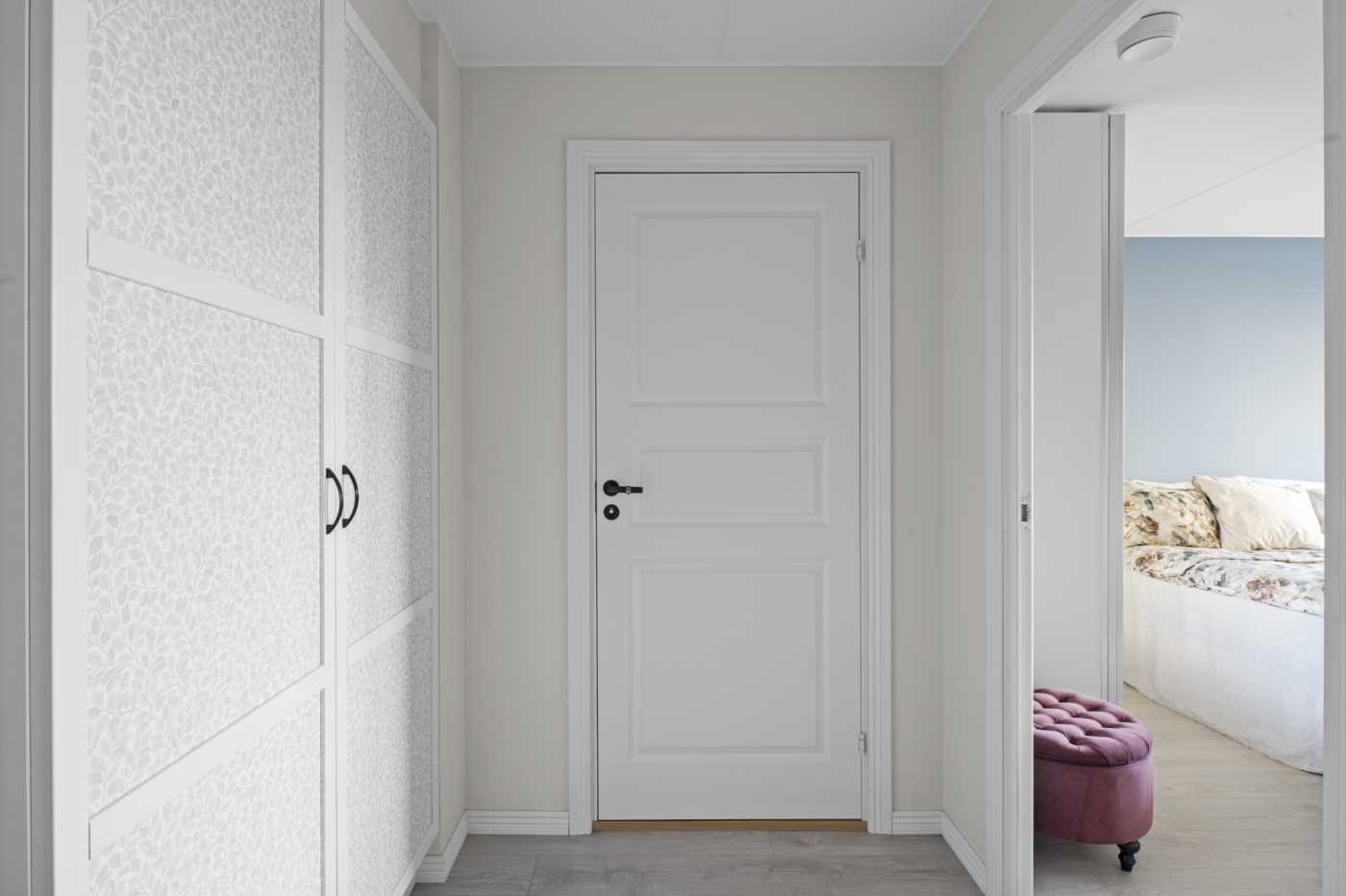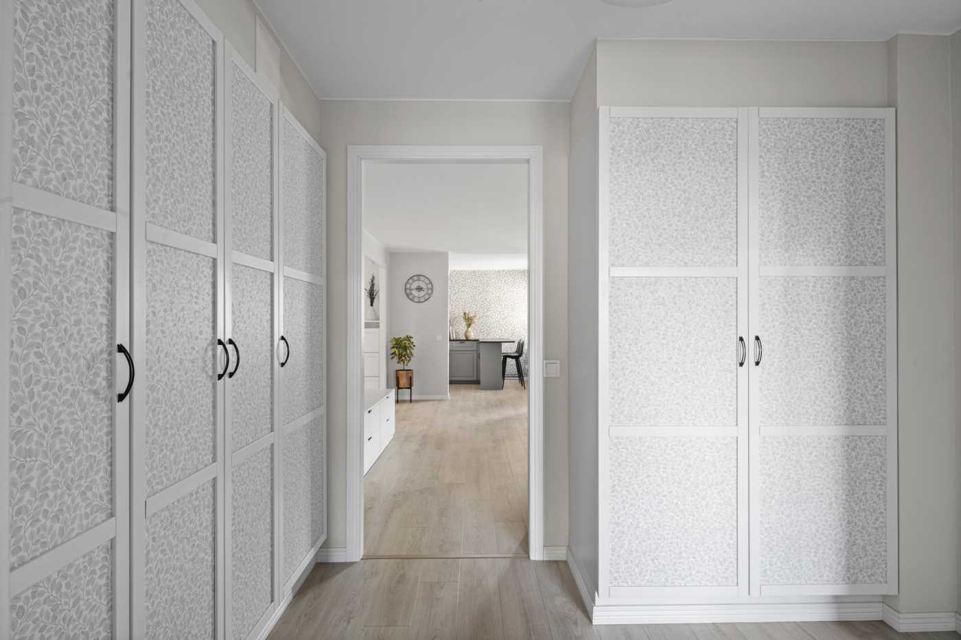 Välkomnande och rymlig entré med generöst med plats för avhängning i både väggkrokar och två platsbyggda garderober. Ljusa väggar och grått vinylgolv av god kvalitet.