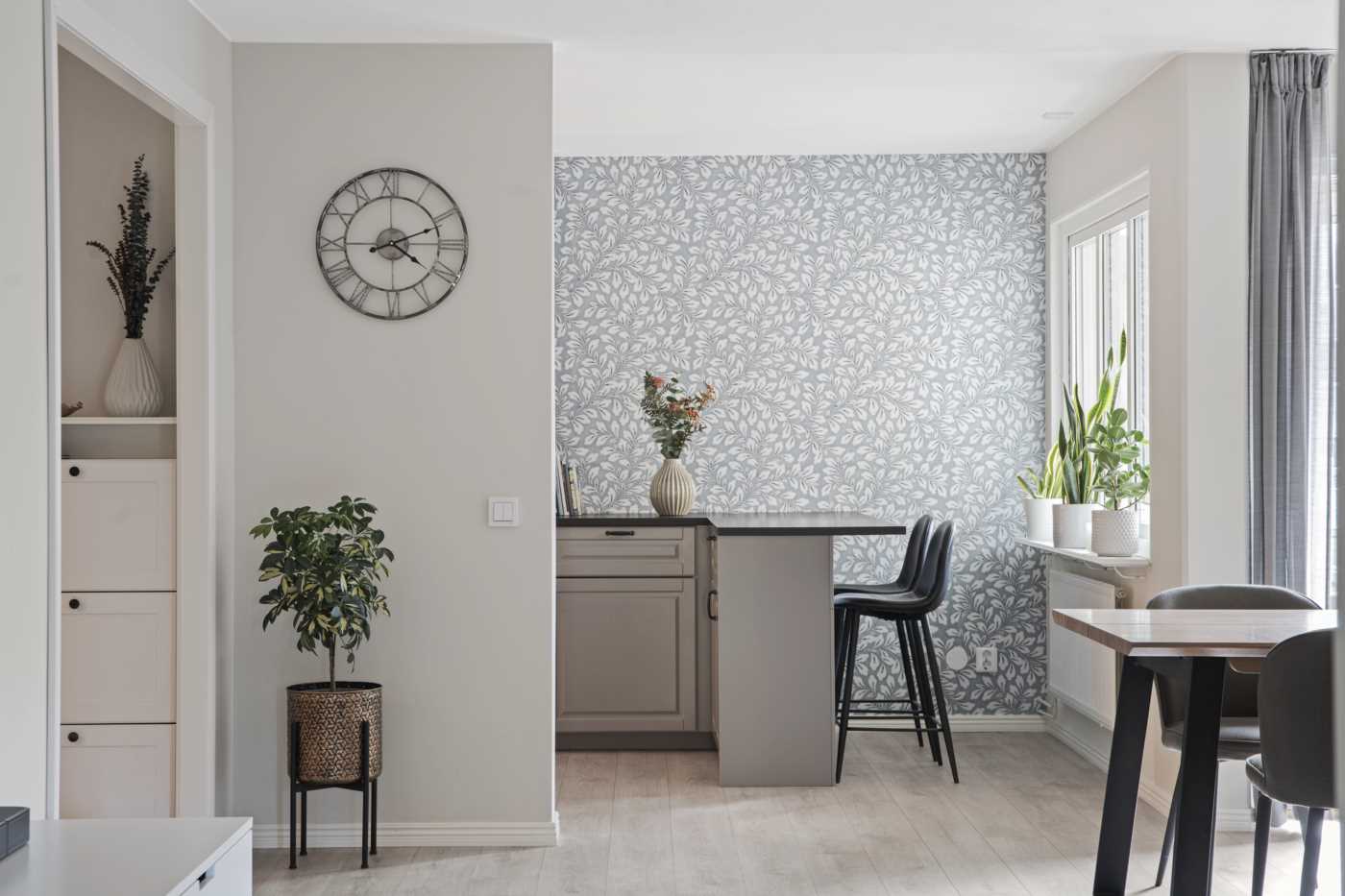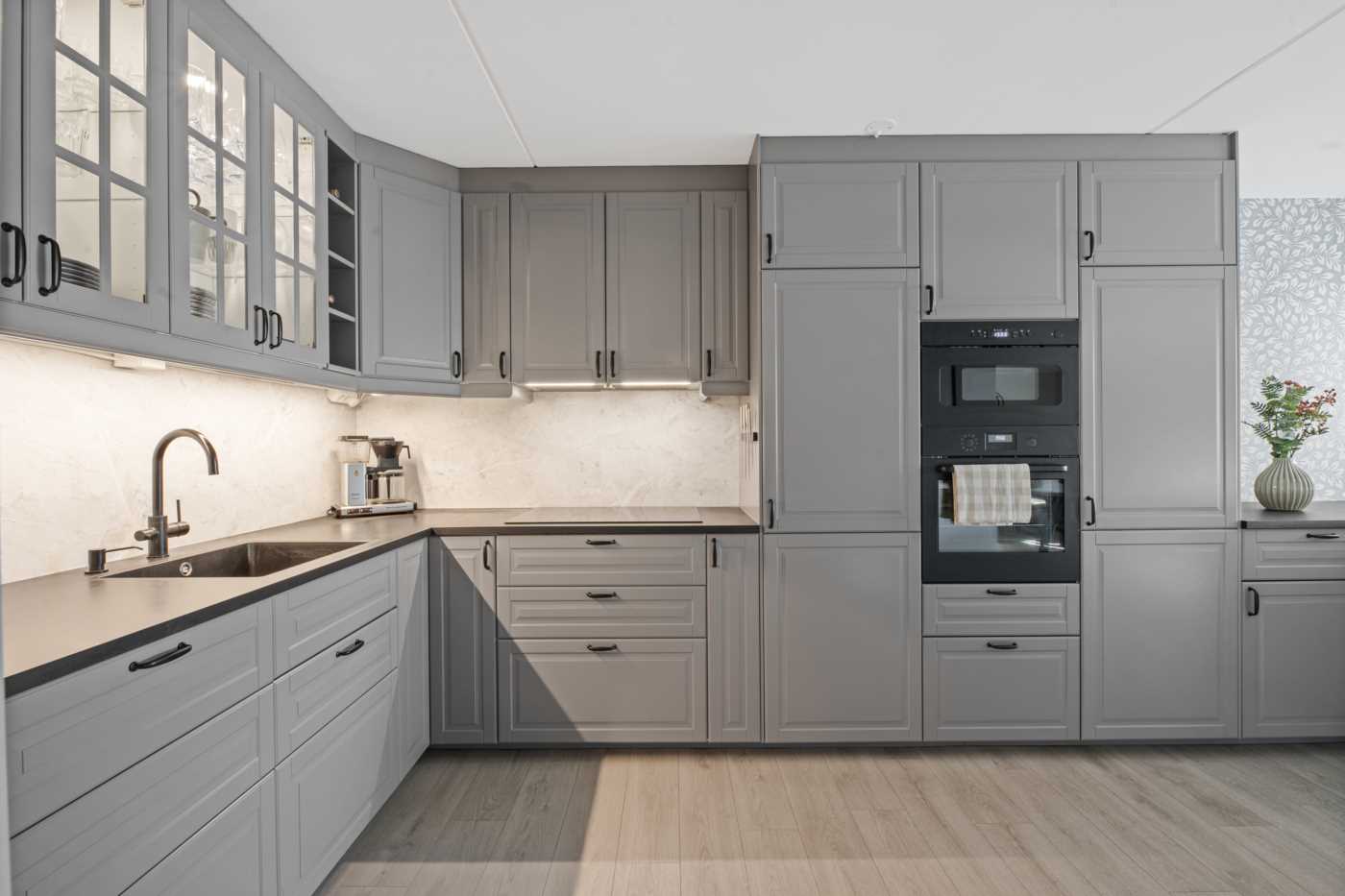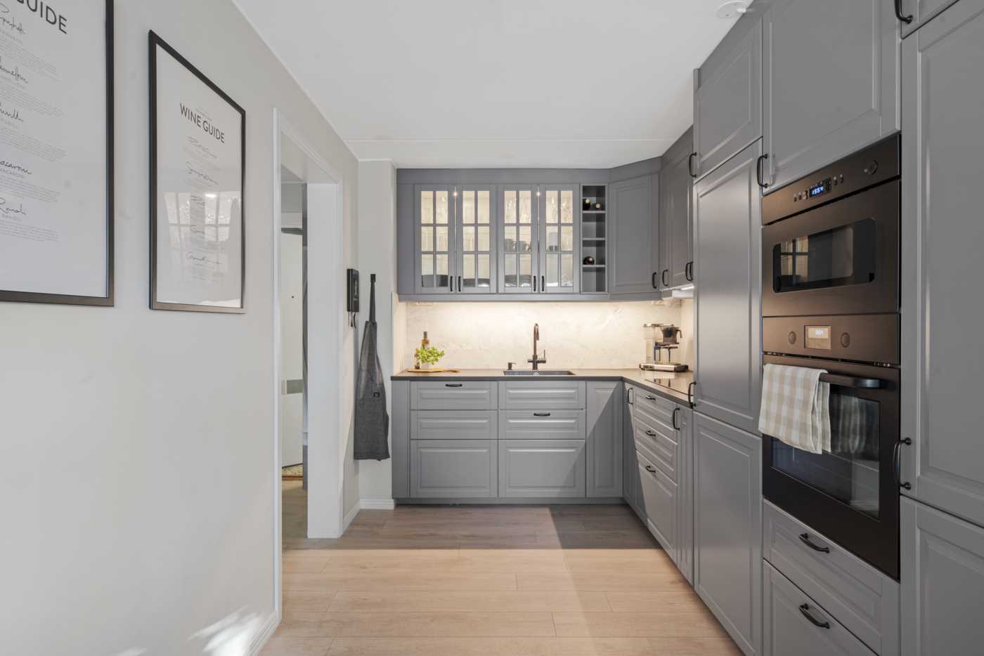 Trevligt kök helrenoverat 2022 med klassisk köksinredning från IKEA i grått med svarta arbetsbänkar i laminat, här finns en köksö i vinkel men fin extra arbetsyta och sittplats för två. Från köksön har man via en större öppning fin kontakt med det stora vardagsrummet där matplatsen med plats för stora sällskap finns i direkt anslutning till köket. Köket har ljusinsläpp via ett stort fönster, mönstrad tapet och grått vinylgolv av god kvalitet.