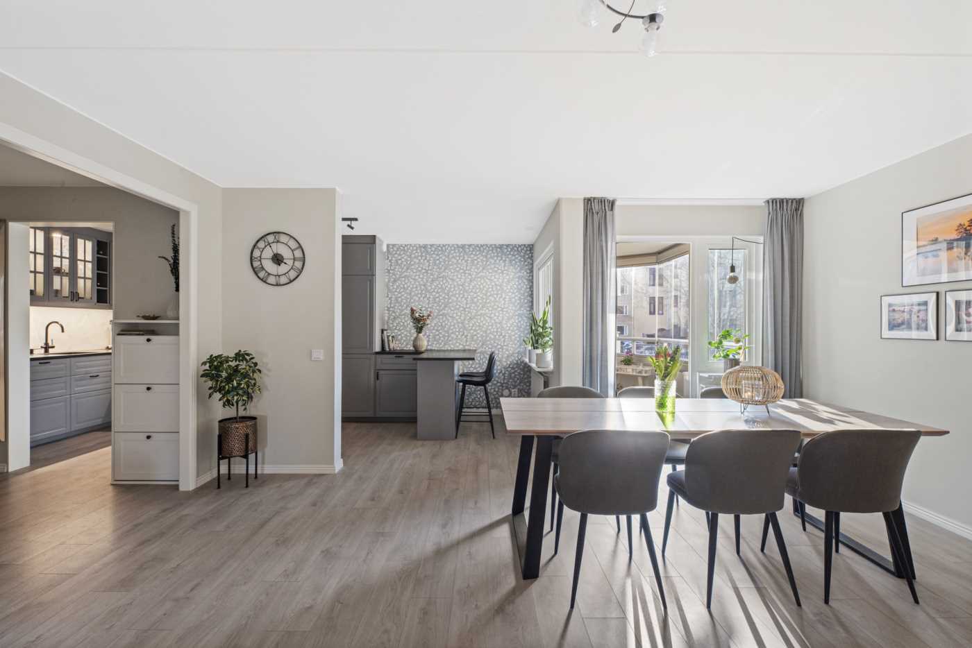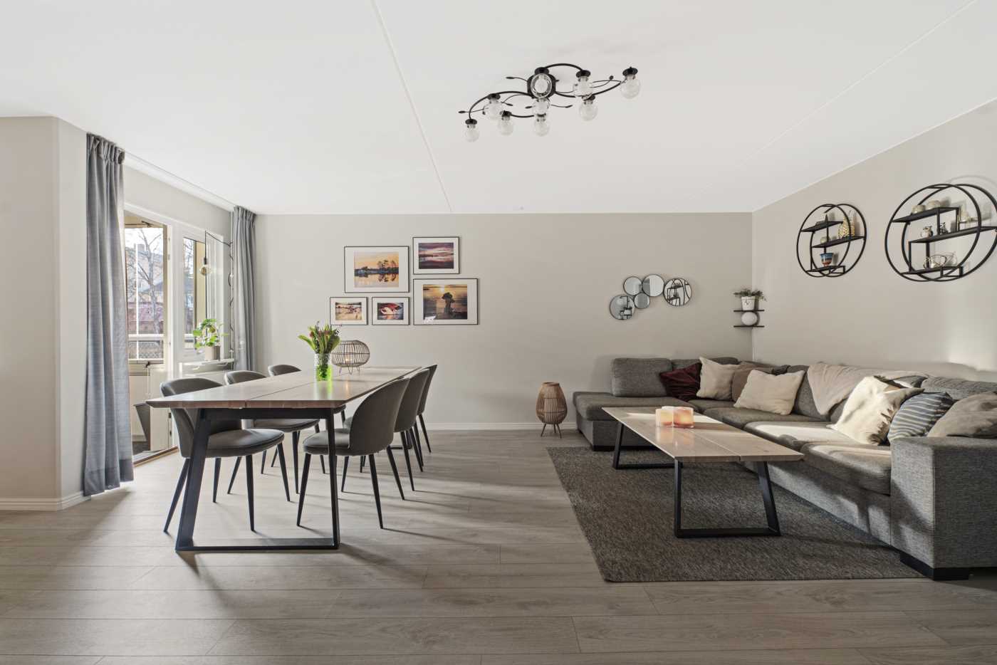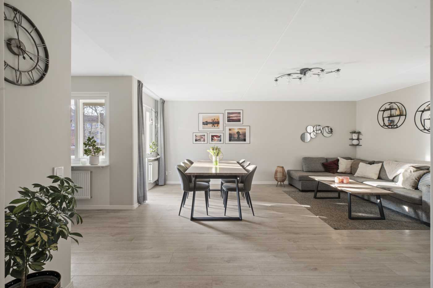 Stort vardagsrum med generös plats för både soff- och matgrupp. Från vardagsrummet är det en större öppning mot köket och fönsterpartiet har en halvglasad dörr som leder ut till den inglasade balkongen. Fint målade ljust gråbeige väggar och grått vinylgolv av god kvalitet.
