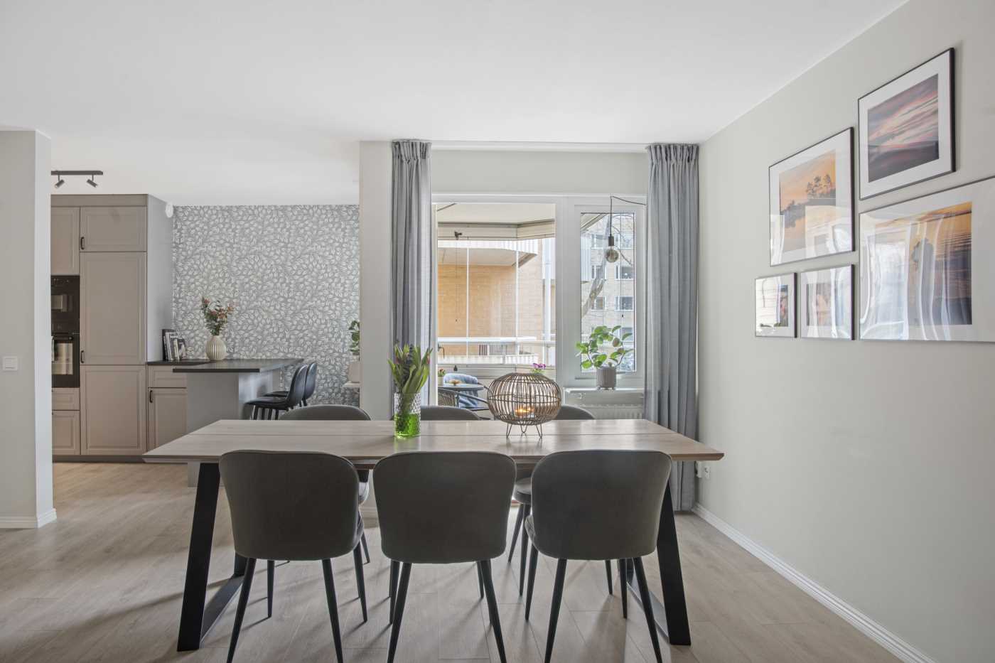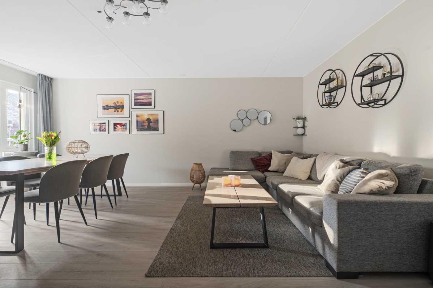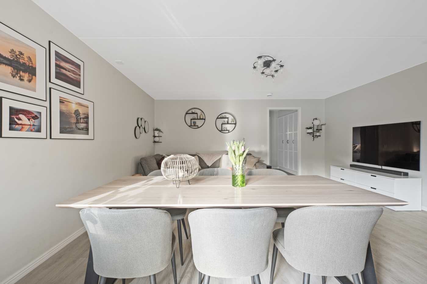 Stort vardagsrum med generös plats för både soff- och matgrupp. Från vardagsrummet är det en större öppning mot köket och fönsterpartiet har en halvglasad dörr som leder ut till den inglasade balkongen. Fint målade ljust gråbeige väggar och grått vinylgolv av god kvalitet.