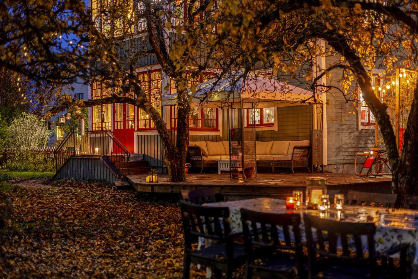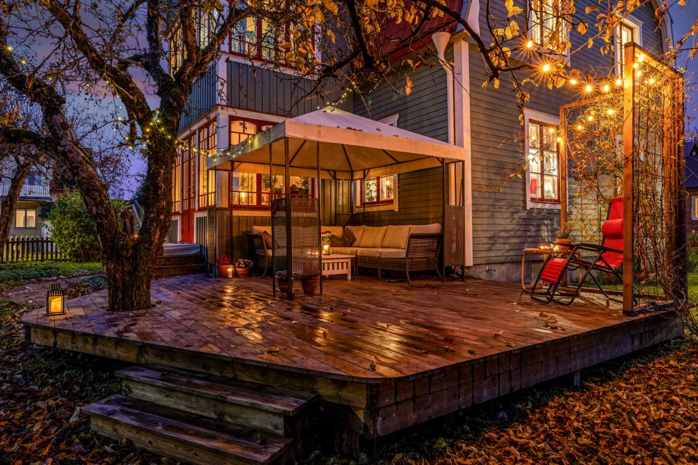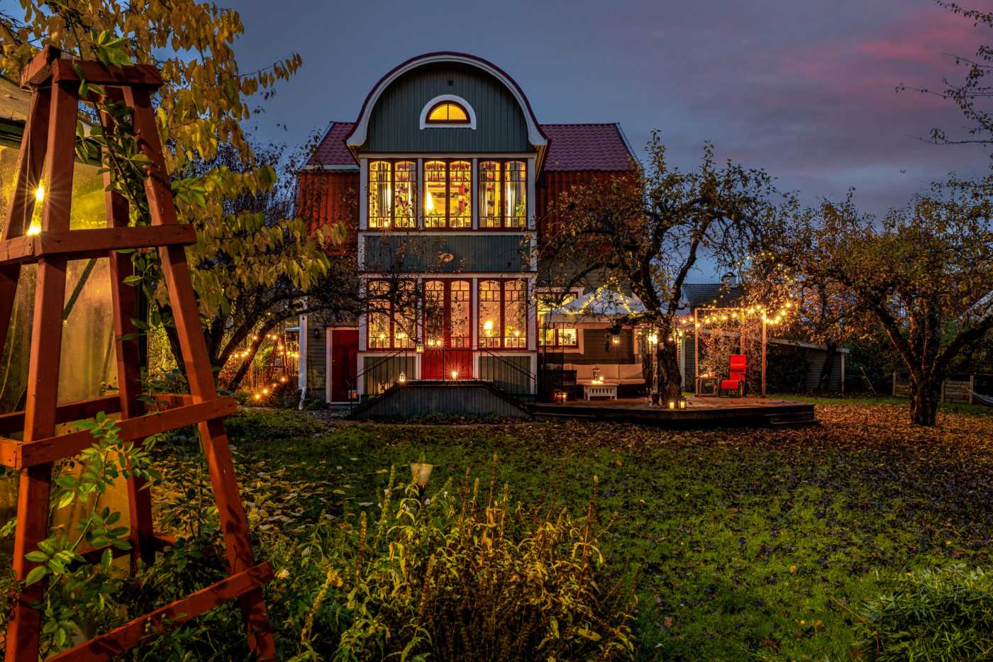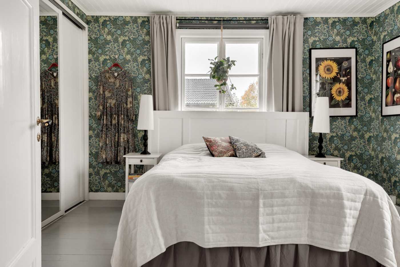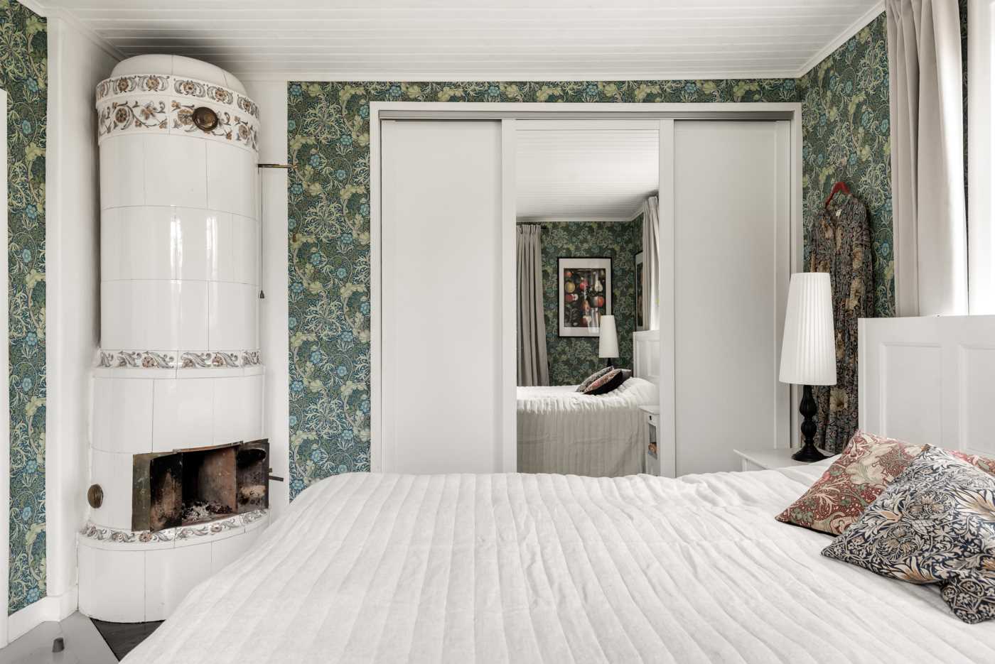 En trappa upp väntar två ljusa och väl tilltagna sovrum, ett helkaklat badrum och ett allrum med access till glasveranda med ett rofyllt litet bibliotek. På den inredda vinden finns en egen våning med sovrum/allrum – perfekt för tonåringen eller arbetsyta.
