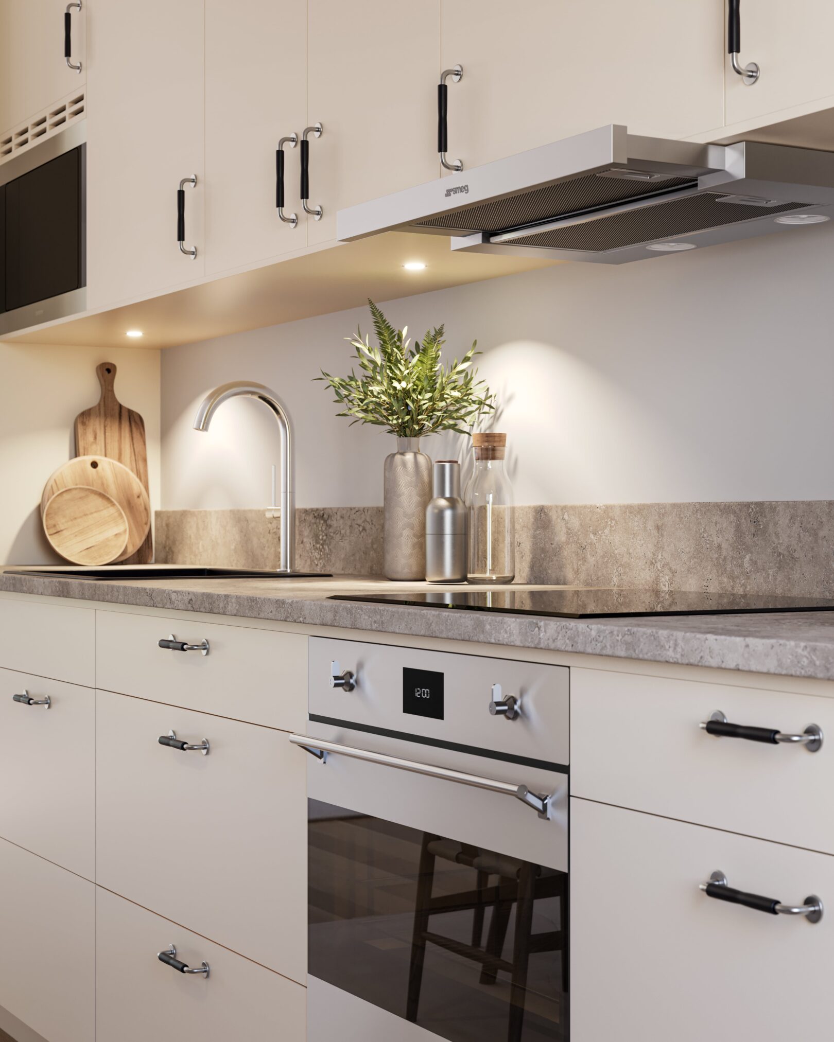 Köket är modernt och stilrent med fokus på både design och funktionalitet, optimerat för matlagning i kombination med socialt umgänge genom den öppna planlösningen.