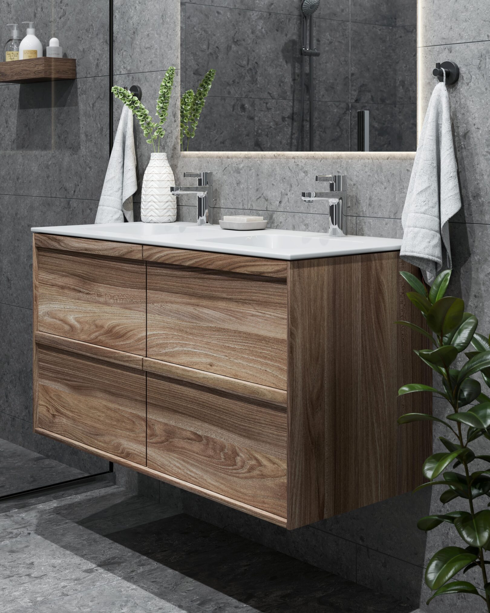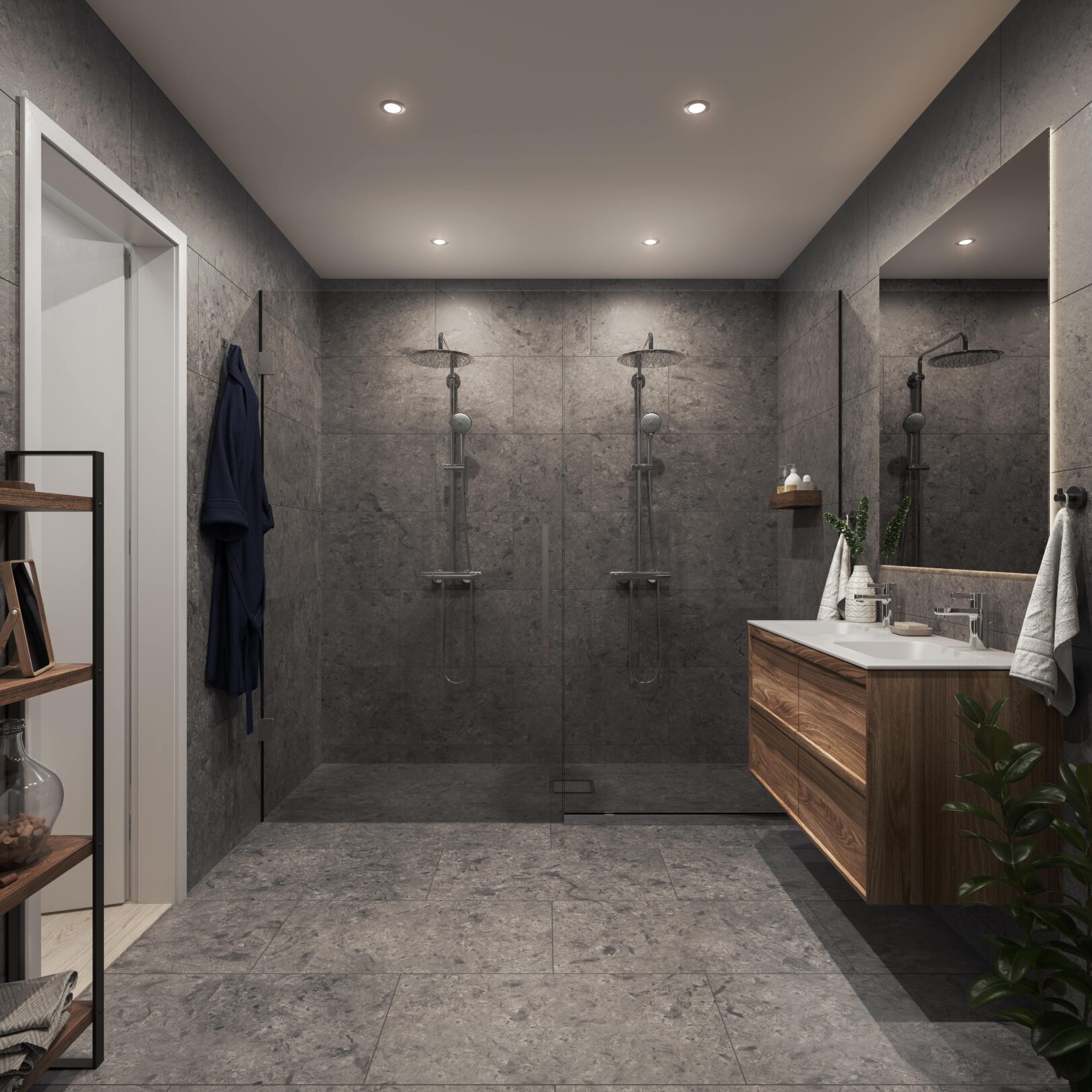 Badrummen genomsyras av noggrant utvalda material. Här erbjuds Norrvange kakel och klinkers som standard.